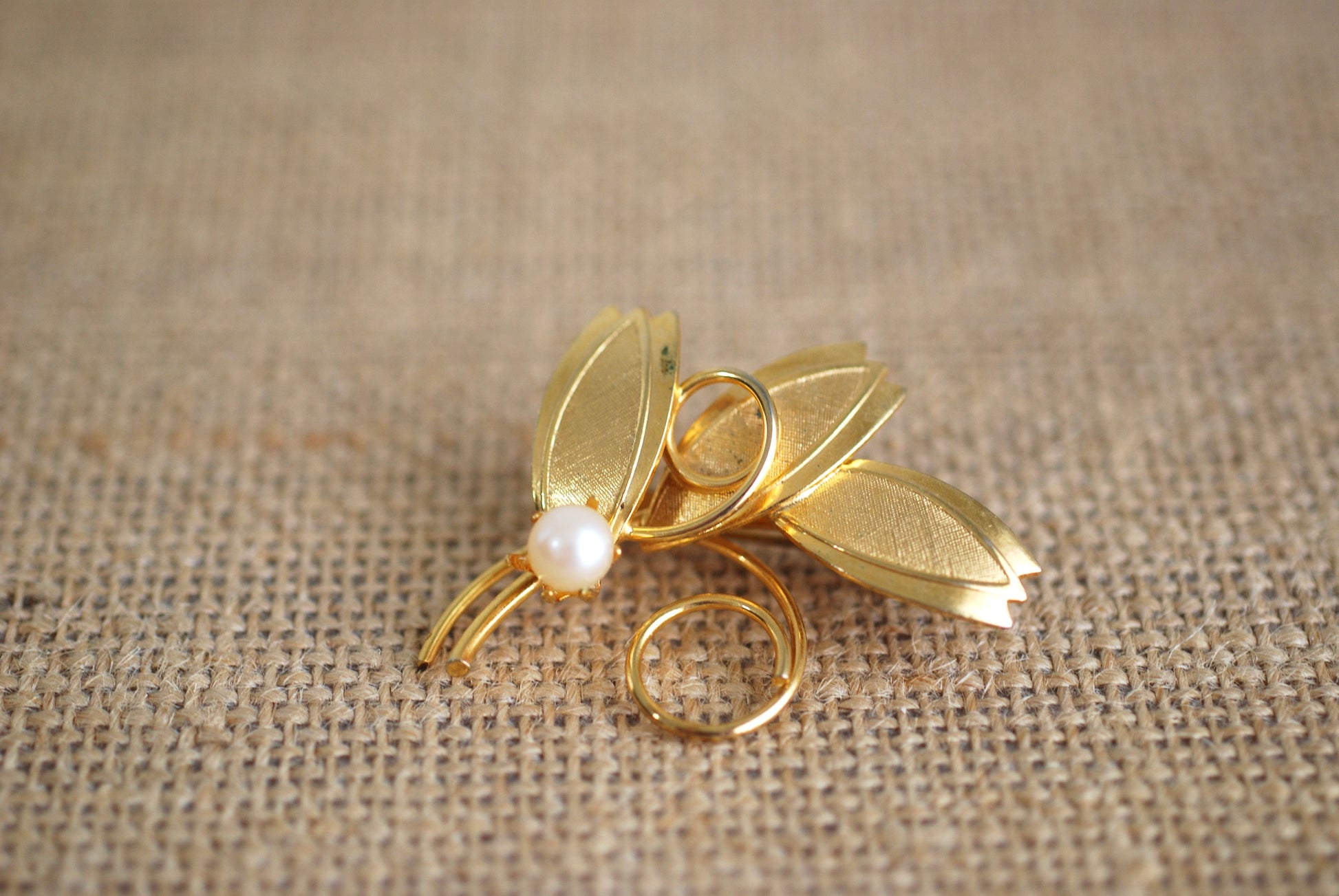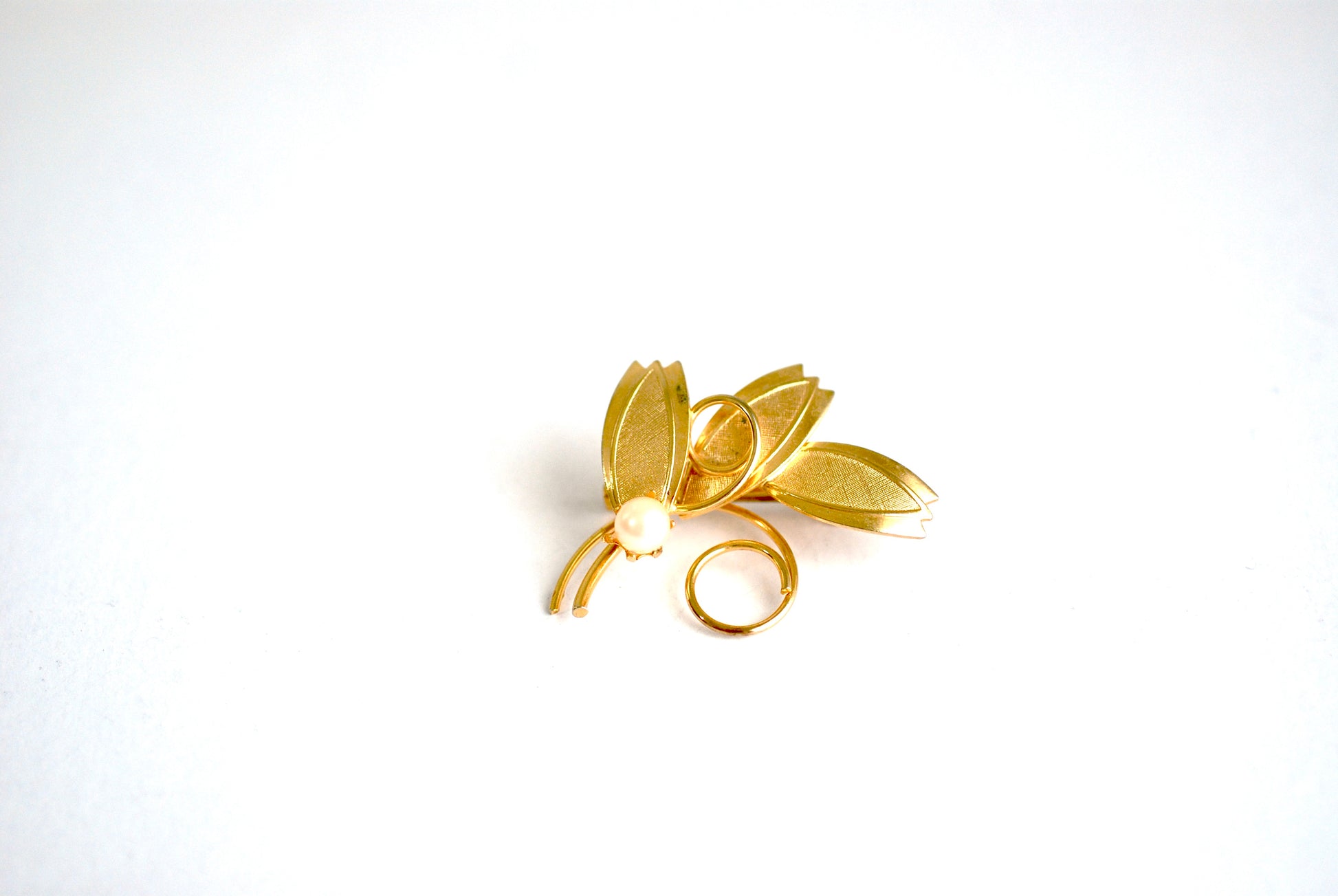 A lovely vintage brooch in gold tone metal with a single pearl. Features three leaves with brushed and shiny finishes, a couple of swirled flourishes and a single prong set pearl.