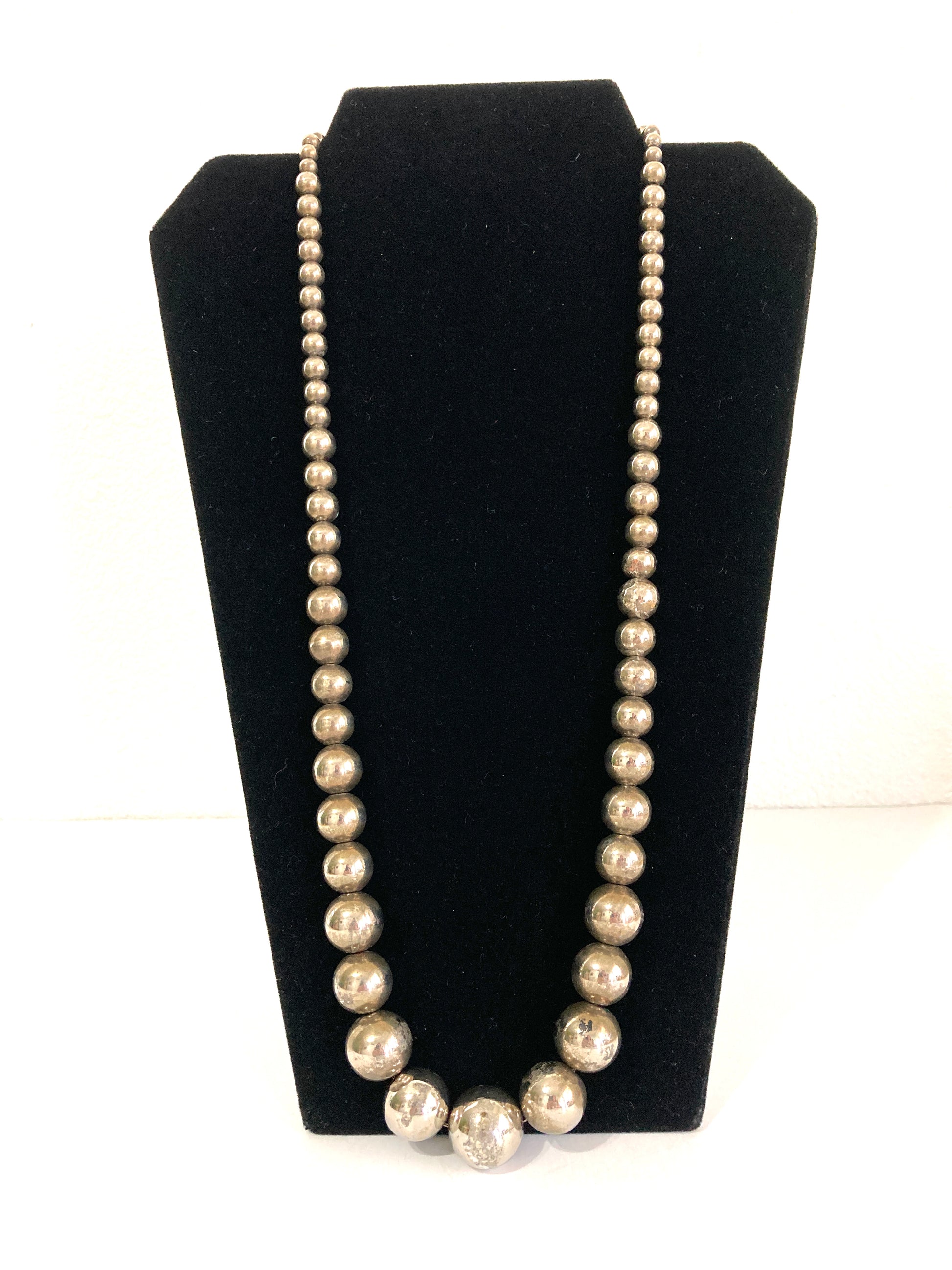 Graduated silver metal balls strung on a silver metal chain. A great stand-in for sterling silver at an affordable price. This necklace is long and lightweight. It has a wonderful patina as it has been loved and aged over the years. A great necklace for a casual look. Wear it with a blouse or t-shirt or dress it up. 30 inches long.