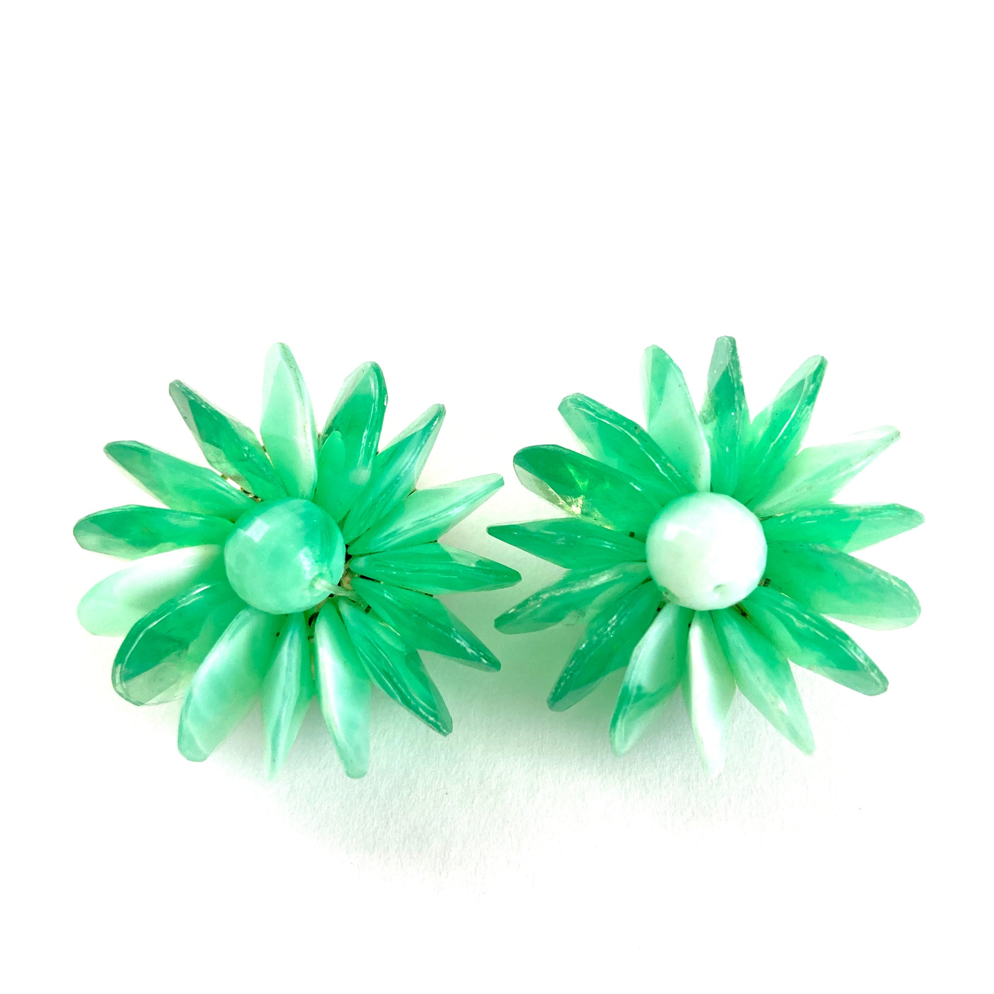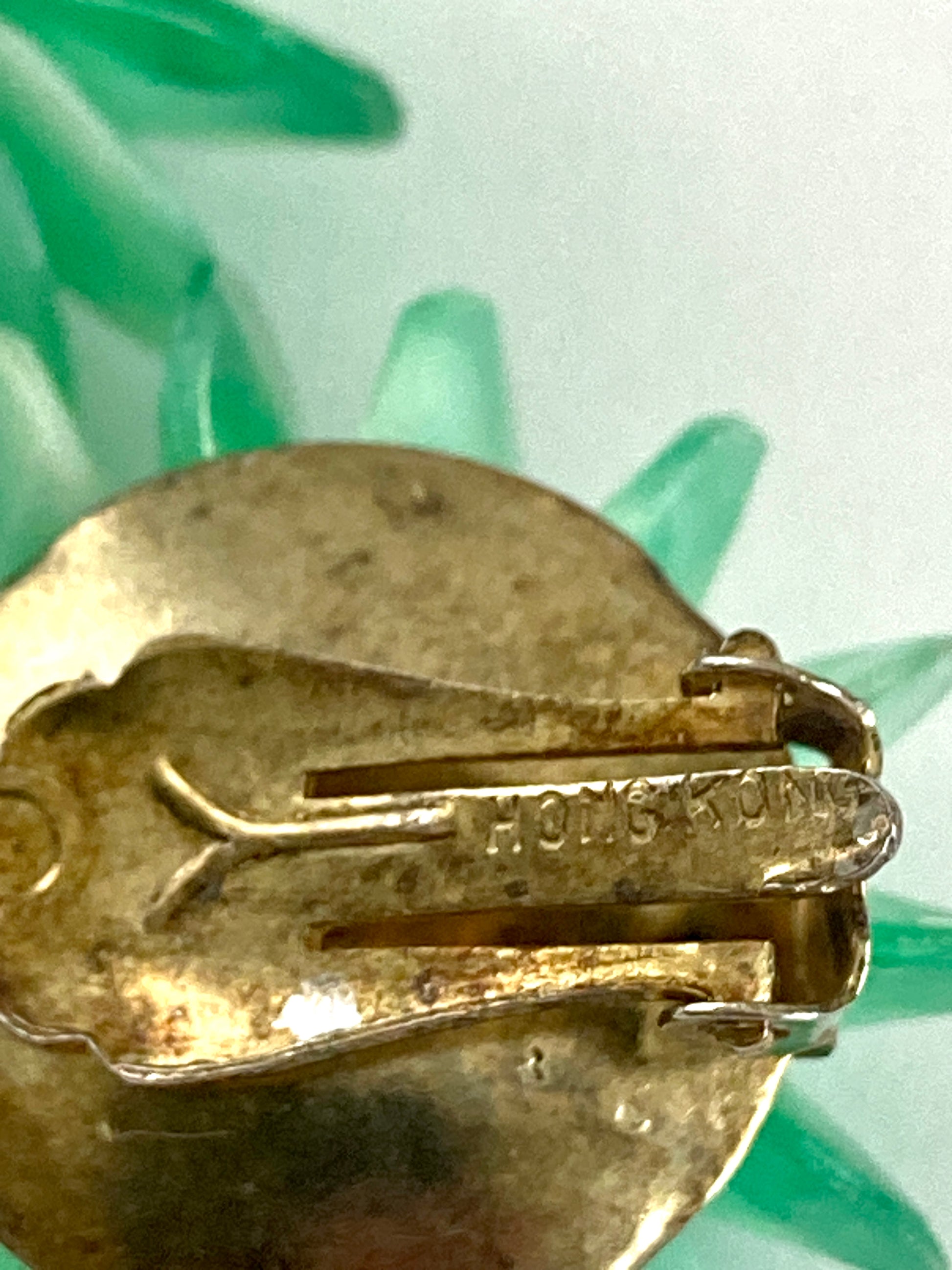 These unusual flower-shaped beaded earrings in shades of green are so fun. The centers feature a mottled faceted round plastic bead and the surrounding petals are made of matching discs. set on brass clip-on backs each is stamped Hong Kong on the back. The clasps work perfectly but do show some discoloration due to age.