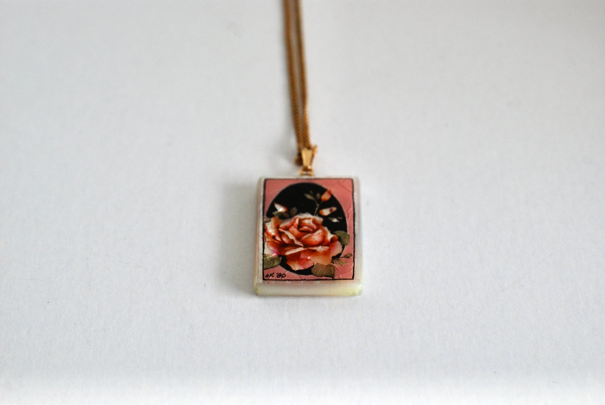This beautiful hand-painted rose pendant is signed by the artist and dated 80. The back retains its original sticker marked 14k An Authentic Hand Painting 1977 Polynesian Artifacts P.O. Box 25703 Honolulu, Hawaii. Painted on a rectangular piece of polished mother of pearl and sealed with a clear sealer. It hangs from a 24" gold filled chain. The rose is painted in shades of peach on a black and pink background. The clear coat shows signs of cracking due to age. A sweet vintage Hawaiian souvenir.