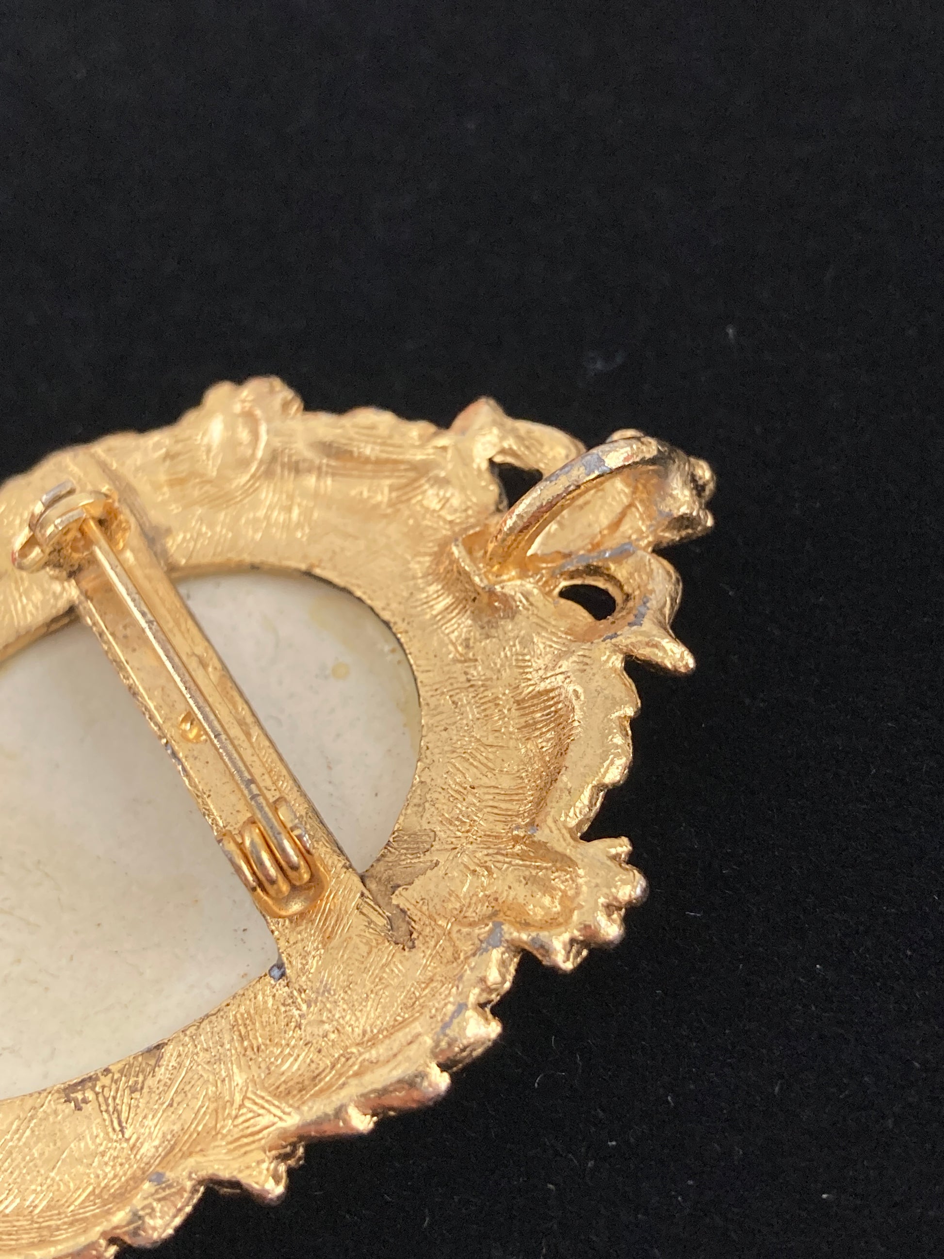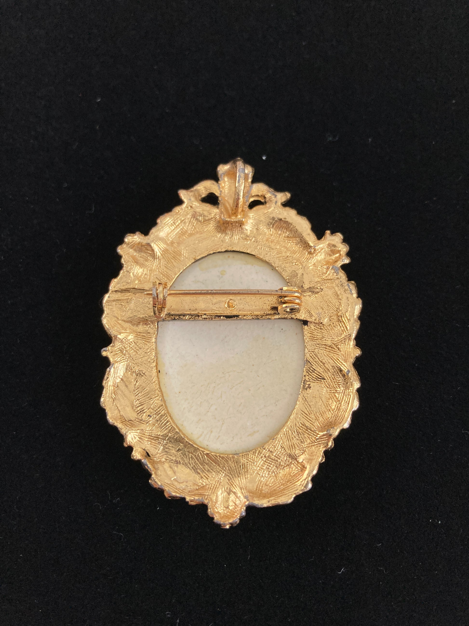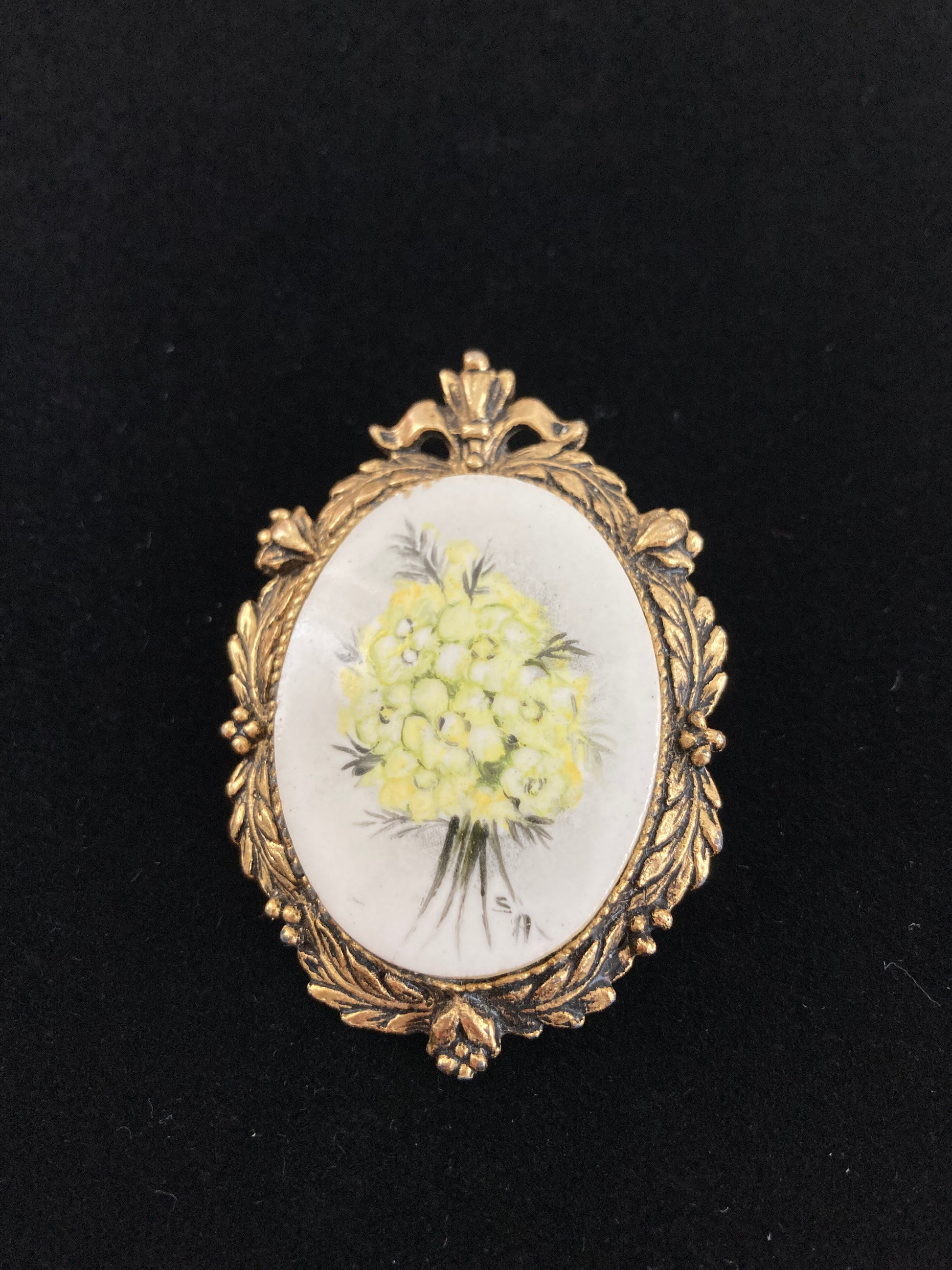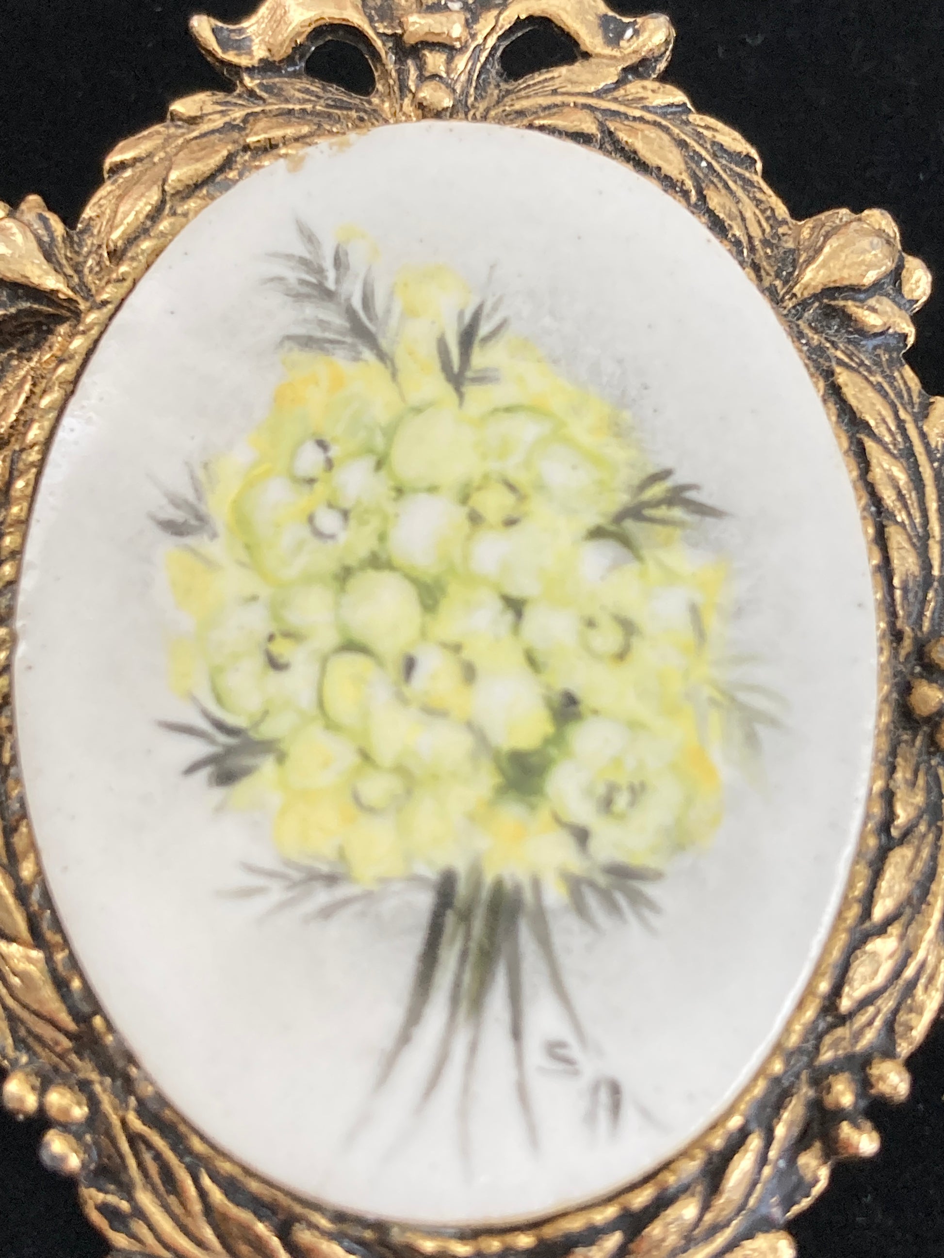 A lovely spring bouquet painted in pale yellow and dark grey set on a laurel leaf decorated brass frame. The delicate painting is signed SA in the lower right. The frame features both a pin clasp and a hidden bail so it can be worn either as a brooch or pendant. There are two very tiny chips on the top of the porcelain although they don't affect the beauty of the piece. Priced accordingly, however.