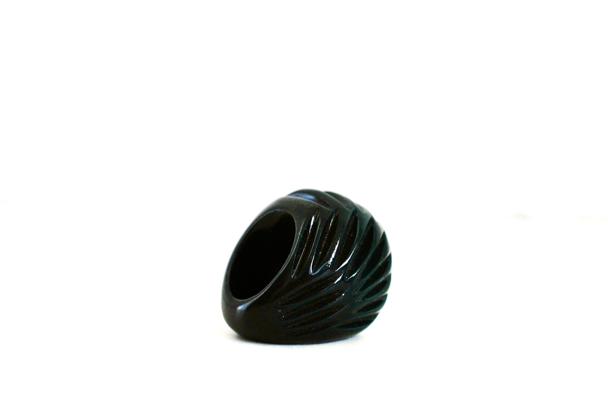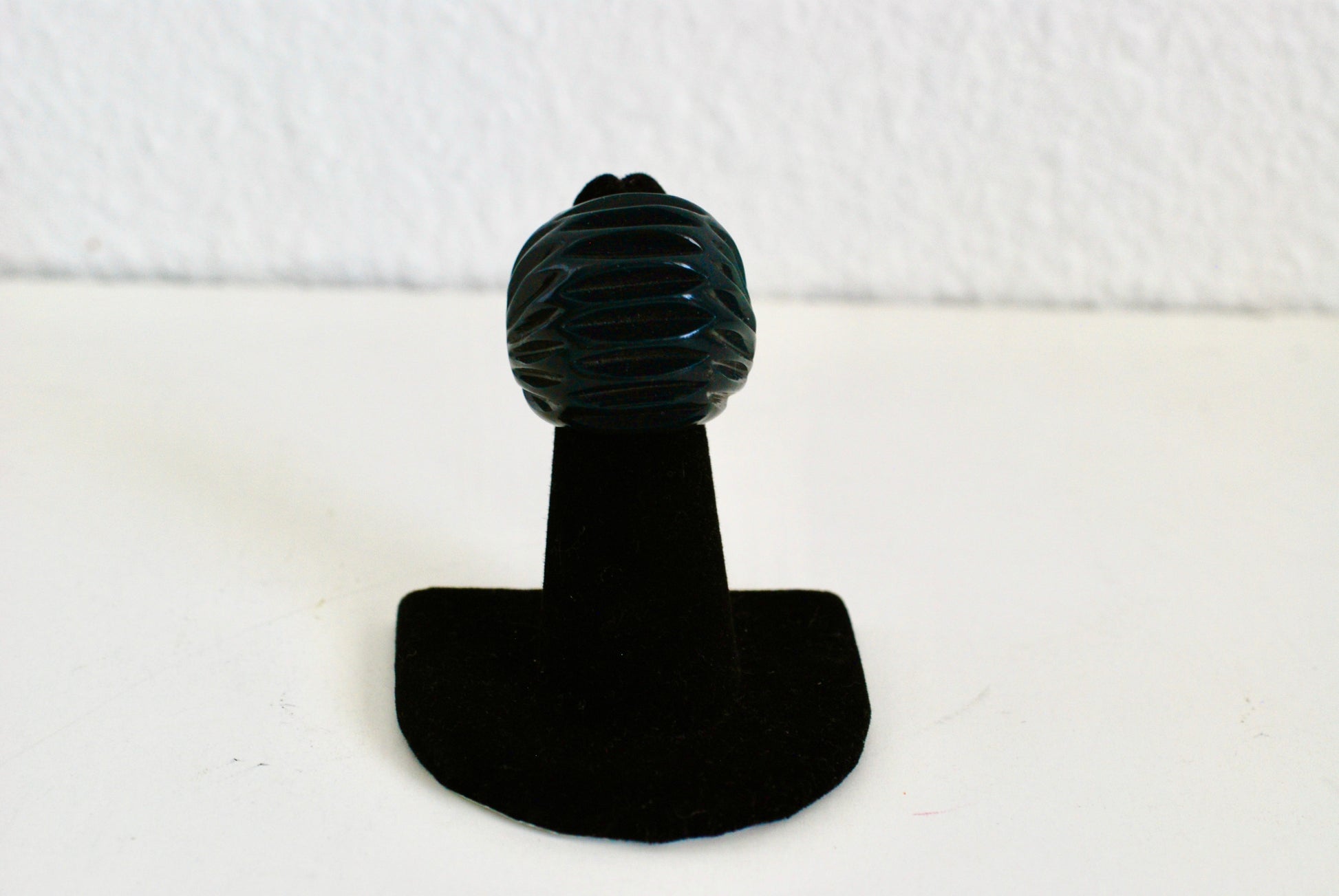 This is a real head turner. This huge chunky ring is made of carved plastic in deep forest green. It's a size 5 and will fit a smaller hand or thin fingers. As large as the ring is, it's very lightweight. Carved with multiple horizontal lines that cover everything except the very back of the ring. There are no markings on this piece.