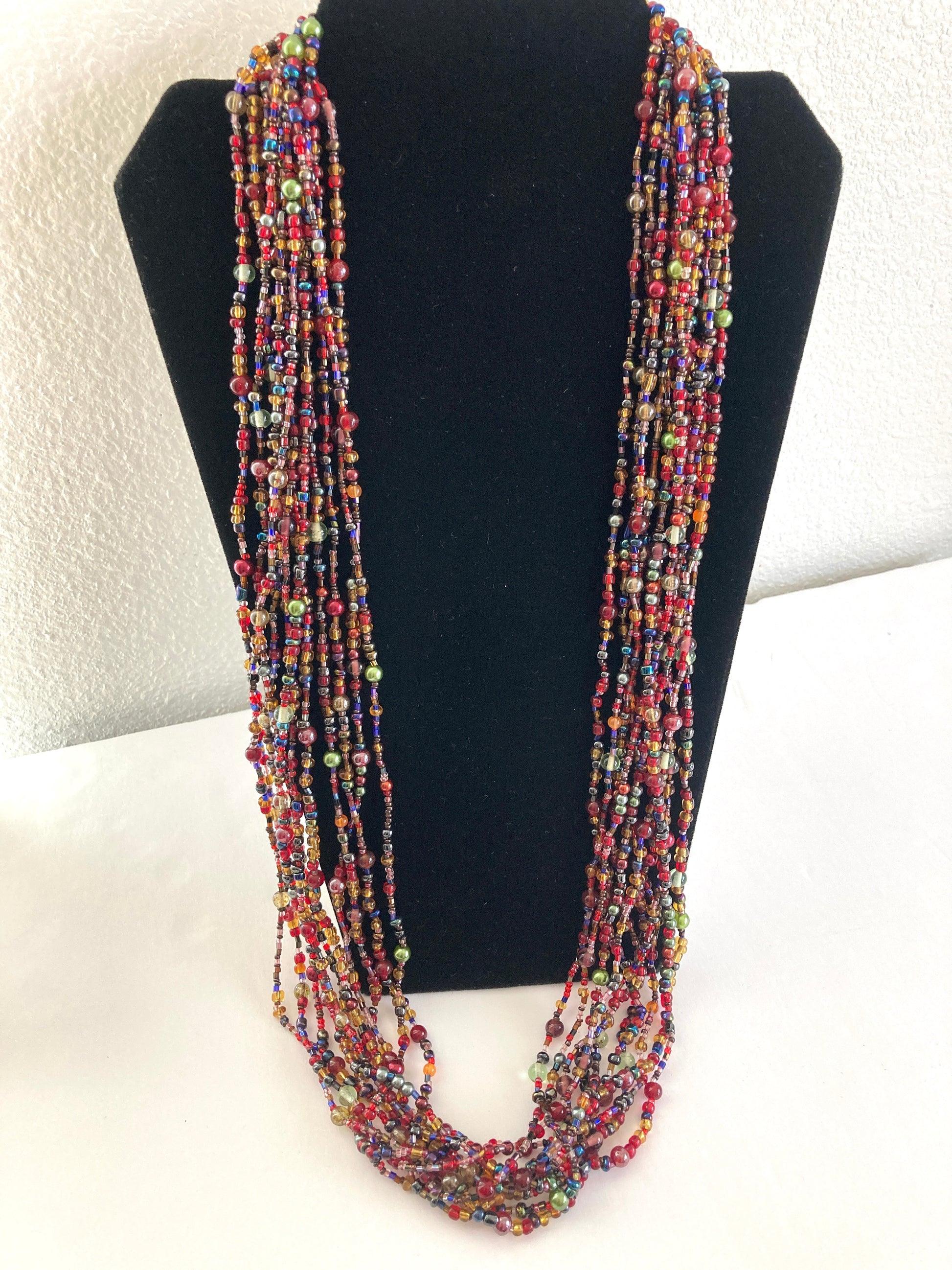 A very popular vintage Joan Rivers necklace in shades of berry red, gold, green, purple, and loads of other colors. This long torsade-style necklace can be worn in so many ways. Twist it up, double it, knot it, layer it, etc. The Czech glass beads are beautifully bright and shiny and reflect the light so well. Features gold-tone metal ends and closure. An absolutely stunning necklace, no wonder it's so popular. Comes in the original velvet bag.