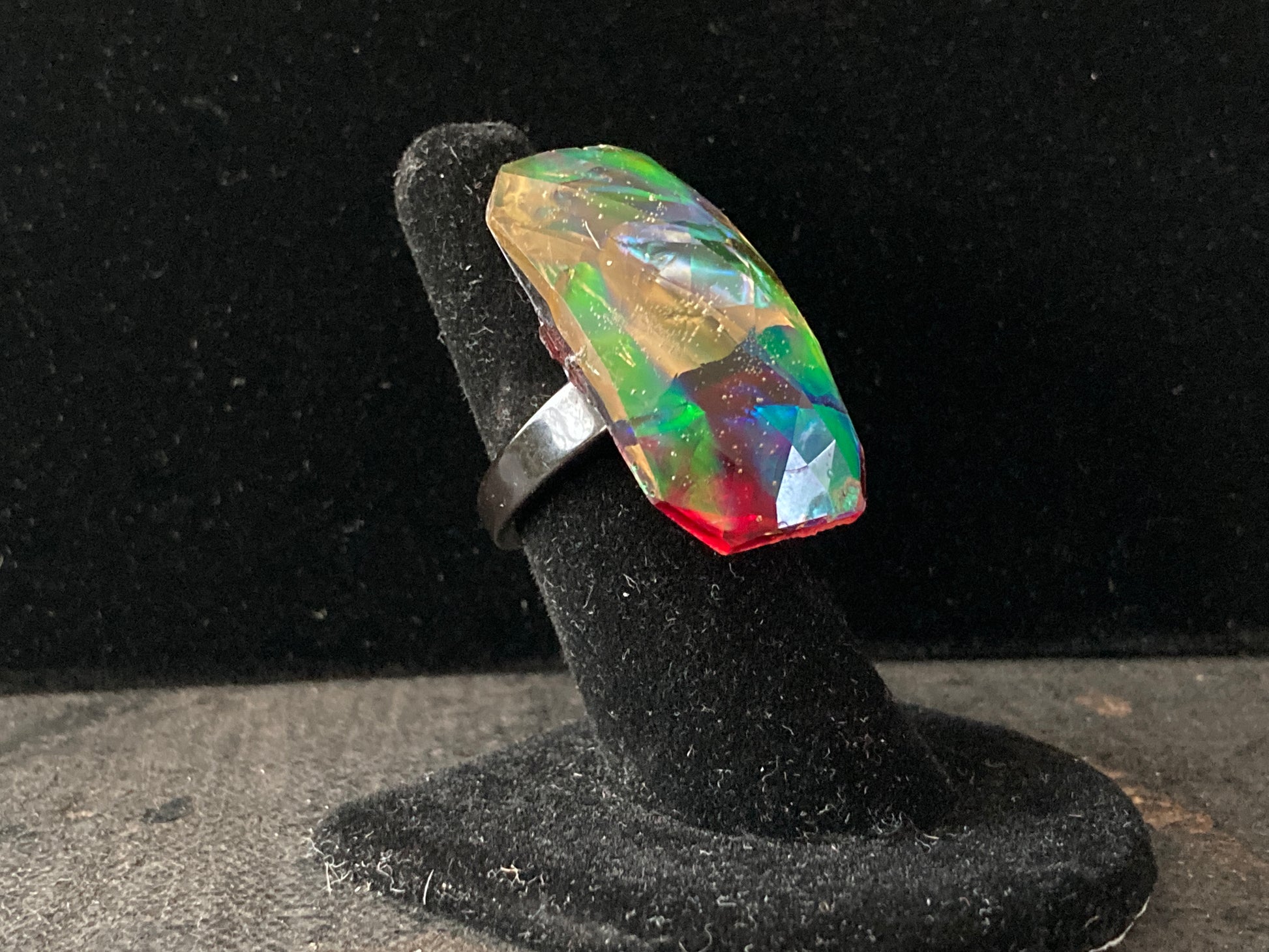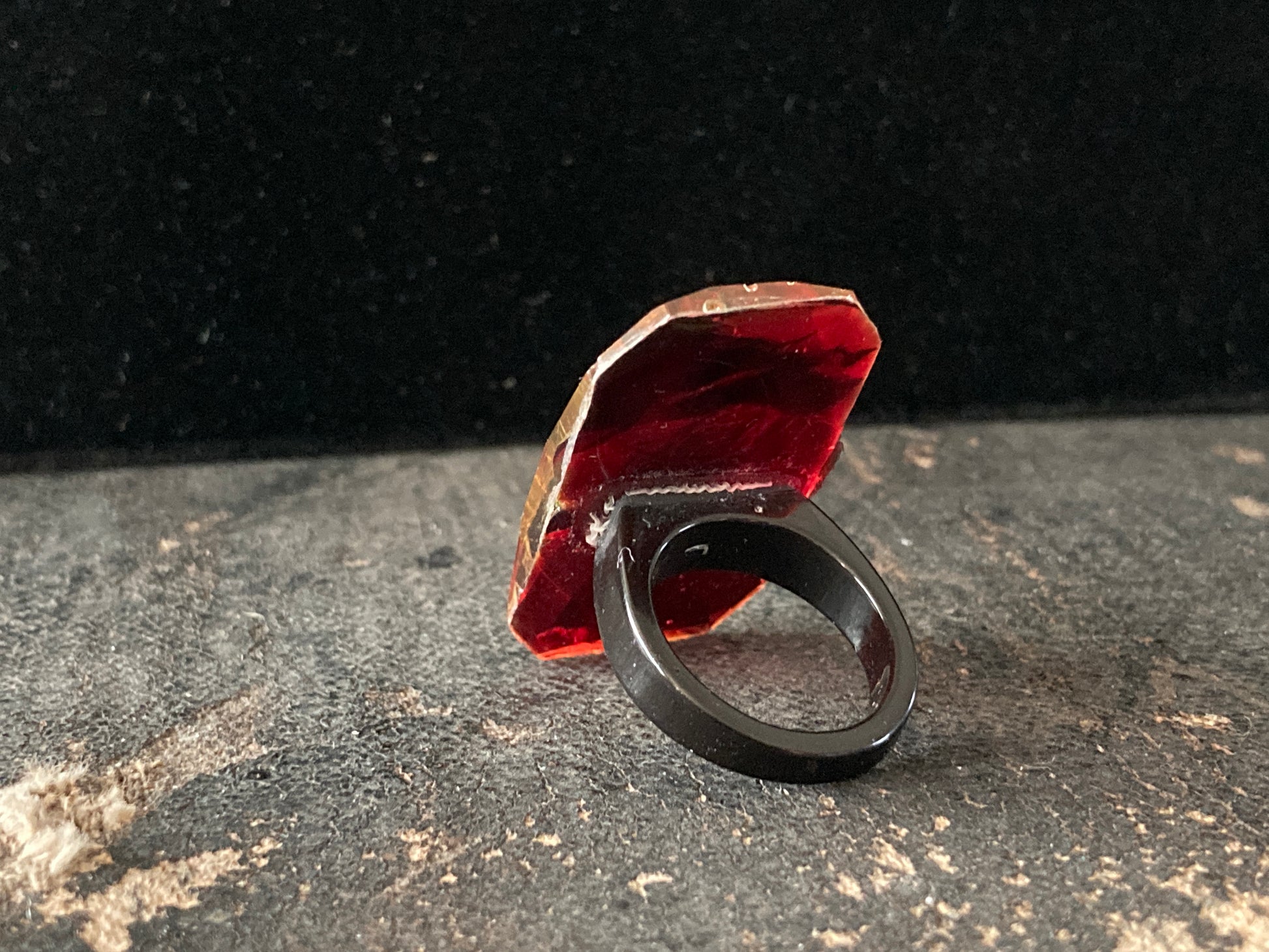 This huge attention-grabbing ring is a great way to start a conversation. Light as a feather while being big, bold, and colorful. Made of poured resin in a large faceted emerald shape with encased dichroic film. The face of the ring is set on a blood-red background with a black resin band. Fits a