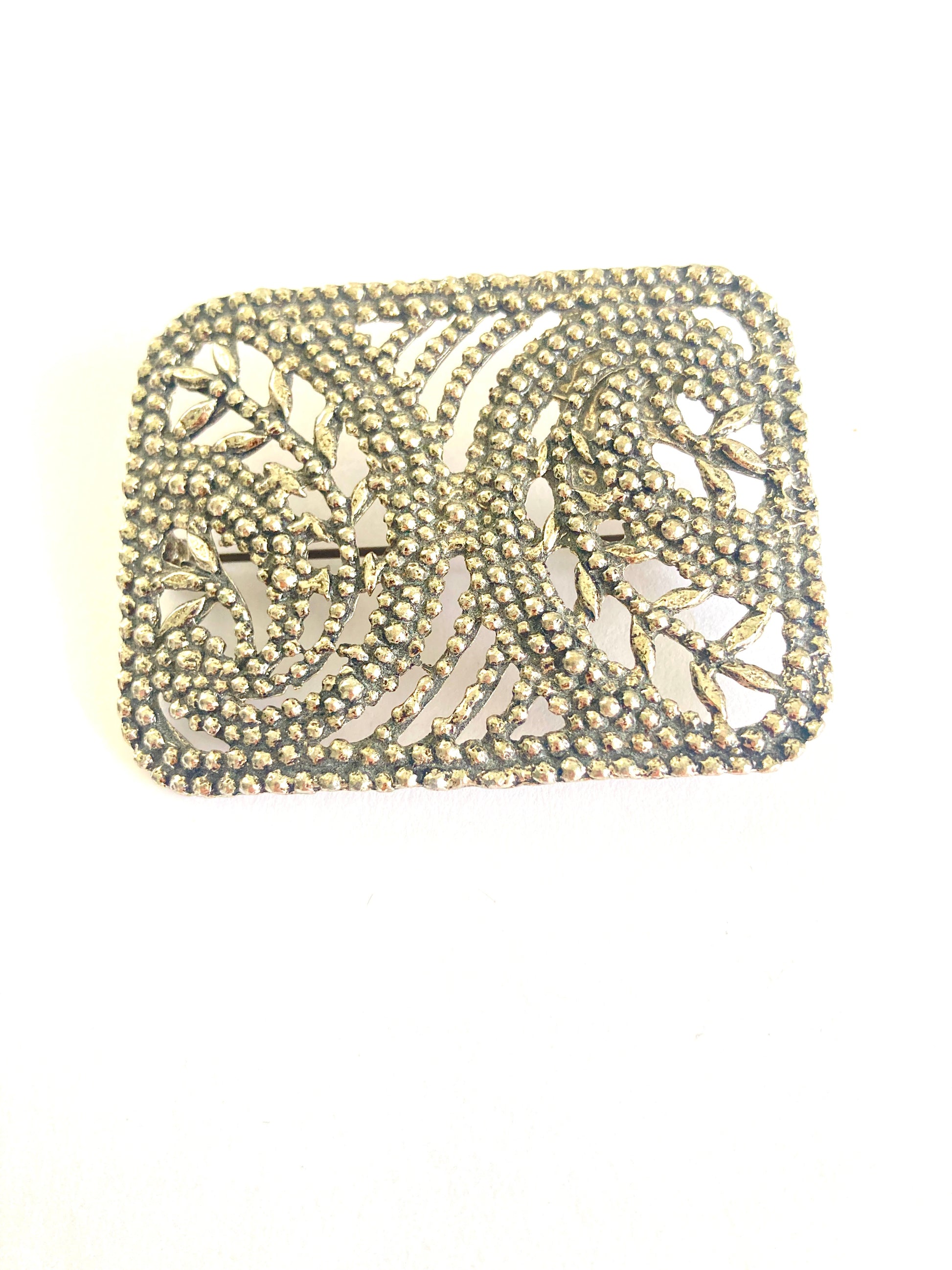 Large rectangular faux cut steel brooch. Molded pot metal made to look like cut steel. This sturdy brooch features swirls and leaves and has a substantial weight. Closes with a roll over clasp.