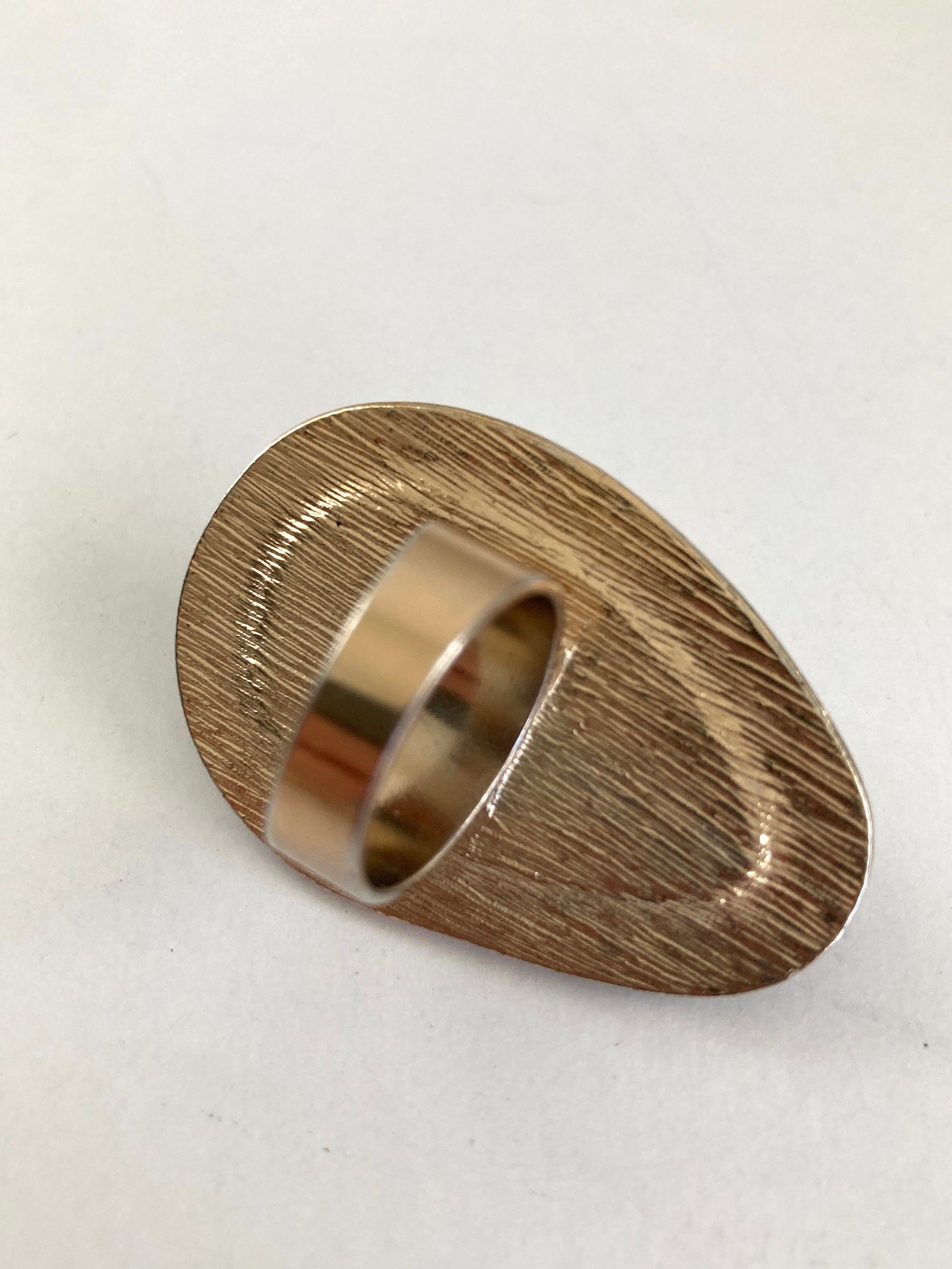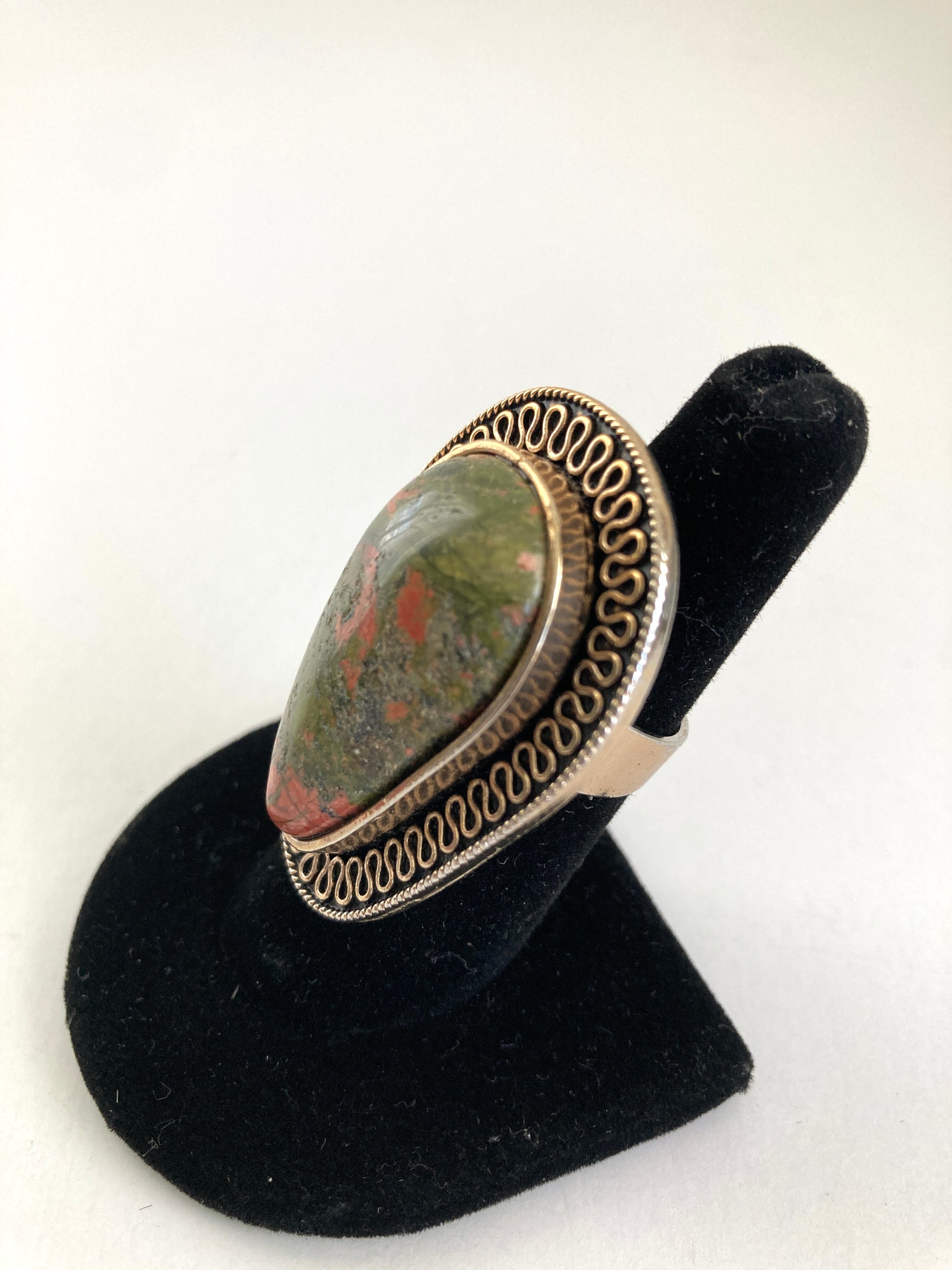 A single extra-large pink and green stone is the highlight of this ring. For fans of large jewelry, this is a fabulous find. The oversized teardrop shape stone is polished and sits in a gold-tone burnished metal setting. There is a wide flat band surrounding the plain bezel which features a curved back and forth pattern. The back of the ring has a textured gold tone unmarked base and a plain wide band.