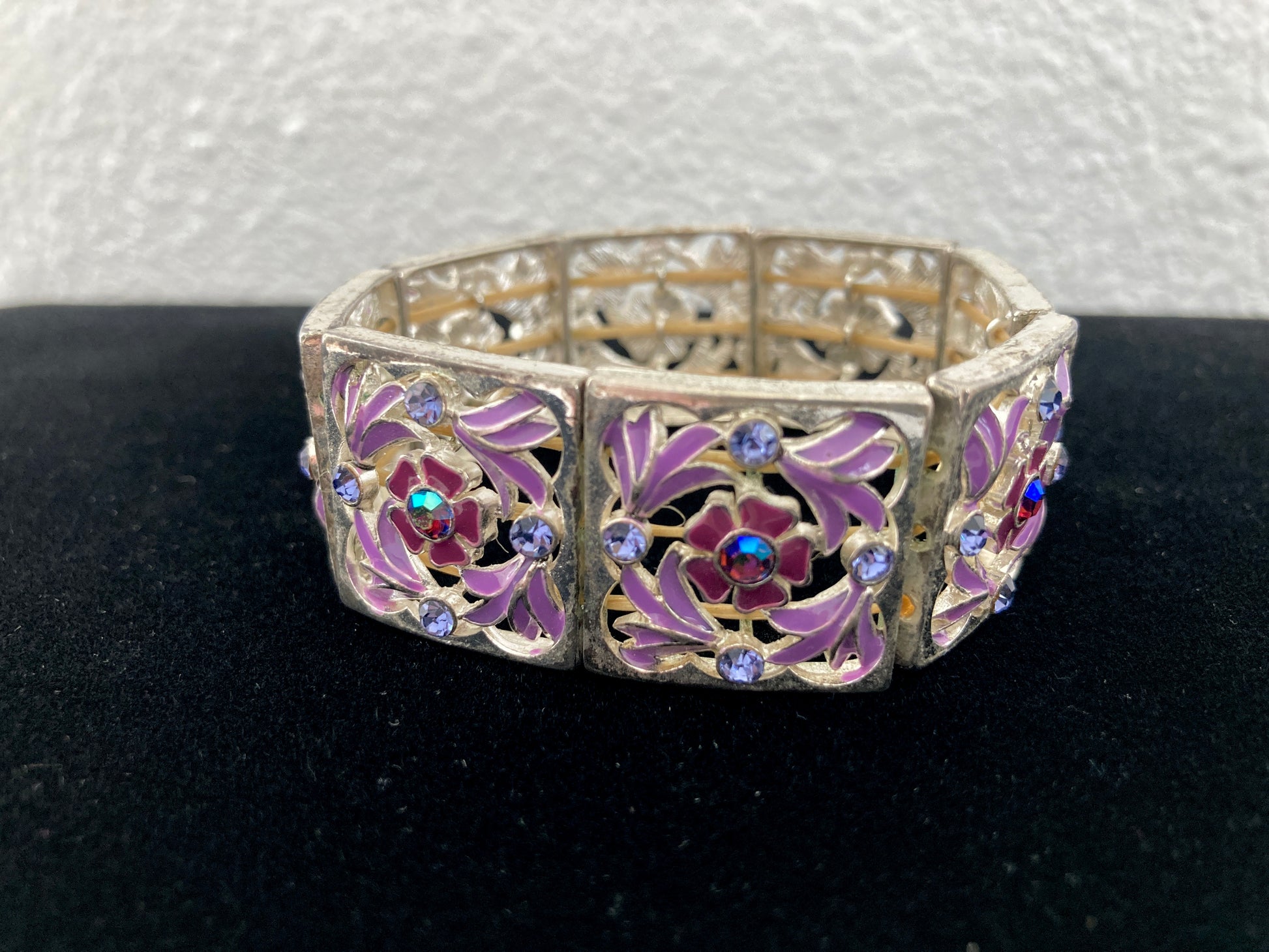 Silver-tone metal and lavender enamel are offset by purple aurora borealis rhinestones and burgundy center flowers on each panel. This bracelet is made up of 8 matching panels and features its original elastics. Each panel is 7/8" square. There are no missing stones or chips in the enamel, although there is some wear to the silver-tone plating. Fits an average size wrist.
