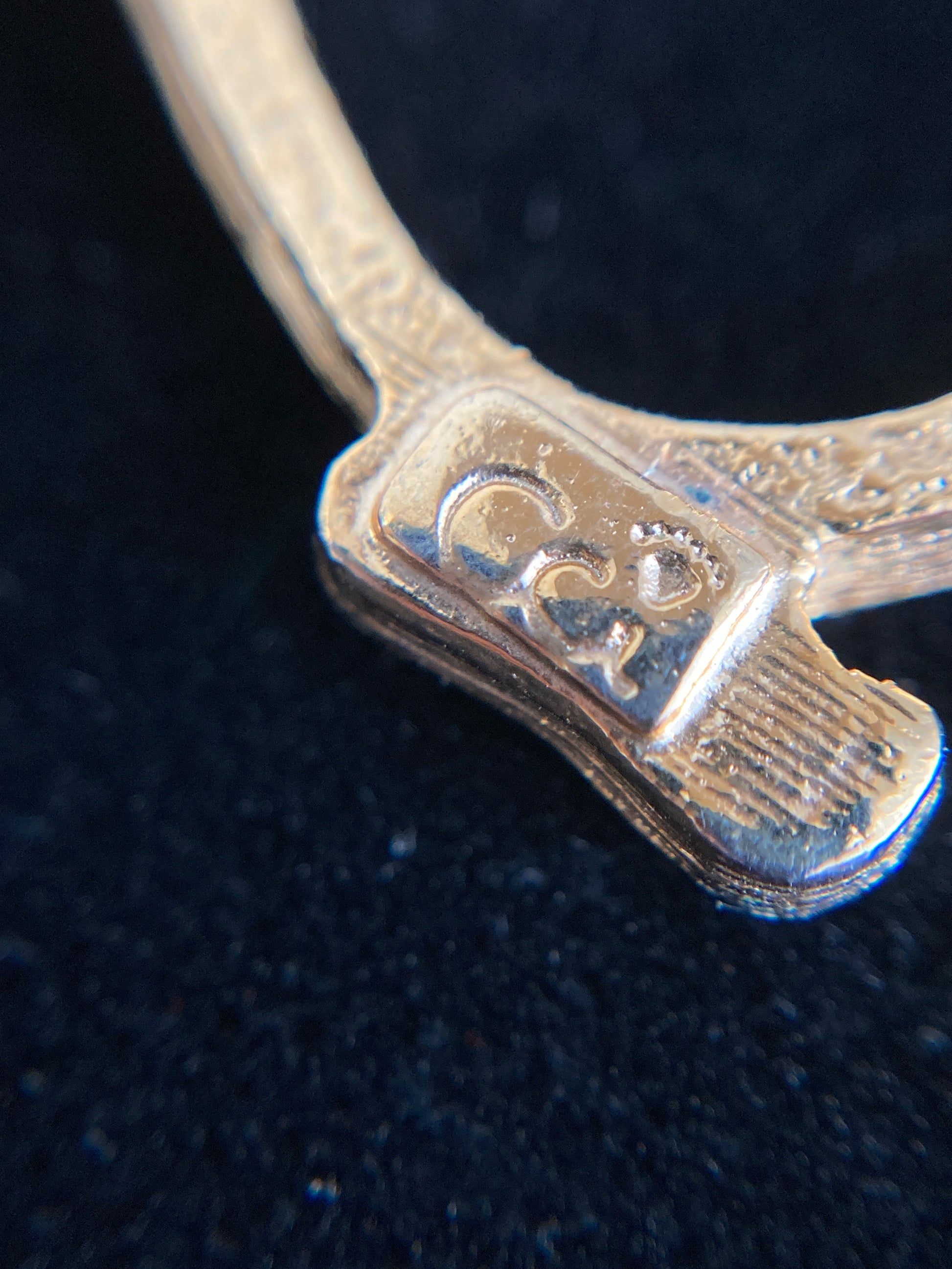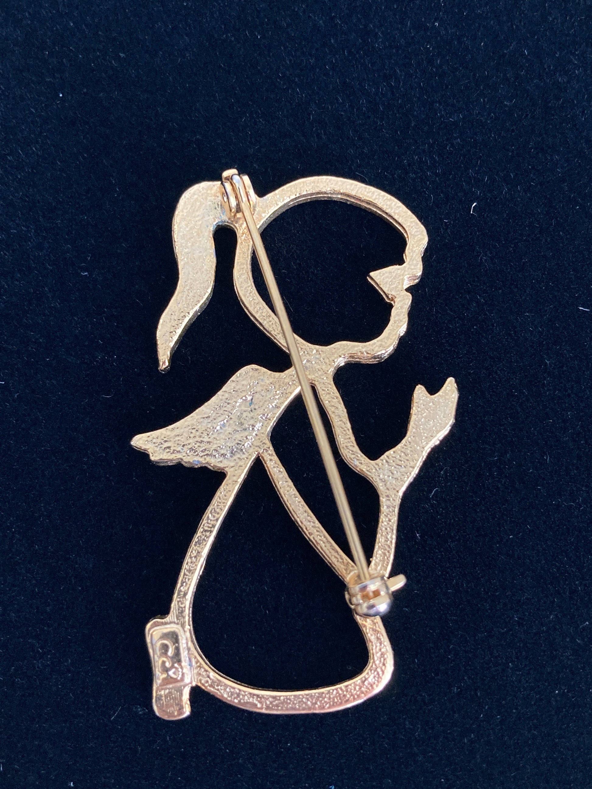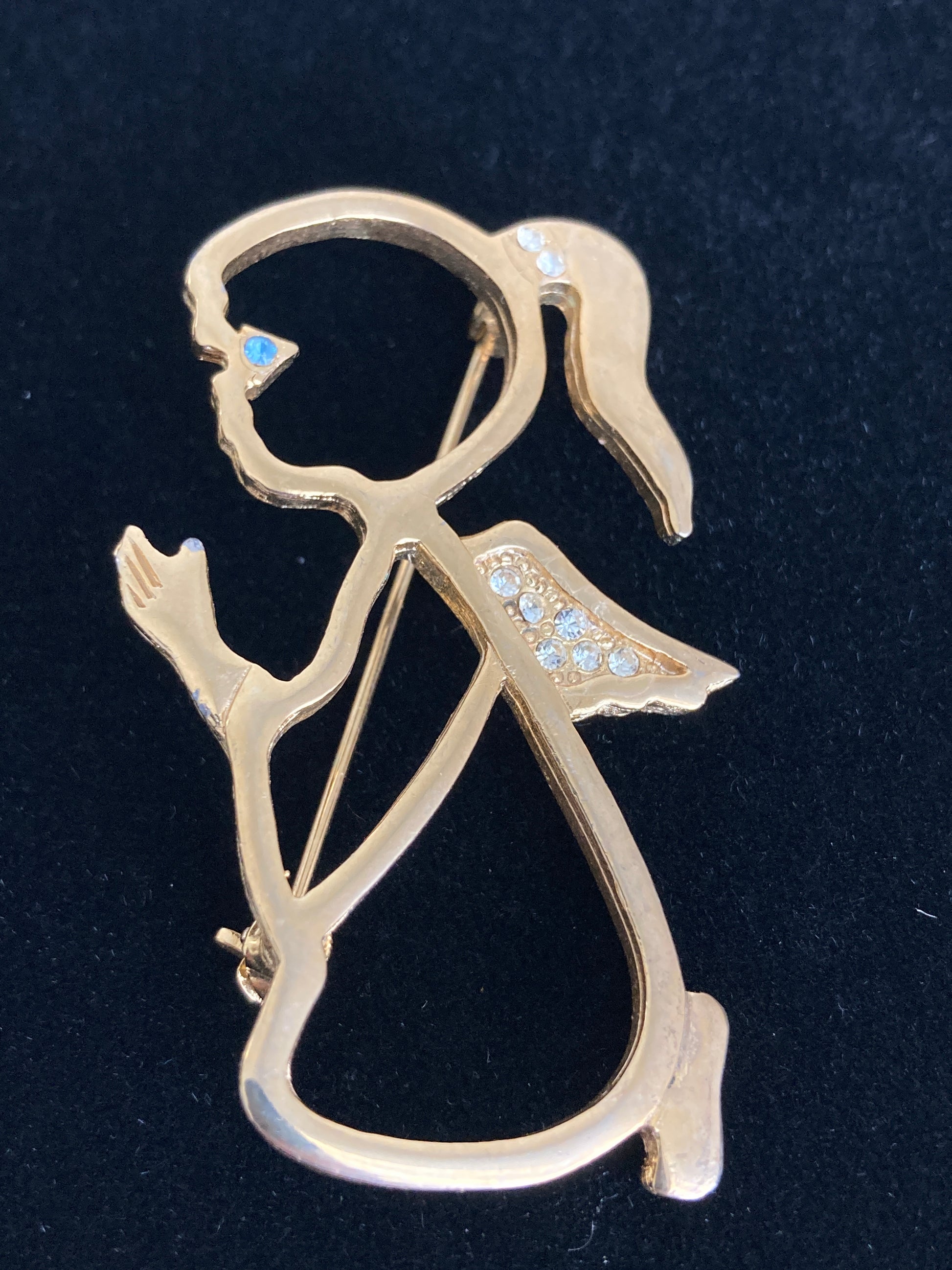 Here is the sweetest little girl, she's kneeling in prayer and features rhinestone detail. Done in openwork gold-tone metal she has a single light blue stone for her eye as well as several stones delineating her ponytail and angel wings. The back is marked Cci. In excellent condition.