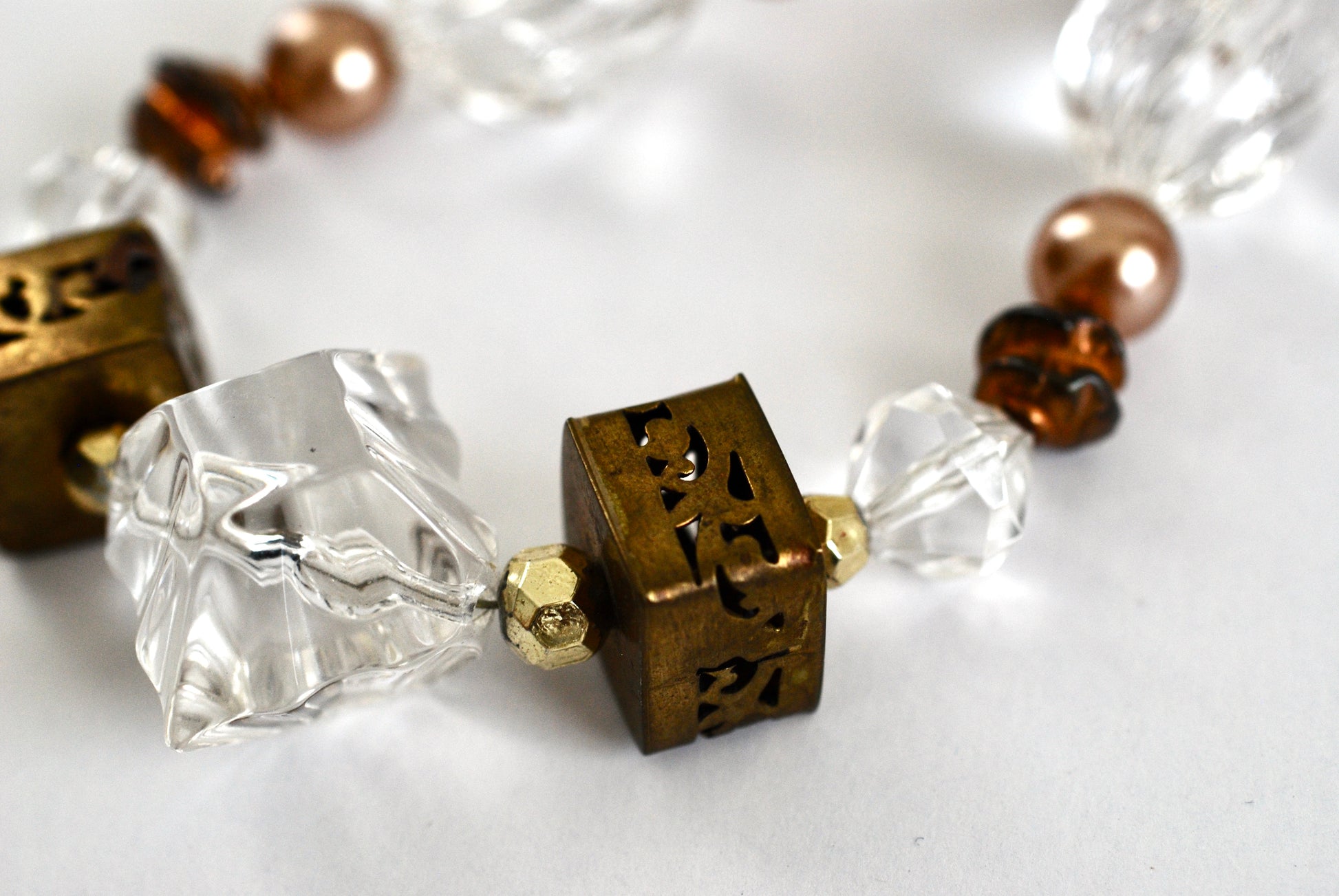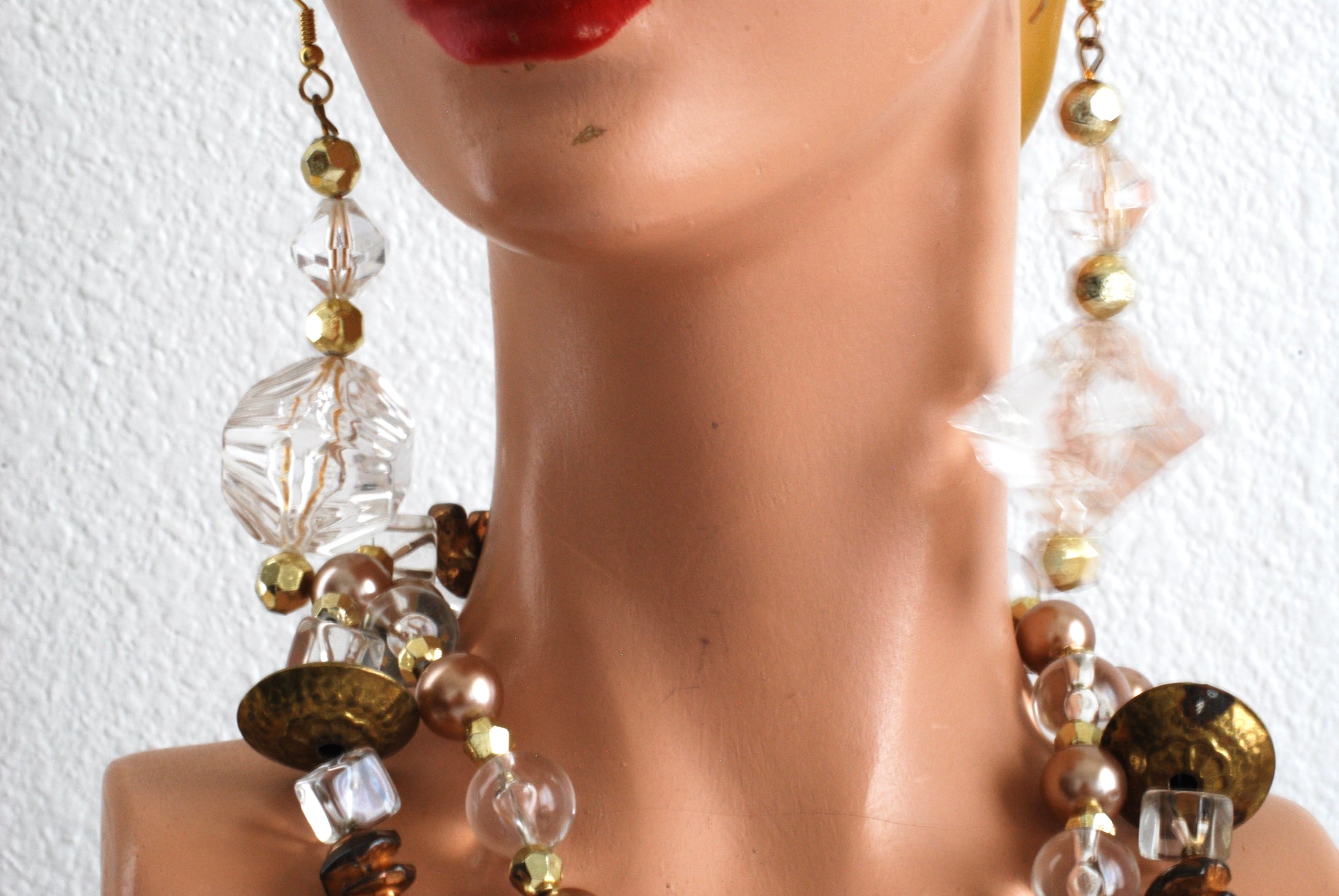 Stunning boho style long necklace features both large and small clear multi shaped beads, mixed in with large brass beads, mocha pearls, gold tone faceted beads and copper colored faux rocks. Included are a pair of matching pierced dangle earrings. With these wonderful neutral tones and bohemian look this set would be gorgeous with anything from a casual outfit to a suit or evening gown. Reminiscent of vintage Chico's but unmarked.