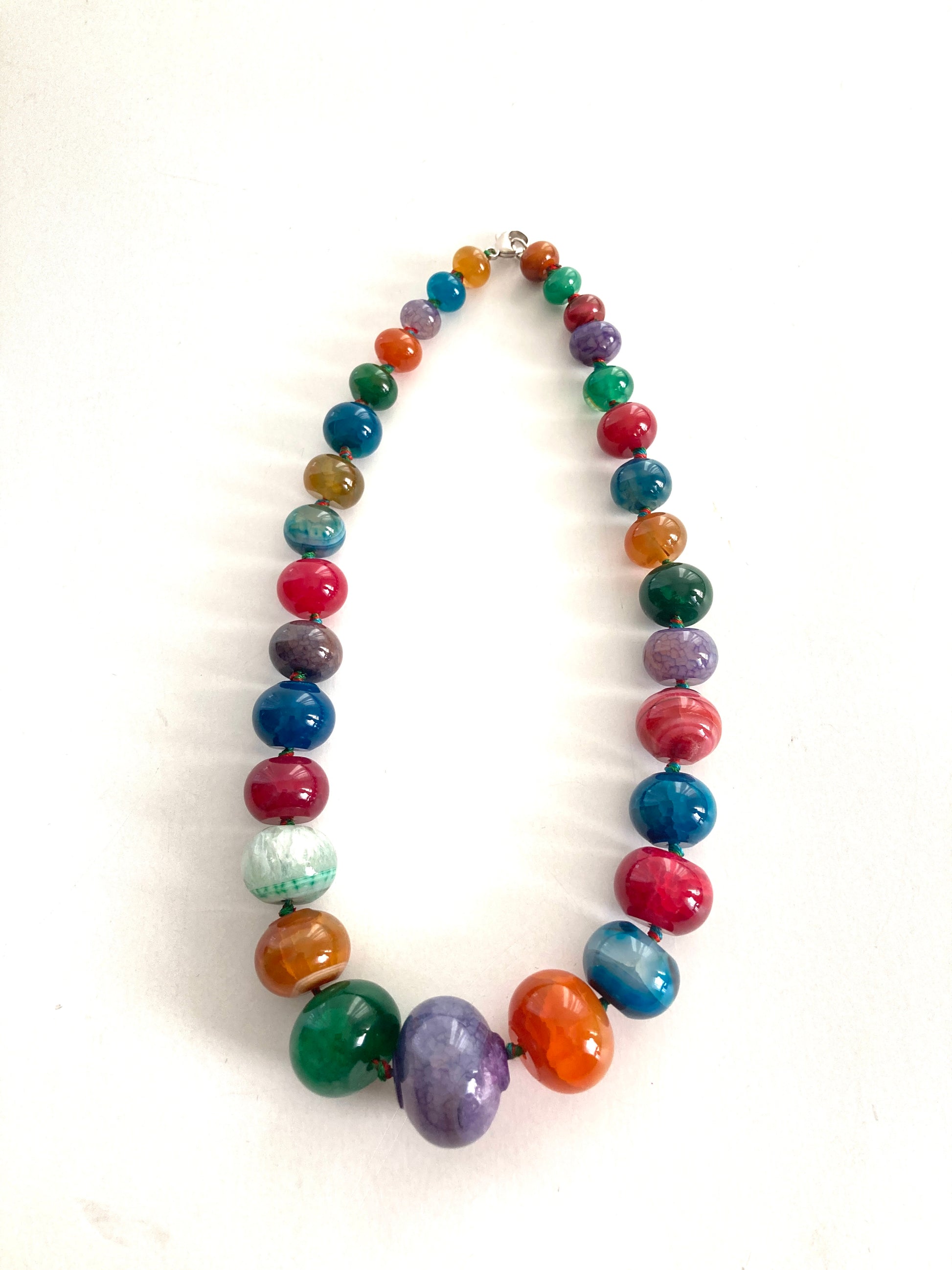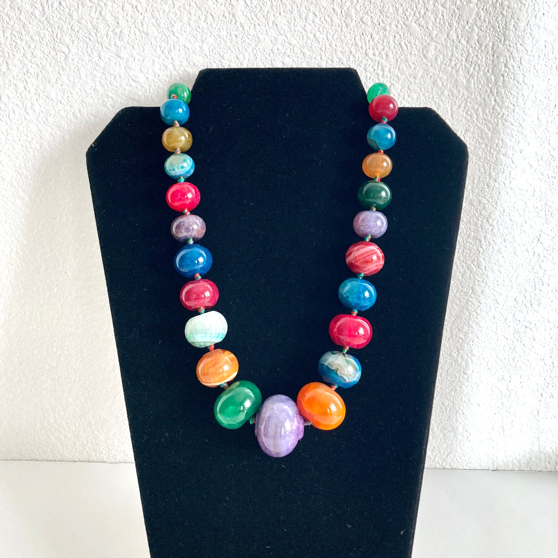 Gorgeous polished dyed agate large statement necklace. Hand knotted with sterling silver clasp. Designed by Lucas Lameth for LUC. Beautiful shades of reds, oranges, greens, and lavenders in graduated polished beads of dyed agate. An absolutely stunning statement necklace.