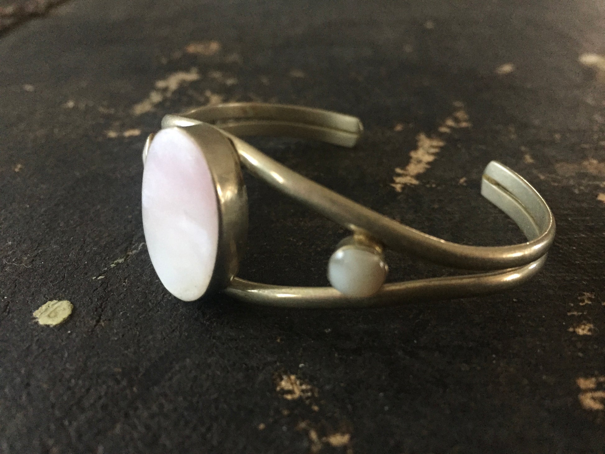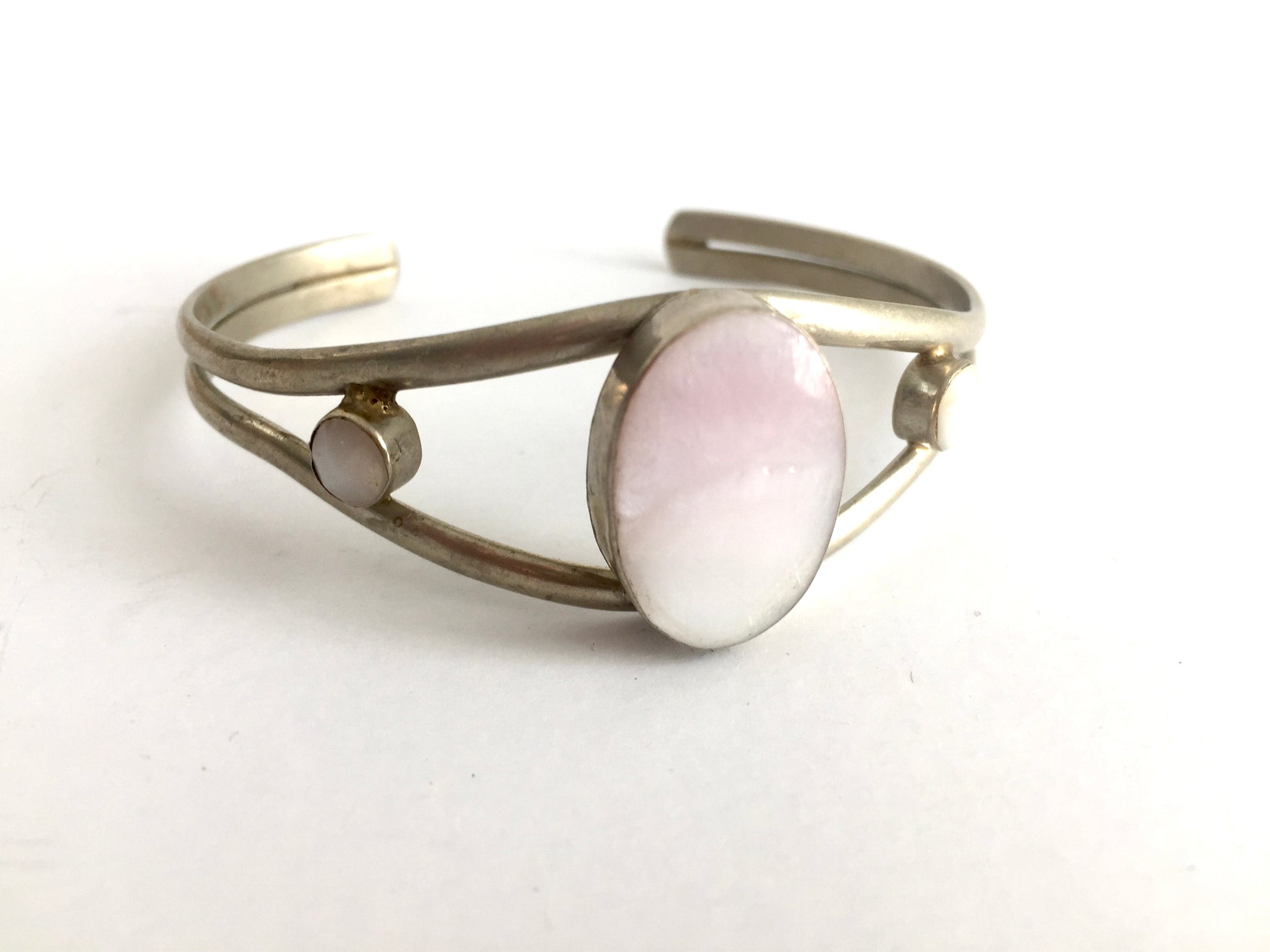 Simple and sophisticated describe this beautiful bracelet. Stamped Mexico on the back and made of silver with pink and white quartz stones. Features a largeer oval center stone with two smaller round sones on either side on a double banded open cuff. Adjustable for size. The center stone has a small flaw that could be polished out although I prefer to leave that to you as I believe it adds character.