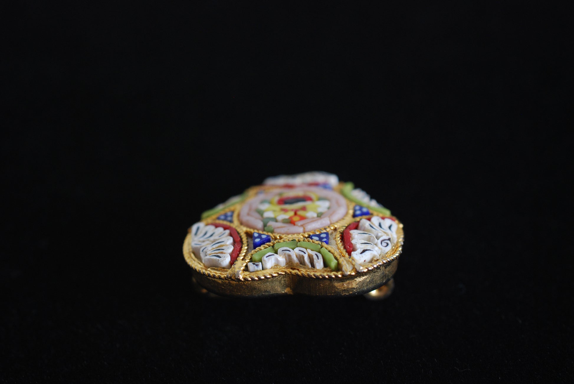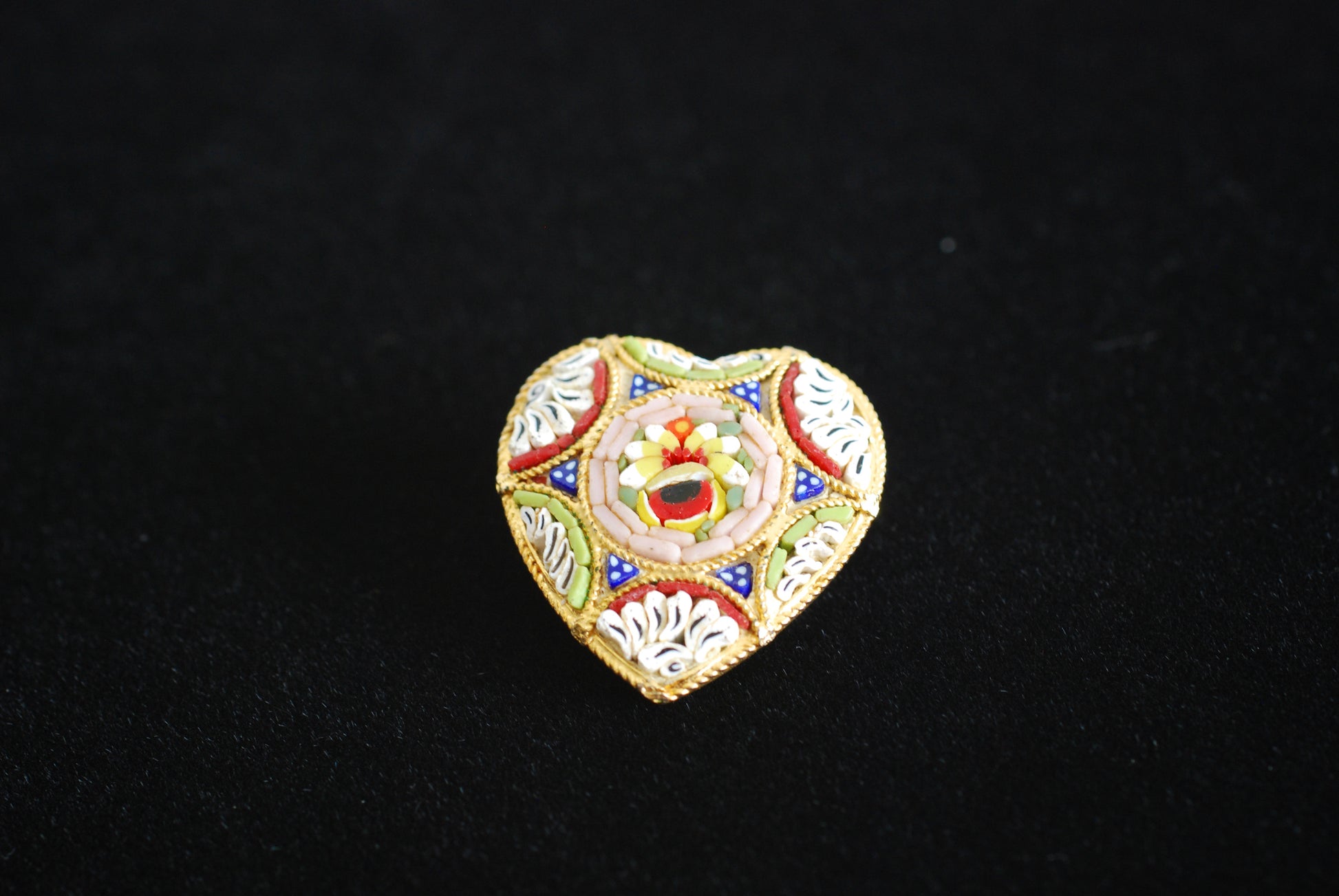 Here's a sweet little vintage micro mosaic heart-shaped brooch. The back is stamped Italy. This particular piece was purchased in Italy in the 1970s. It shows minimal signs of wear on the back due to age. Just a slight discoloration of the gold-tone metal. The detail in these pieces is fabulous. This particular brooch has a center flower surrounded by soft pink and surrounded by sprays of red, white, and pale green with tiny blue and white millefiori triangular bits. Created using tesserae mosaic.