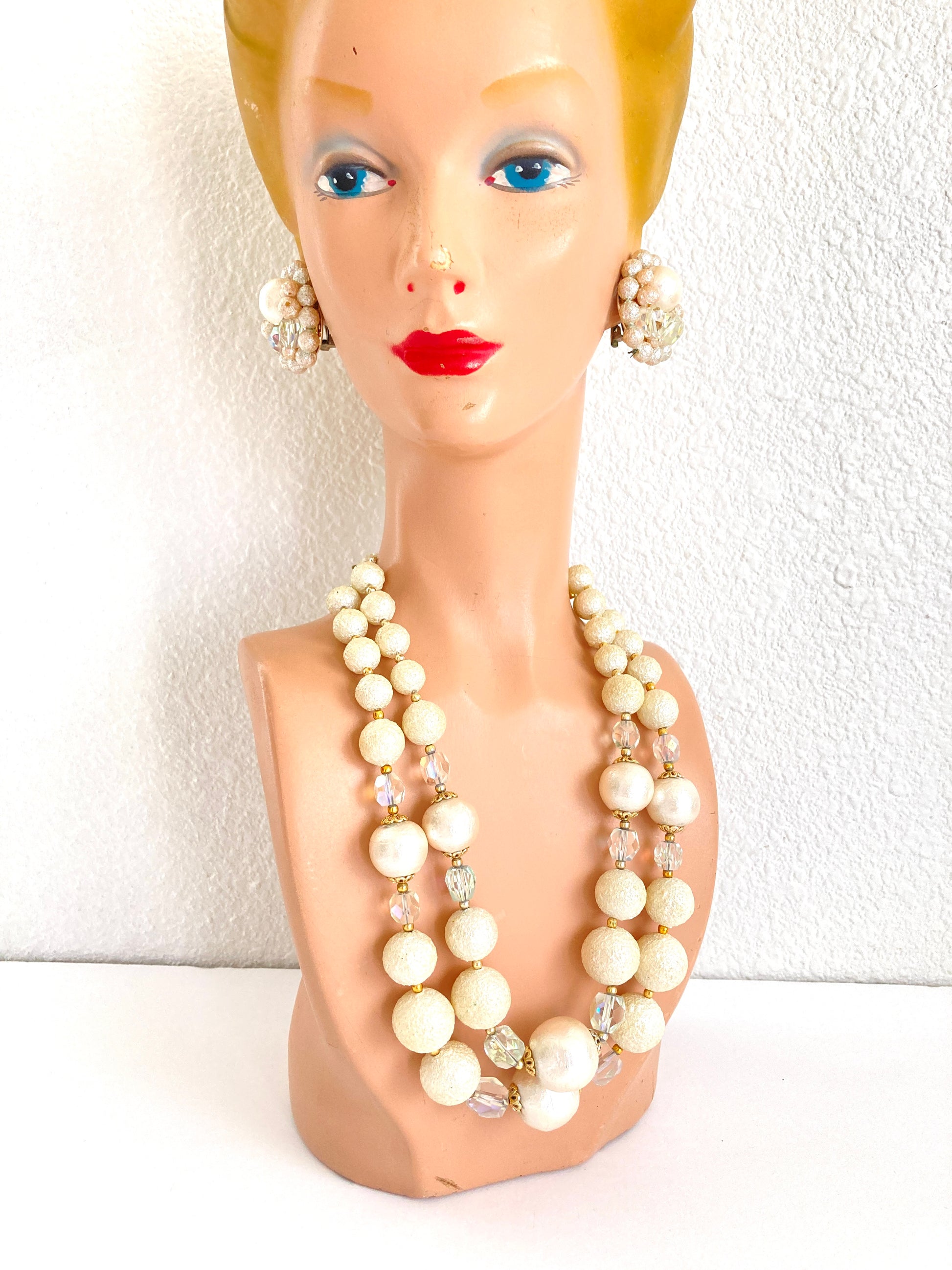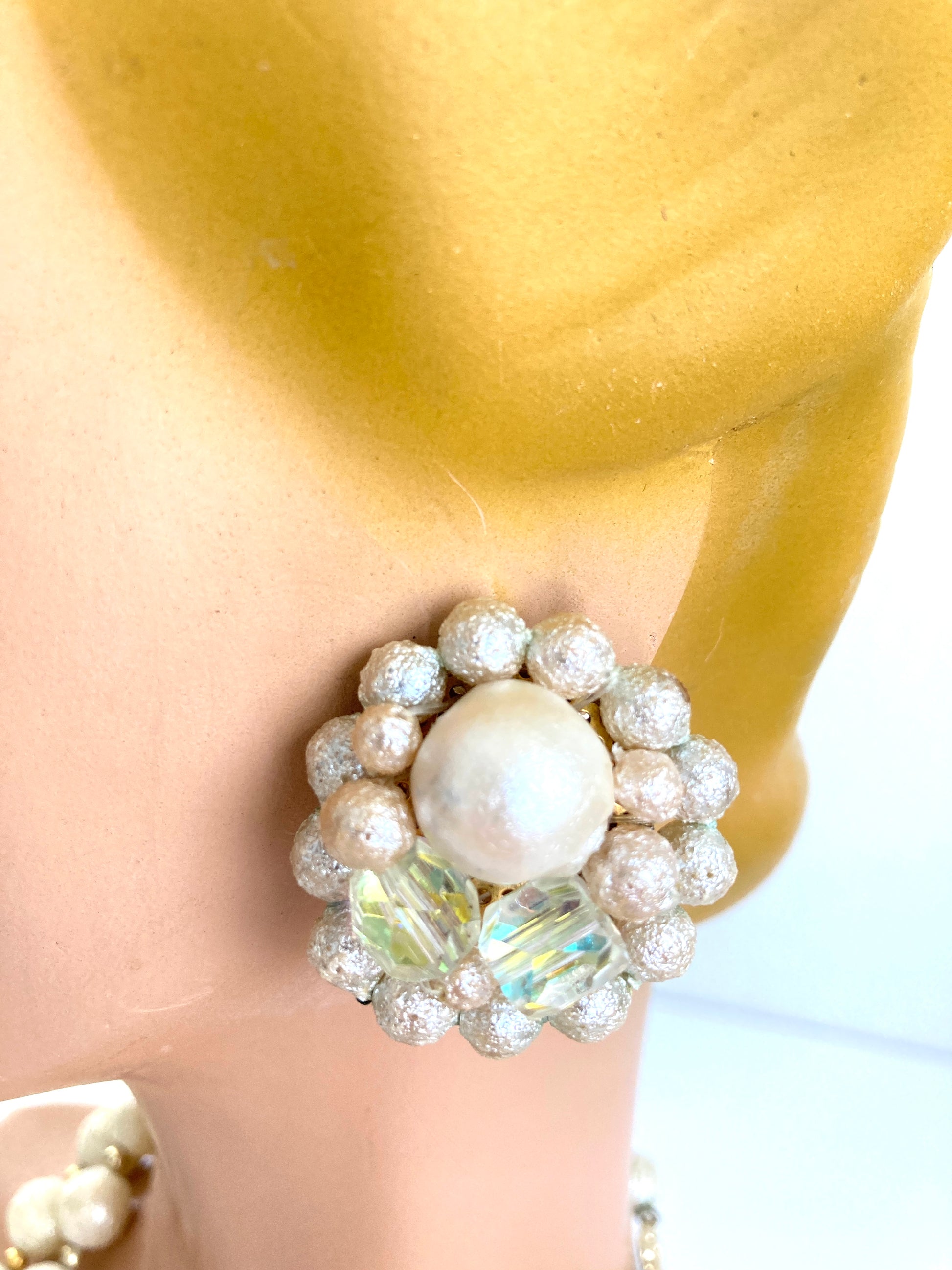 This two-tier chunky beaded necklace and earrings set features large graduated textured faux pearl look beads with faceted crystal and gold tone spacers. The matching earrings are cluster-style set on clip-on backs. The earrings and necklace clasp are marked "Japan". The necklace is adjustable as well.