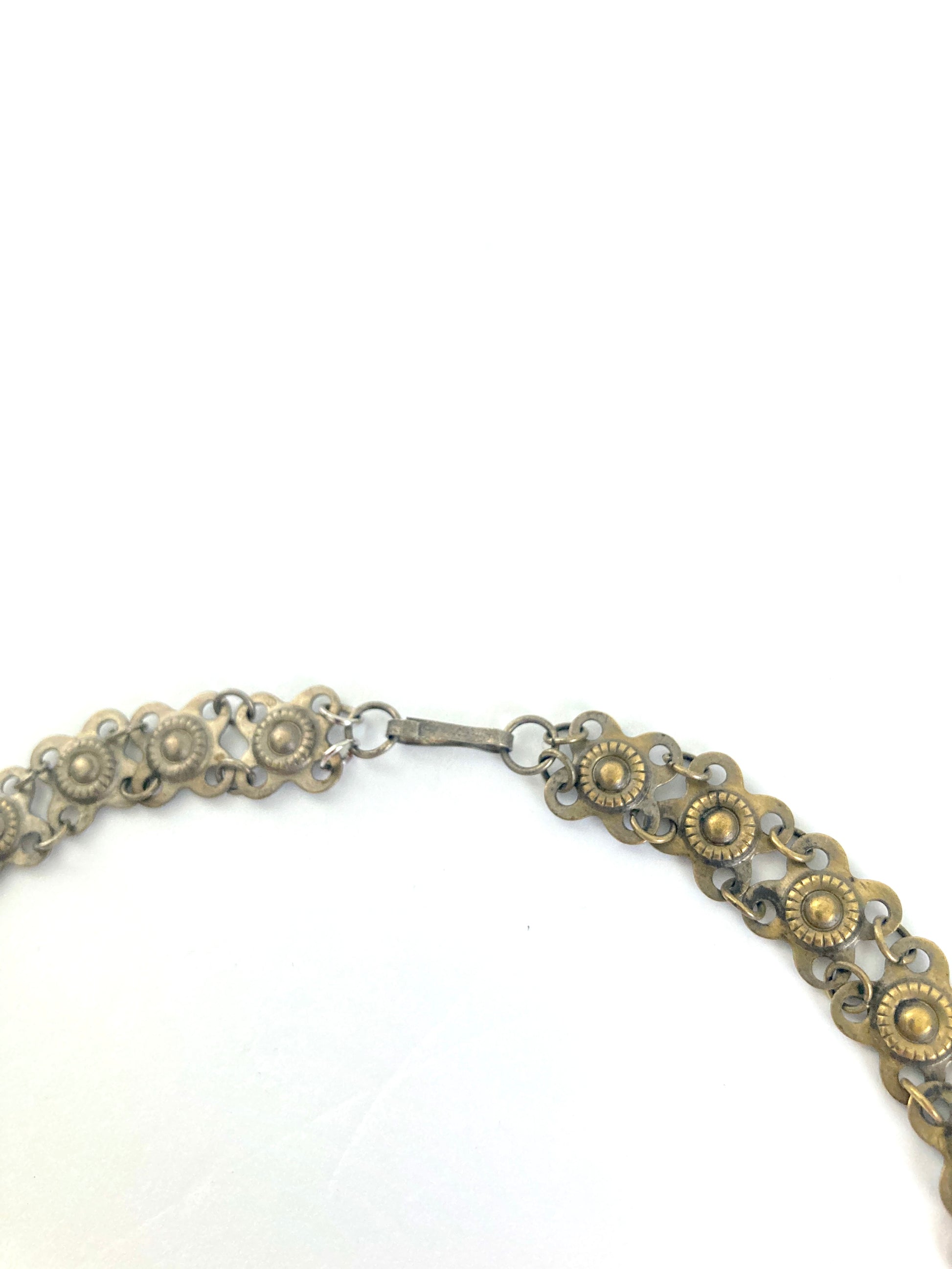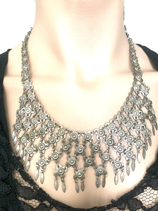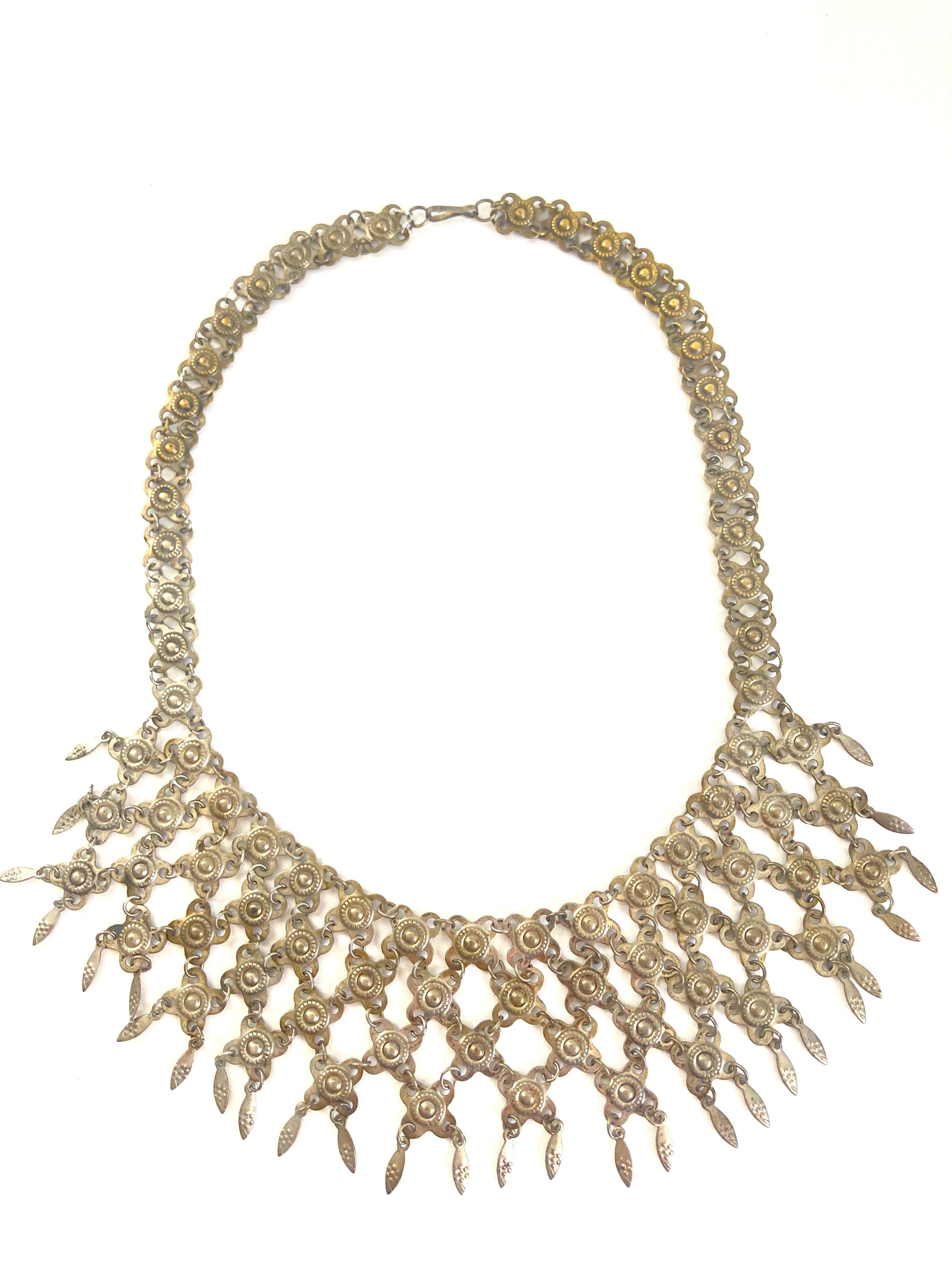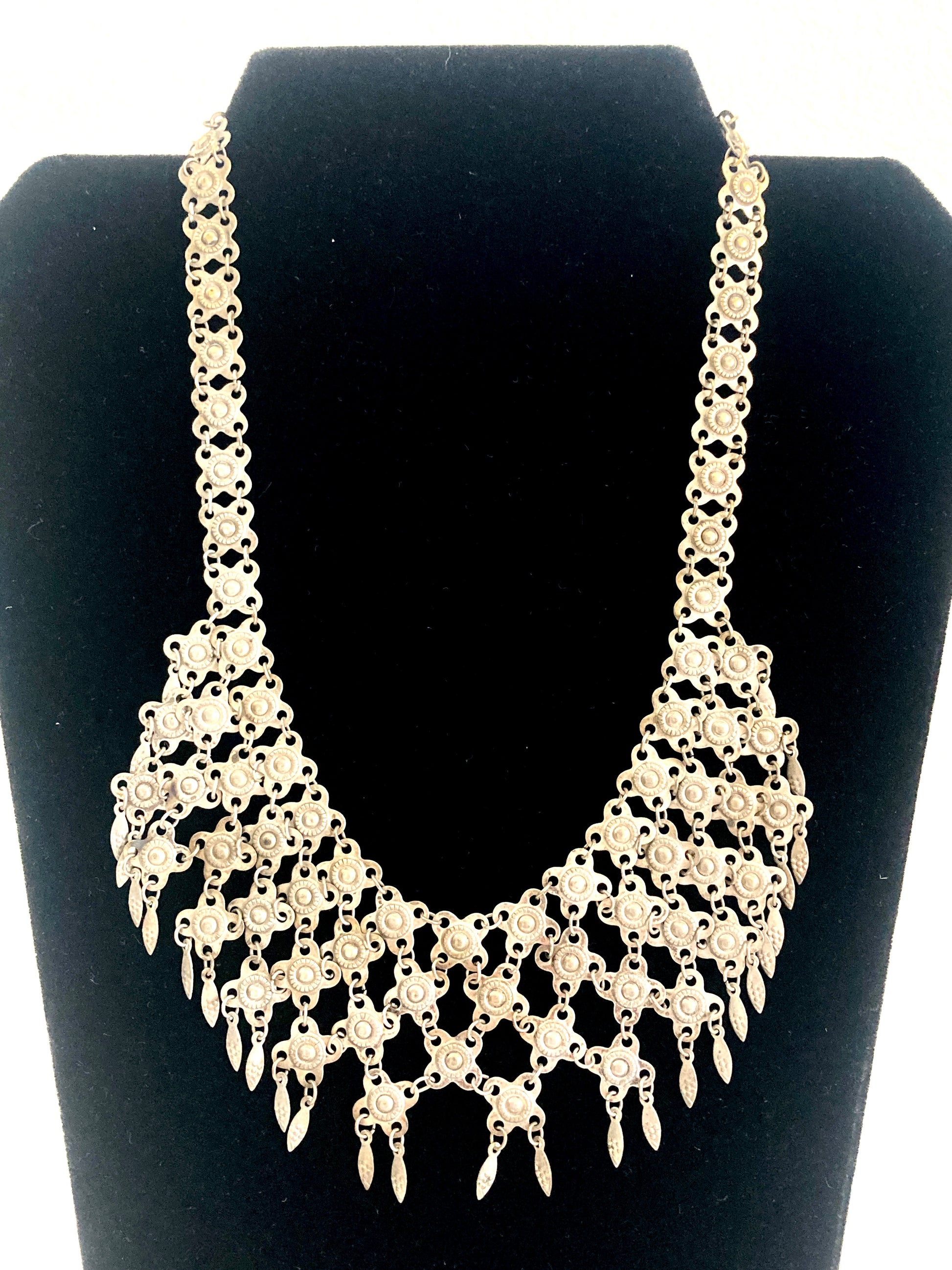 This gorgeous vintage bib necklace made of stamped metal is light as a feather to wear yet packs a visual punch. Most likely made in the 1970s the style is pure bohemian. A great accessory to go with everything from a printed caftan to a pair of jeans and T-shirt.