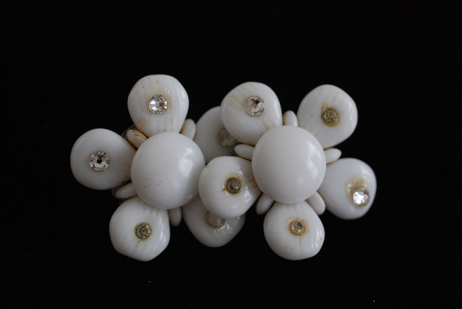A sweet pair of vintage earrings in white milk glass with tiny rhinestones in the centery of each petal. These are clip on earrings marked Made in West Germany on the back. The petals move slightly and if you look closely you can see lines in the glass petals giving them just a bit of texture. Some of the original stones have been lost and replaced. Otherwise these are in excellent original condition. Clip on backs.