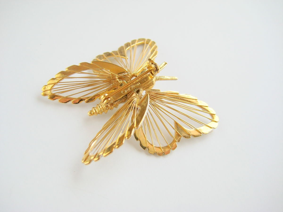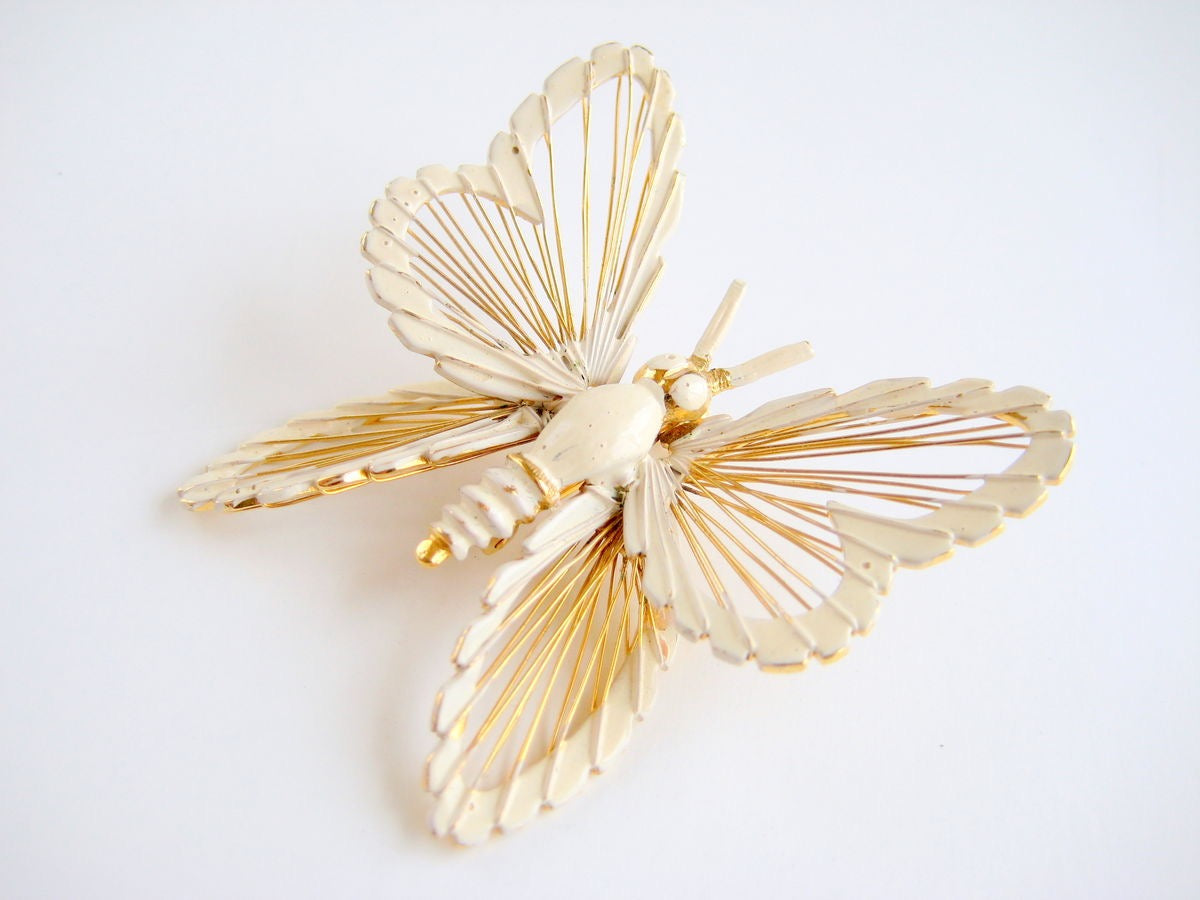 Classic Monet butterfly brooch with just a bit of a twist as this one is decorated in white enamel to offset the gold wire wings. Stamped "Monet" on the back under the clasp. This beauty would work well on the lapel of a blazer or coat and equally well on a blouse or as a scarf pin. The timeless design and colors make it a piece you will wear again and again.