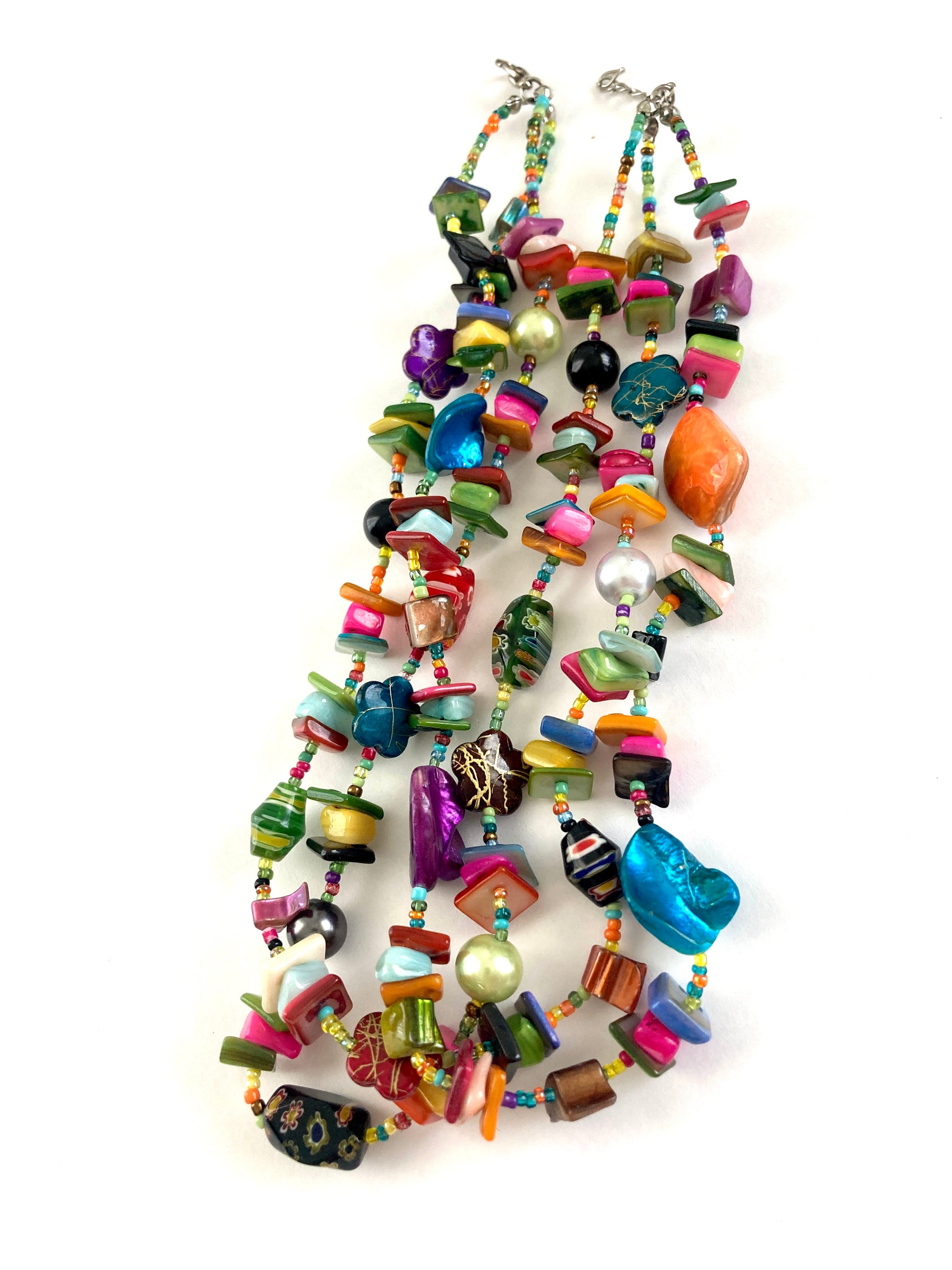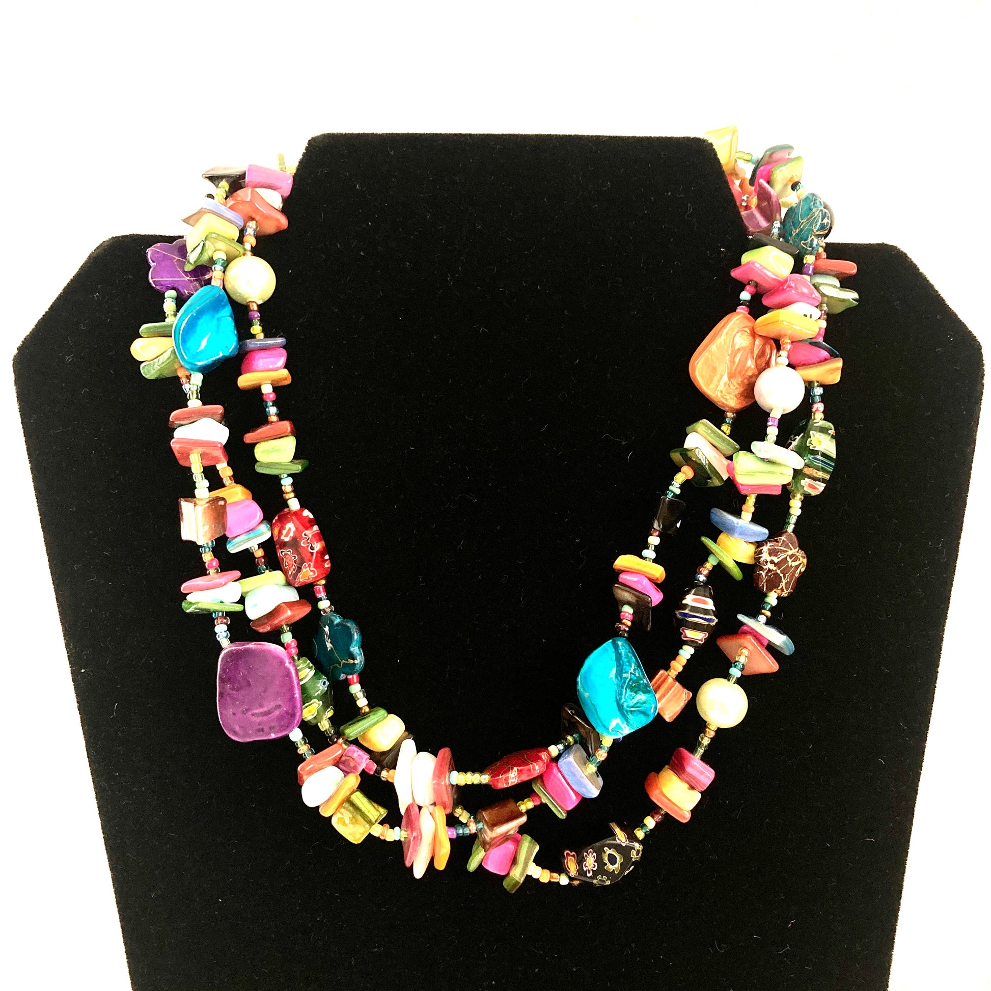 This three-strand beaded necklace has it all. Made of brightly dyed pieces of shell, colorful seed beads, millefiori beads, faux pearls, resin, and glass beads this necklace is a riot of color, texture, and patterns. The colors sparkle in the sunlight. Definitely not for the faint of heart. Every color in the rainbow is represented here, plus a few extras. An absolute show-stopper. Features a lobster clasp closure with a short adjustable chain in silver-tone metal.