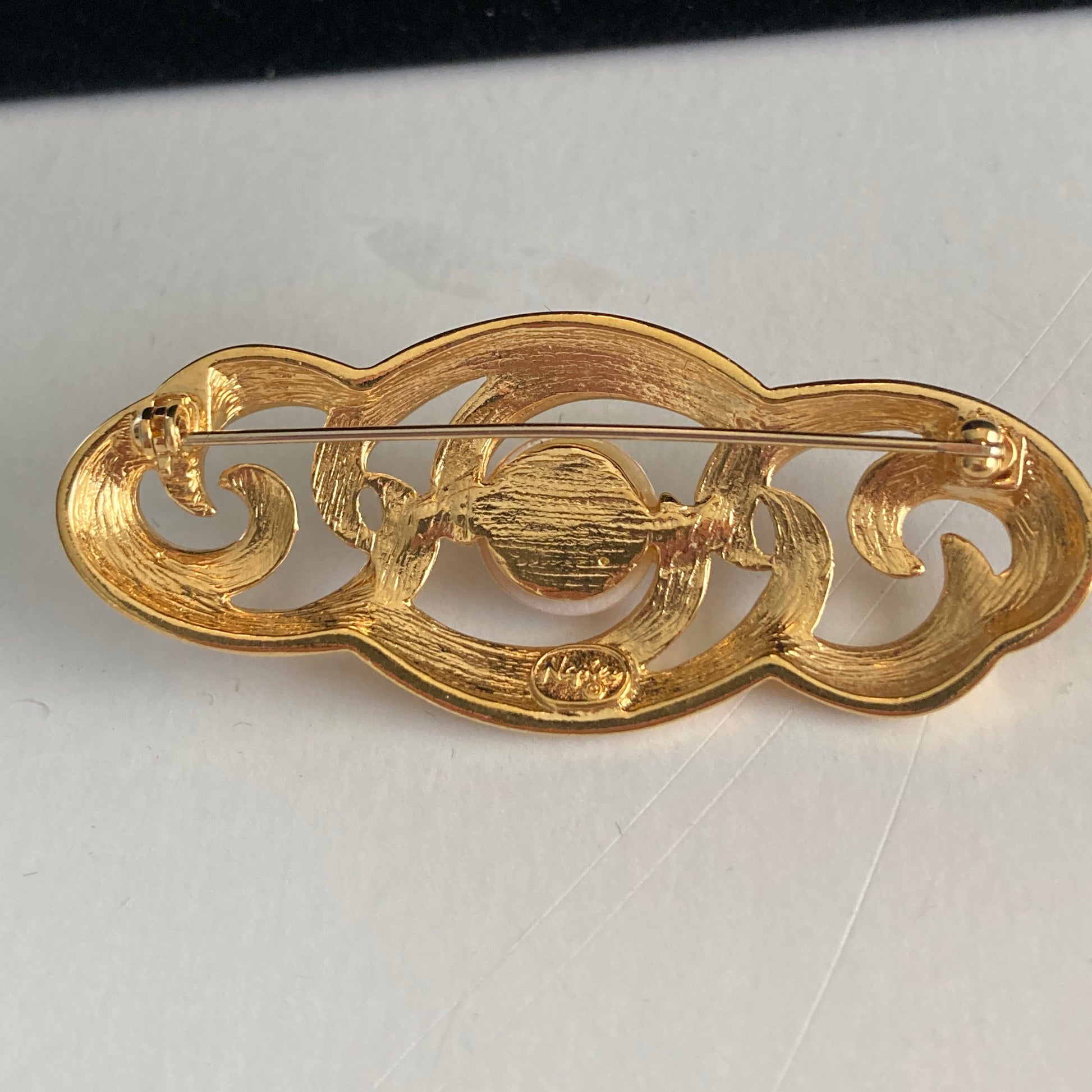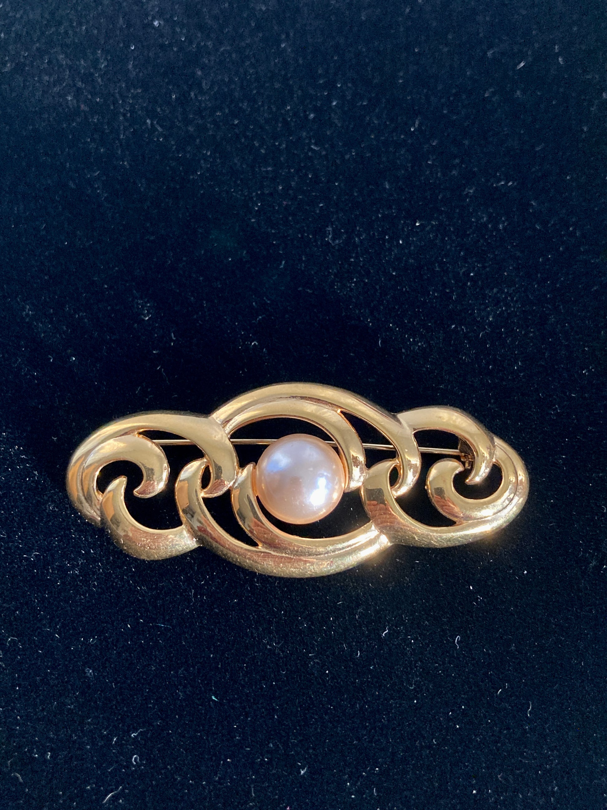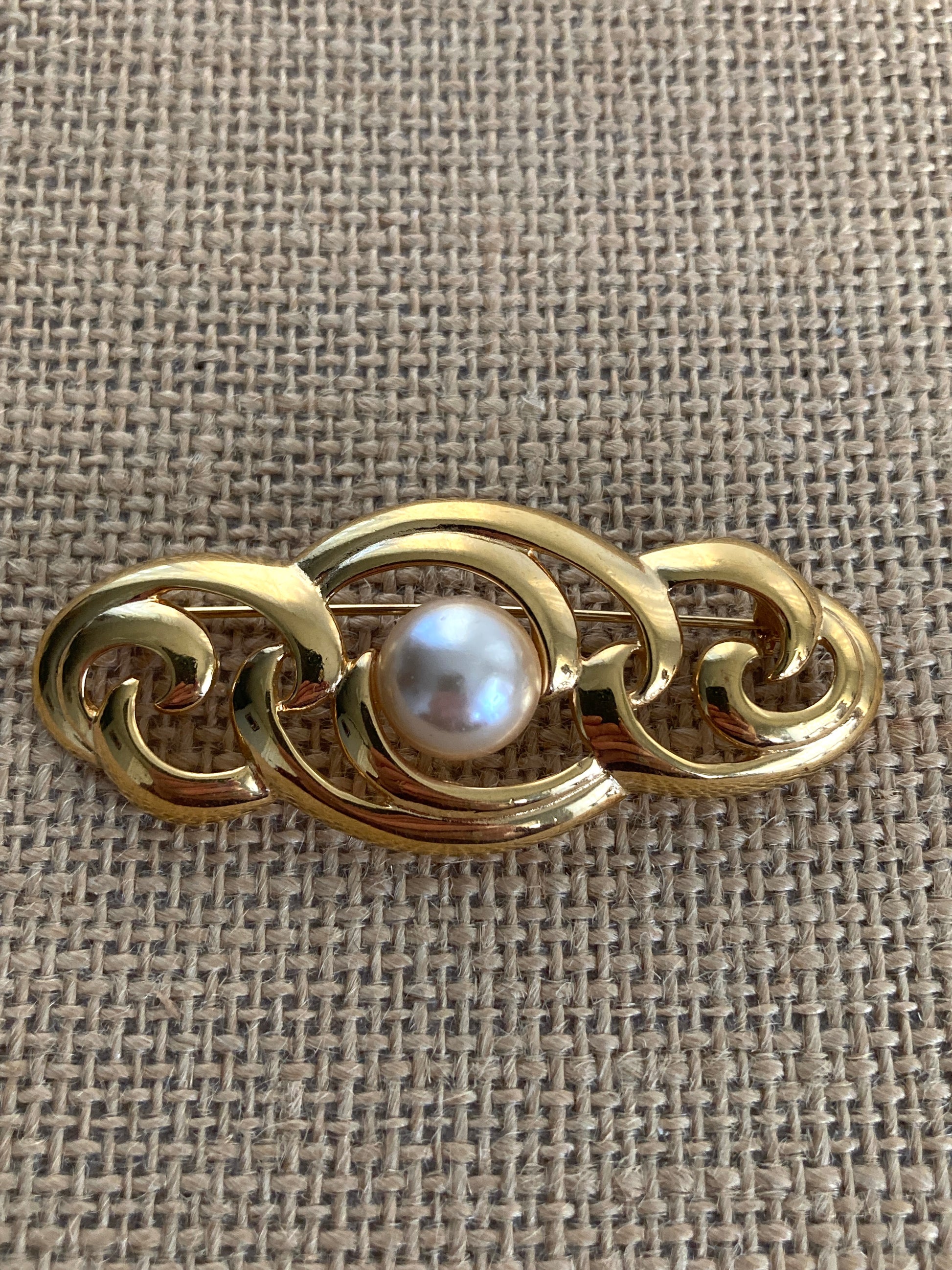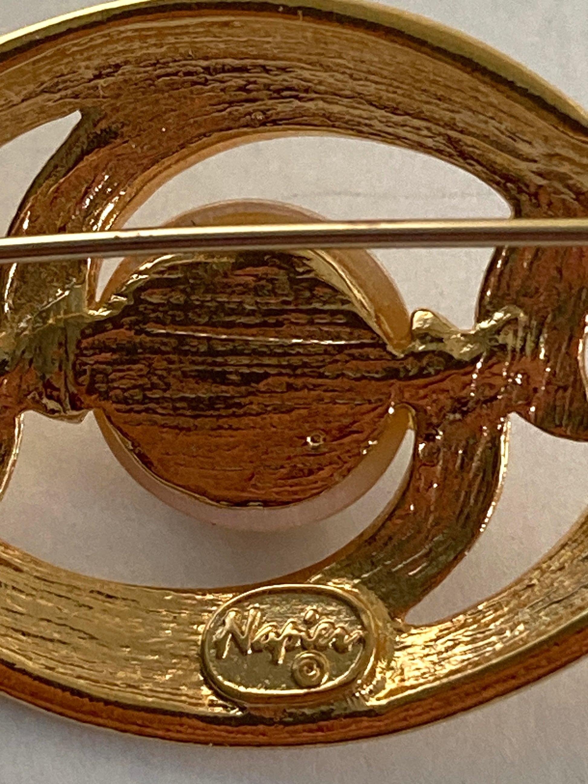 Here's a lovely Napier vintage brooch in goldstone metal with a large center faux pearl. The swirled design gives it a contemporary look that is timeless. In excellent condition with no signs of use or wear. Marked on the back.