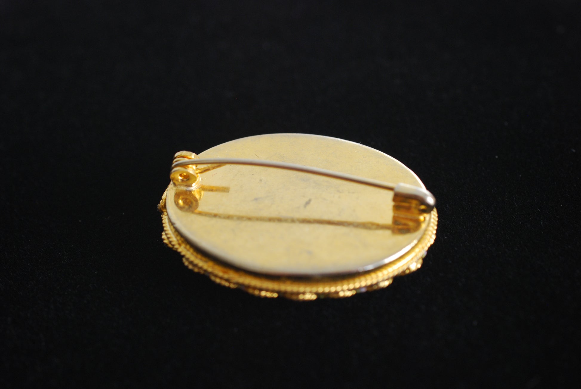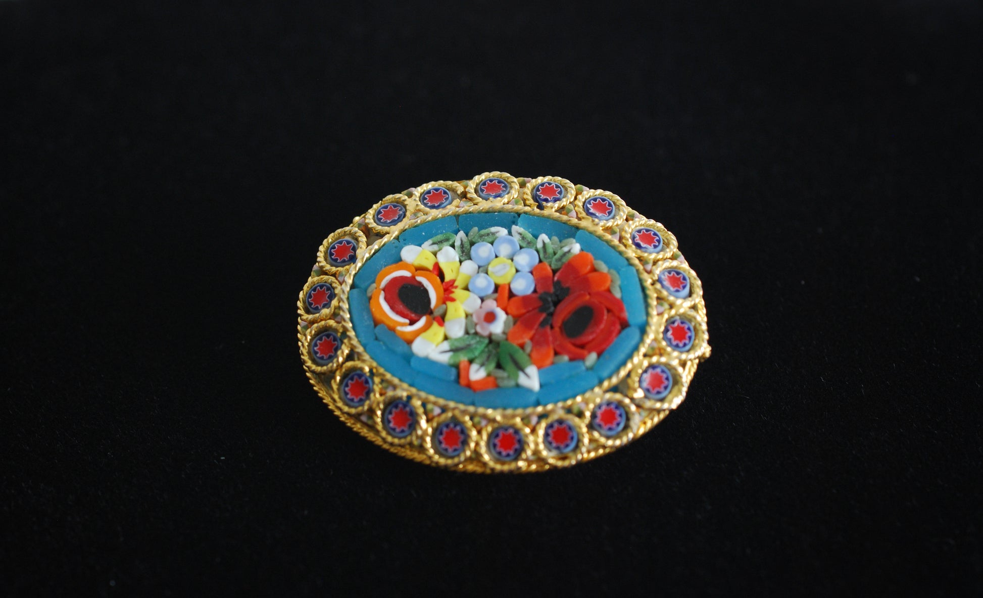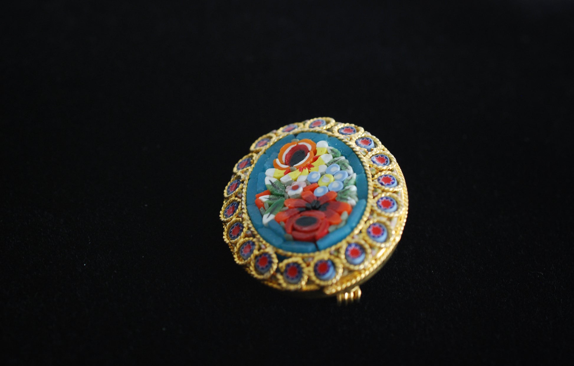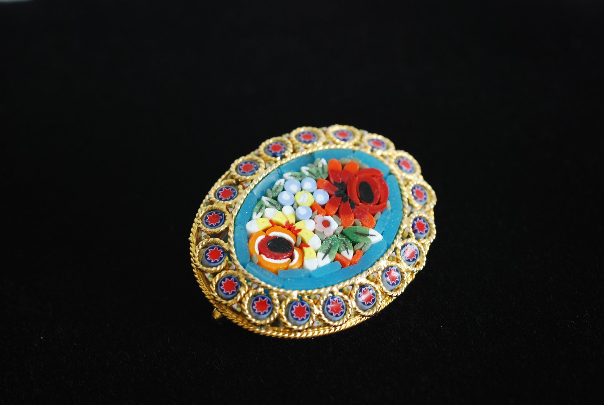 Here's a beautifully detailed vintage Italian brooch in gold wash featuring a bouquet of flowers. The center bouquet is surrounded by millefiori beads in red and blue with twisted wire frames. Originally purchased in Italy in the 1970s. These are such beautiful tiny works of art. Would make a great gift.