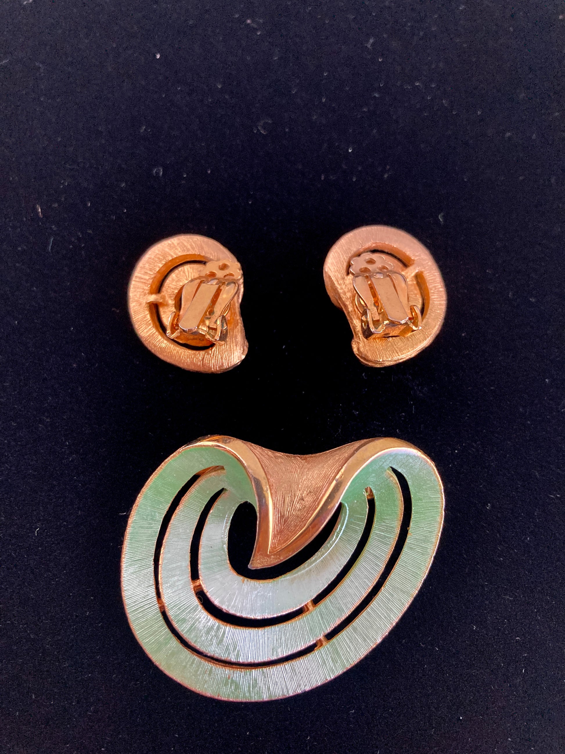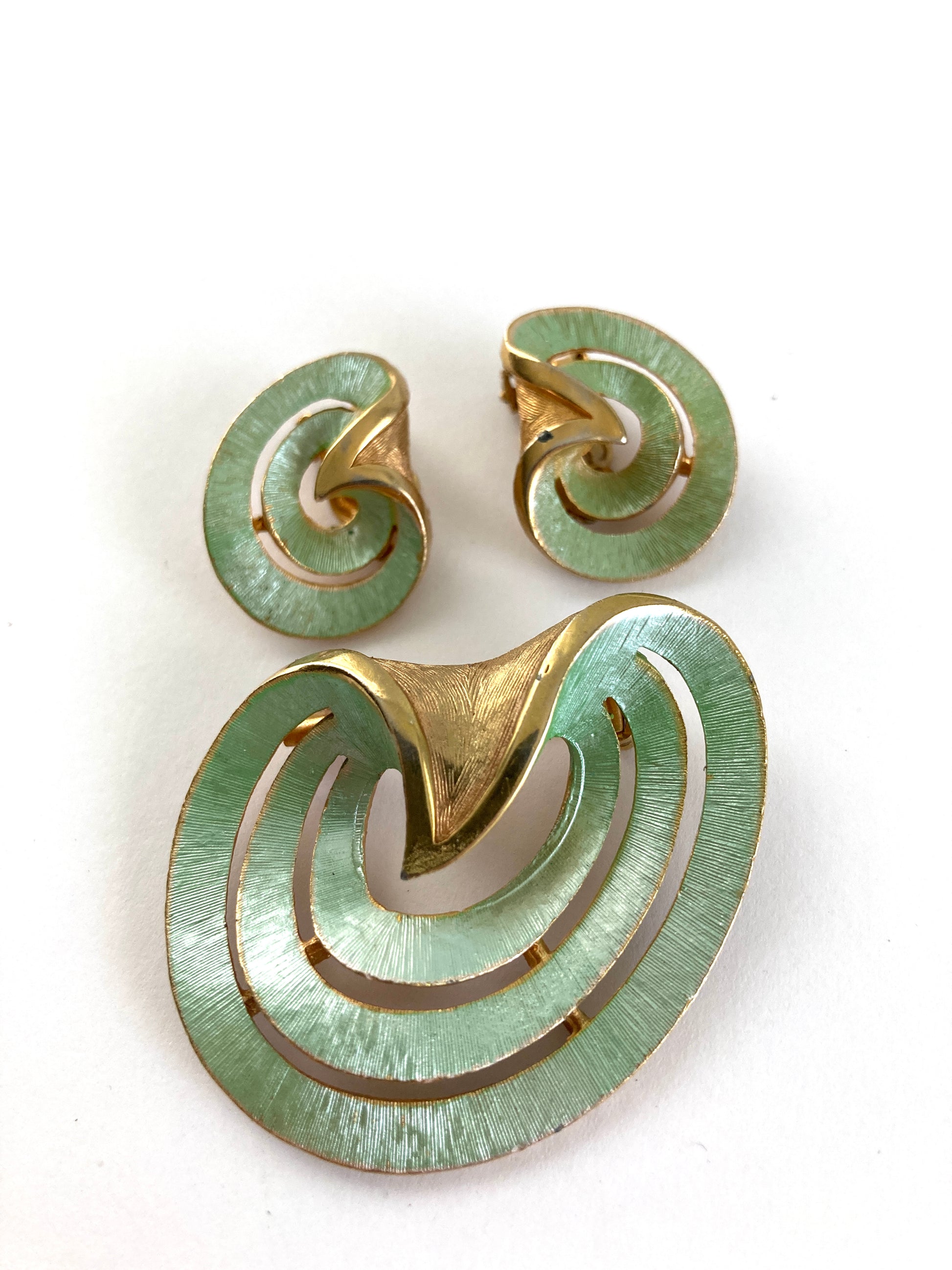 Pale Green & Gold Swirl Brooch and Earrings by JJ