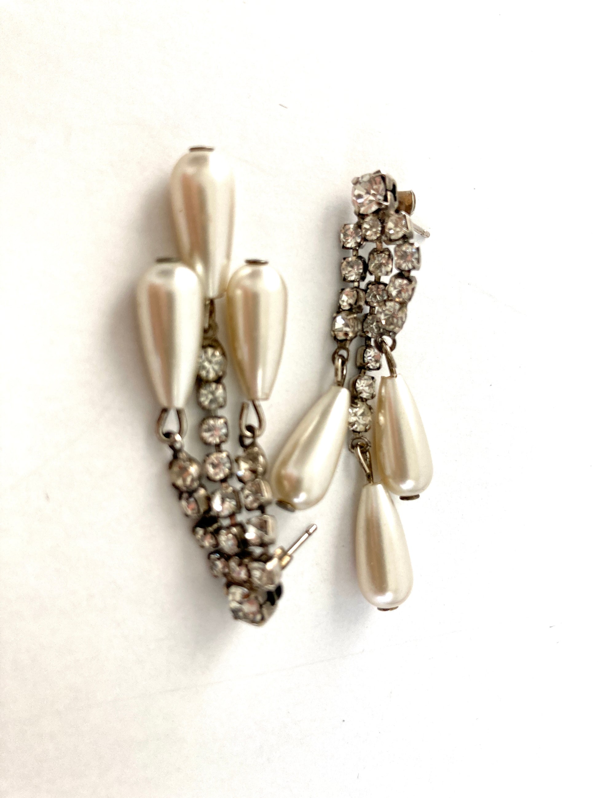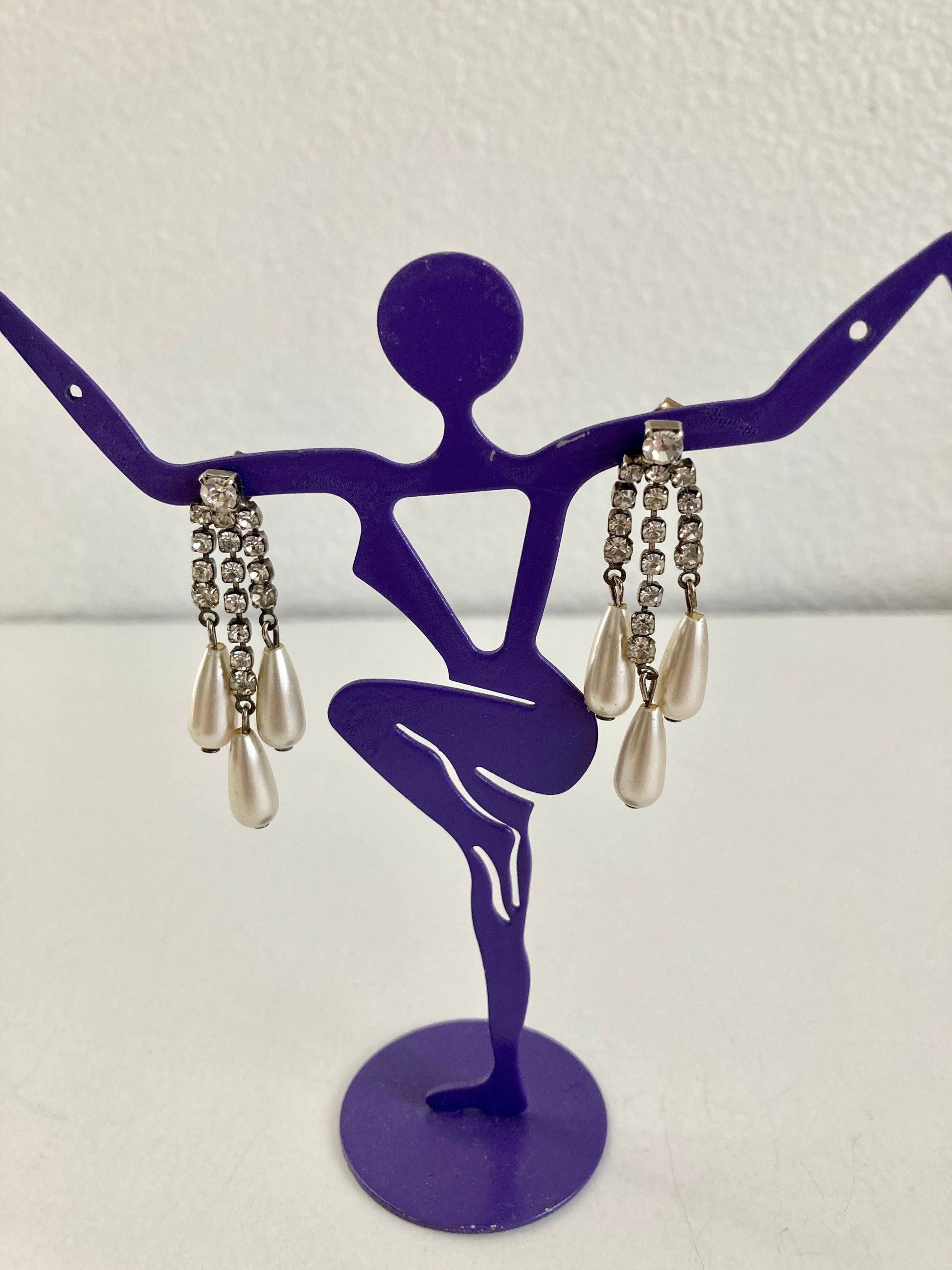 Set atop a slightly larger rhinestone are three rows of smaller crystal stones terminating in three teardrop-shaped faux pearls. The center row is slightly longer than the other two giving these a chandelier effect. They would be lovely worn for a wedding or holiday party. Set on post-style pierced backs. The effect is elegant simplicity.