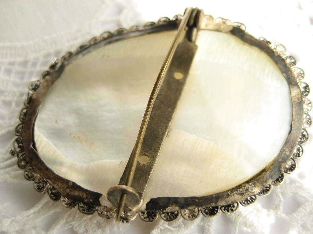 This beautiful old Persian story brooch is hand painted and edged with silver filigree. It depicts a hunting scene with men riding on horseback in mid chase running past a camp site with a tent. Hand painted on Mother of pearl shell and edged with tiny silver filigree flowers. The shell and painting are in excellent condition with no loss of paint, however the filigree is a slight bit damaged as it's extremely delicate.