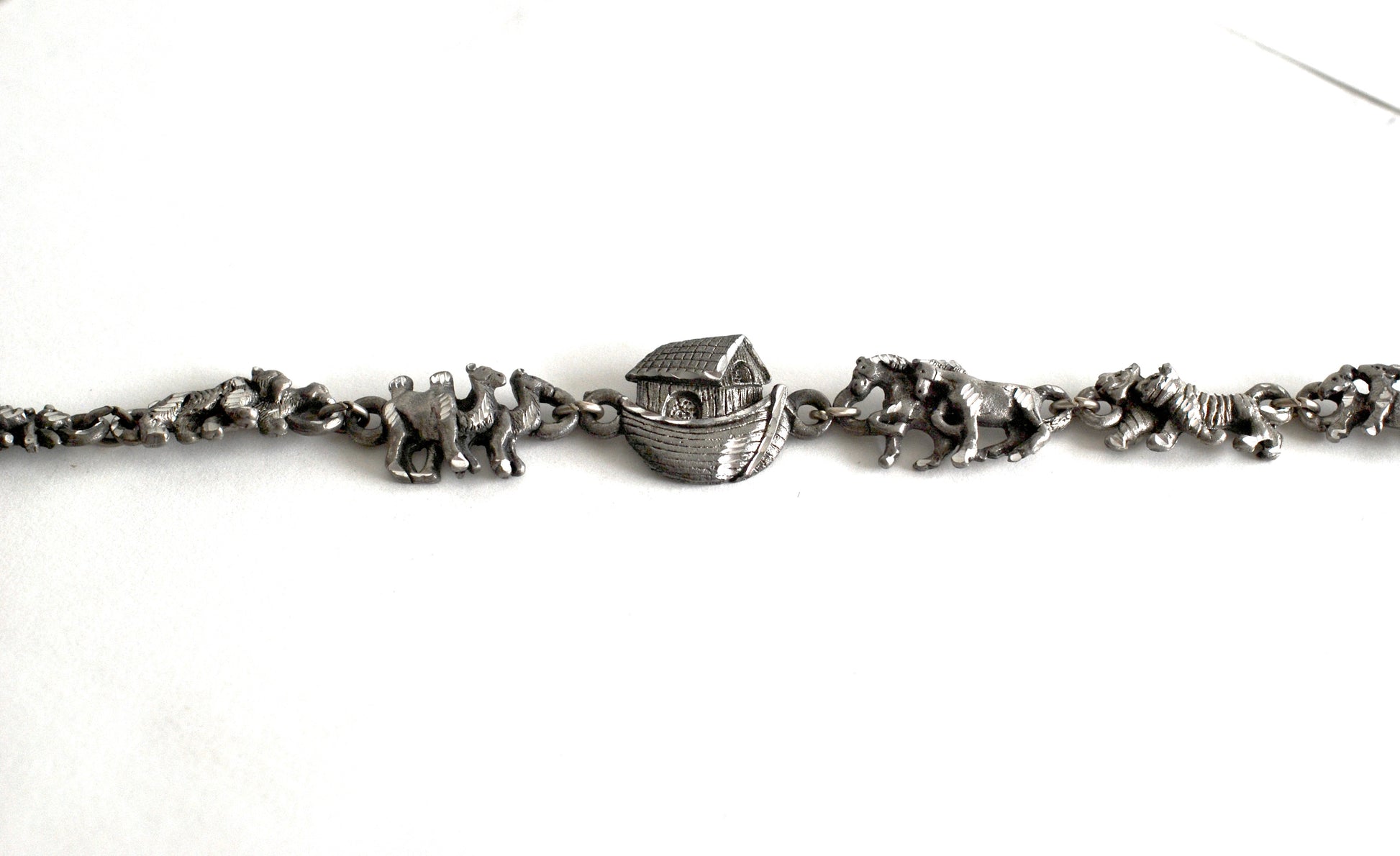 A fun Noah's Ark bracelet featuring several sets of animals heading toward the Ark in the center. Closes with a toggle and ring clasp. Stamped on the back of several links EJC96. Great detail in the animals. Has an extended link which could be removed easily.