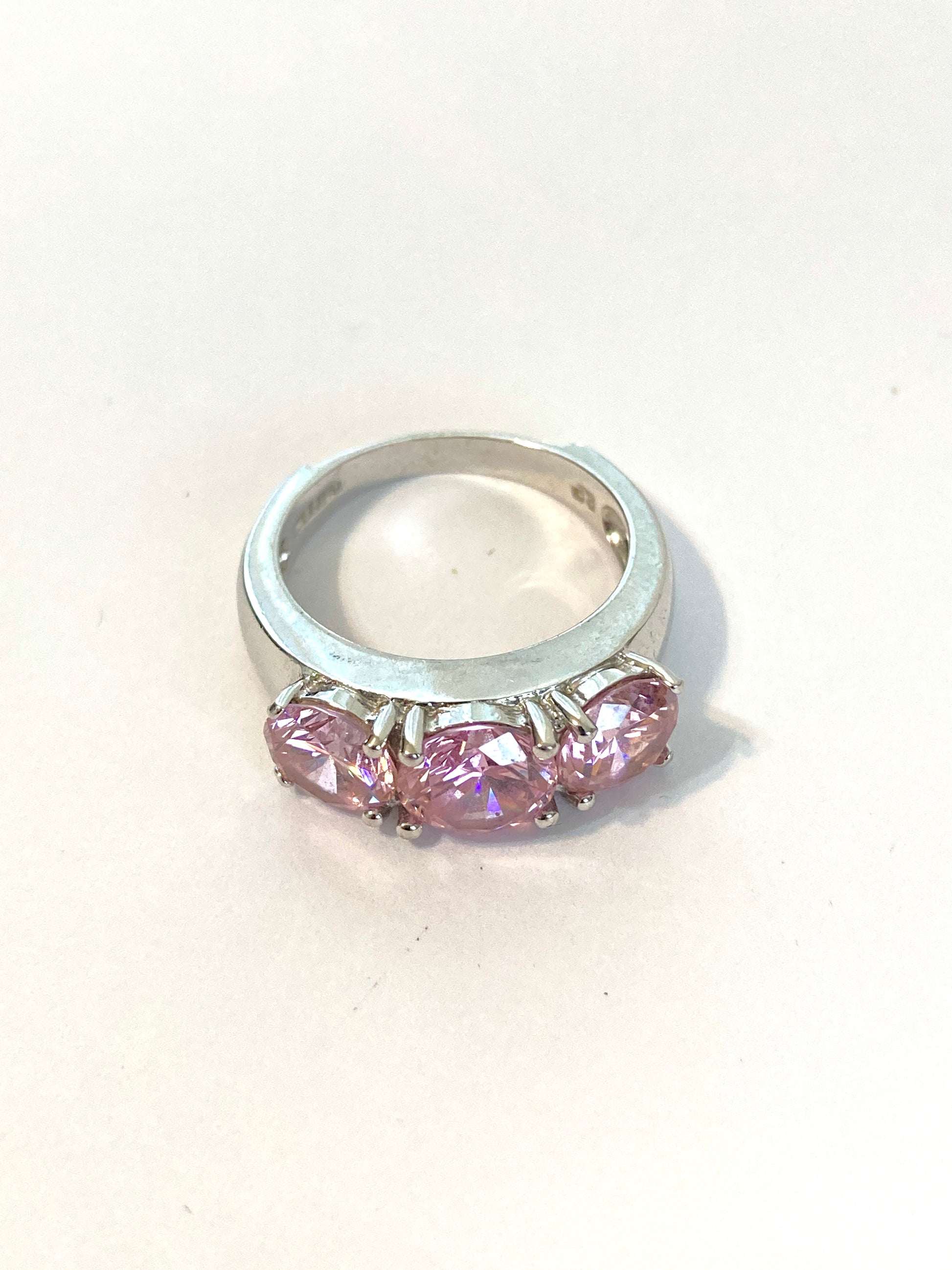 Pink 3 Stone Ring Rhodium Plated Silver Size 6 1/2