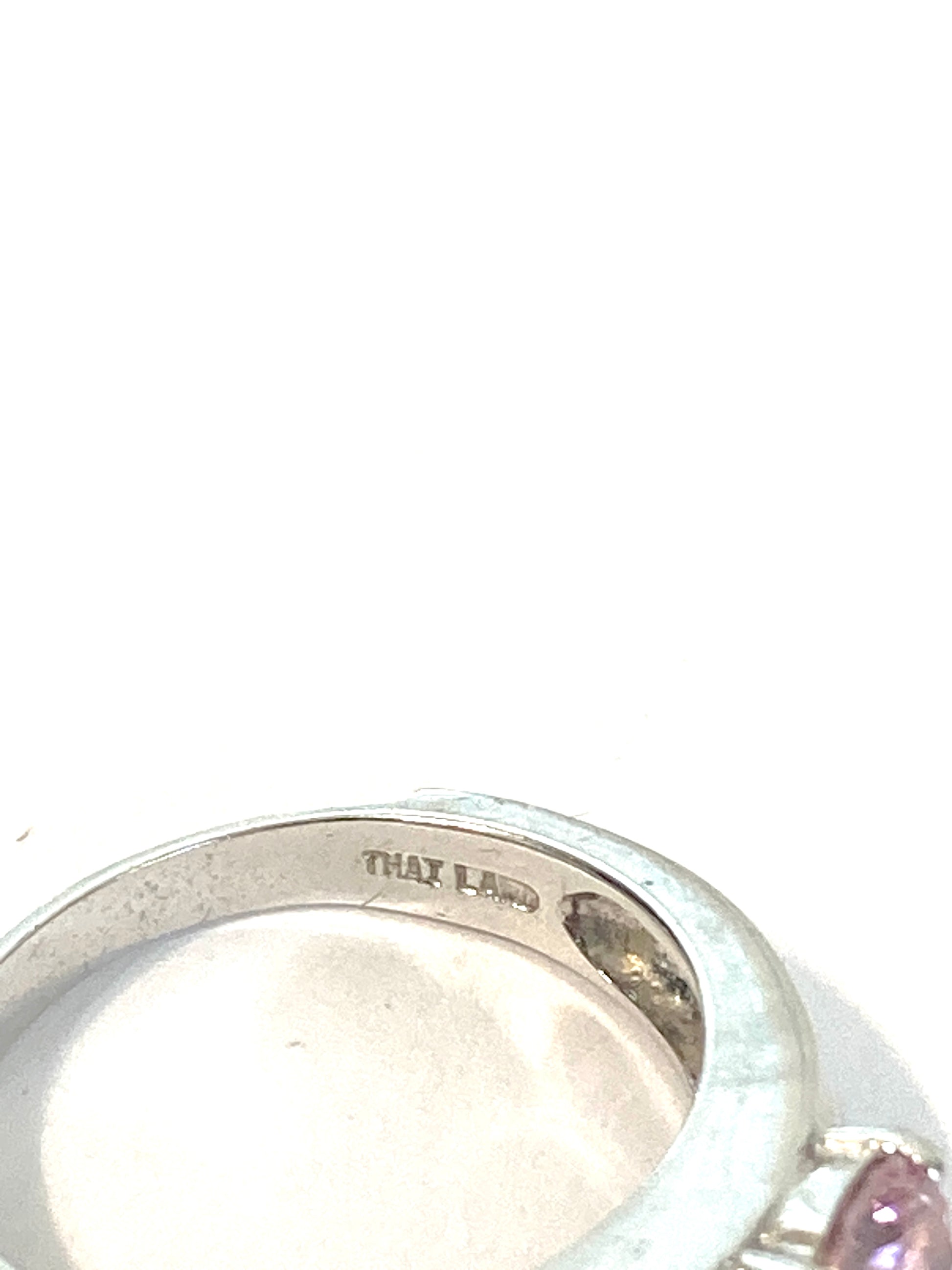 Pink ring with 3 stones set in Rhodium plated silver. Features three large pink stones in a row. The center stone is slightly larger than the other two. Bright light pink beautifully round faceted stones are prong set on a nice thick and bright silver Rhodium band. Marked made in Thailand. Absolutely stunning! Center back of band is narrower for sizing.