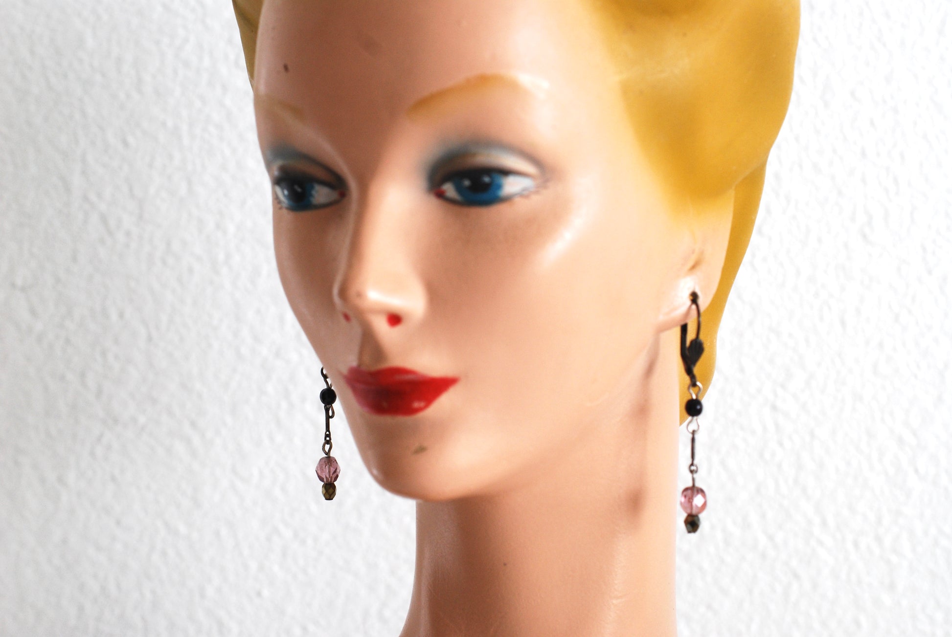 Just enough sparkle to catch the light, not too much to be distracting. These delicate purple drop earrings hang from burnished bronze ear wires with back closures. They feature a single deep purple round bead with a silver drop and lavender faceted bead ending in a small faceted purple AB bead. Simple and easy to wear. Great for everyday use as the back closure ensures they won't fall out. Great for a young lady or someone who wants a bit of color without too much fuss.
