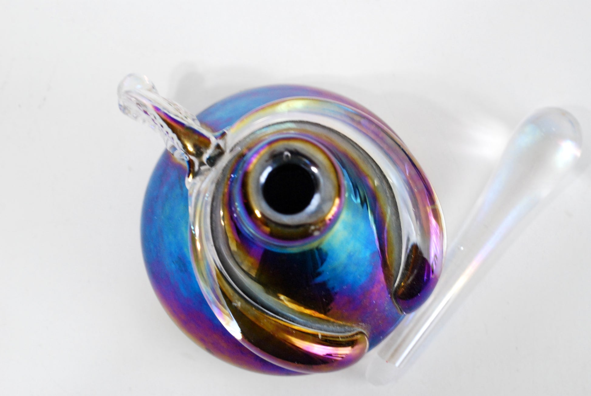 Beautifl handblown irridescent glass perfume bottle. This gorgeous bottle features a single clear wing or tail and two sweeping "arms" giving it the look of an angel with the stopper as the head. The stopper is made of clear irridescent glass while the bottle is done in shades of purple, blue, and amber. There remains part of a label on the base but it no longer is legible. The pontil mark on the base is uneven and sharp. There are no makers marks on this piece.