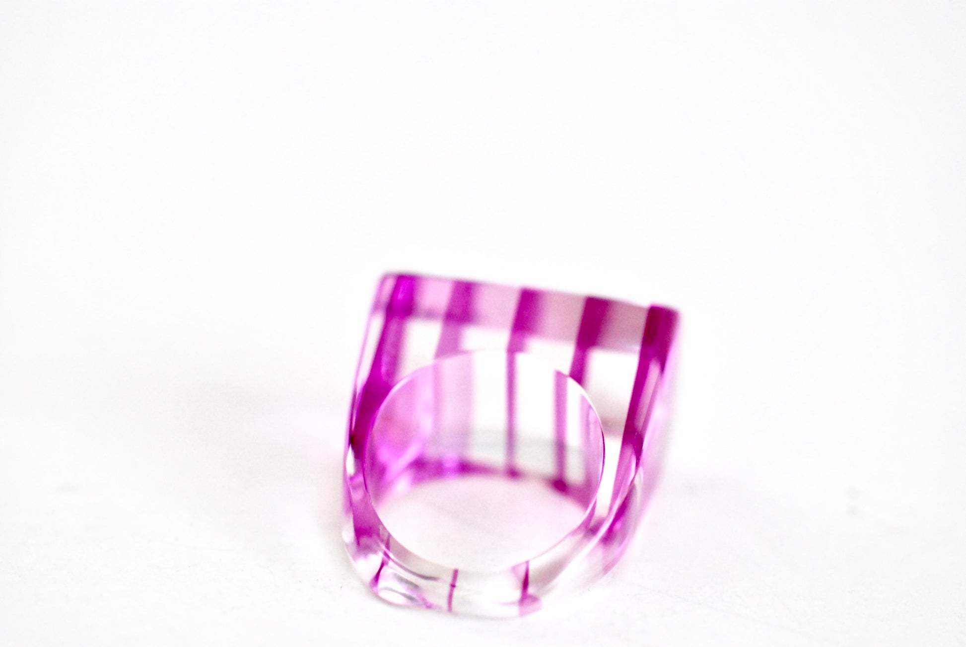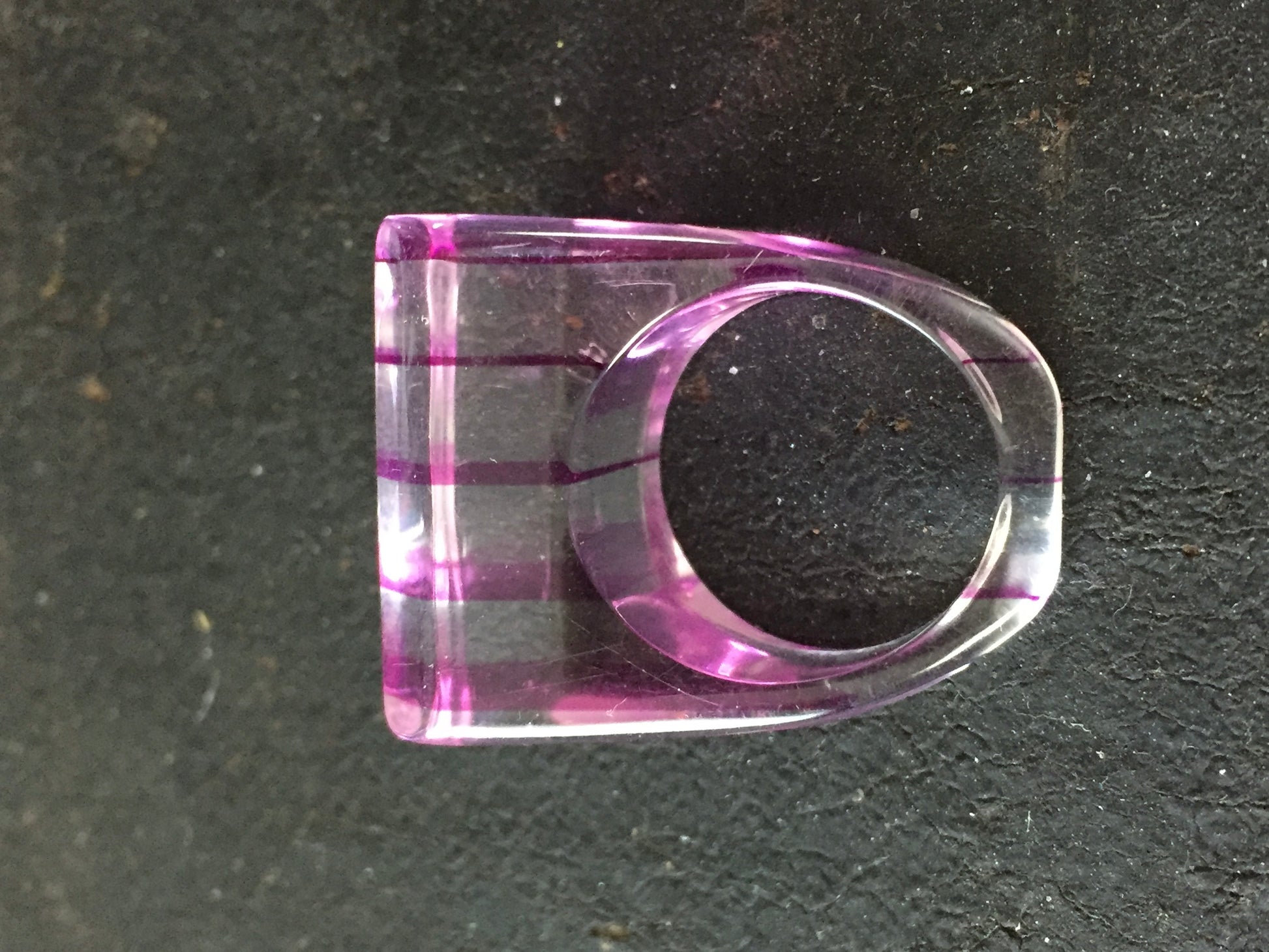 Purple and clear lucite, this ring is right out of the late 1960's. It features a striped rectangular shape. Appears to have never been worn. It came from the estate of a woman who loved colorful jewelry. Chunky and fun to wear, it would make a great addition to a vintage Boho look. Size 7 1/2.