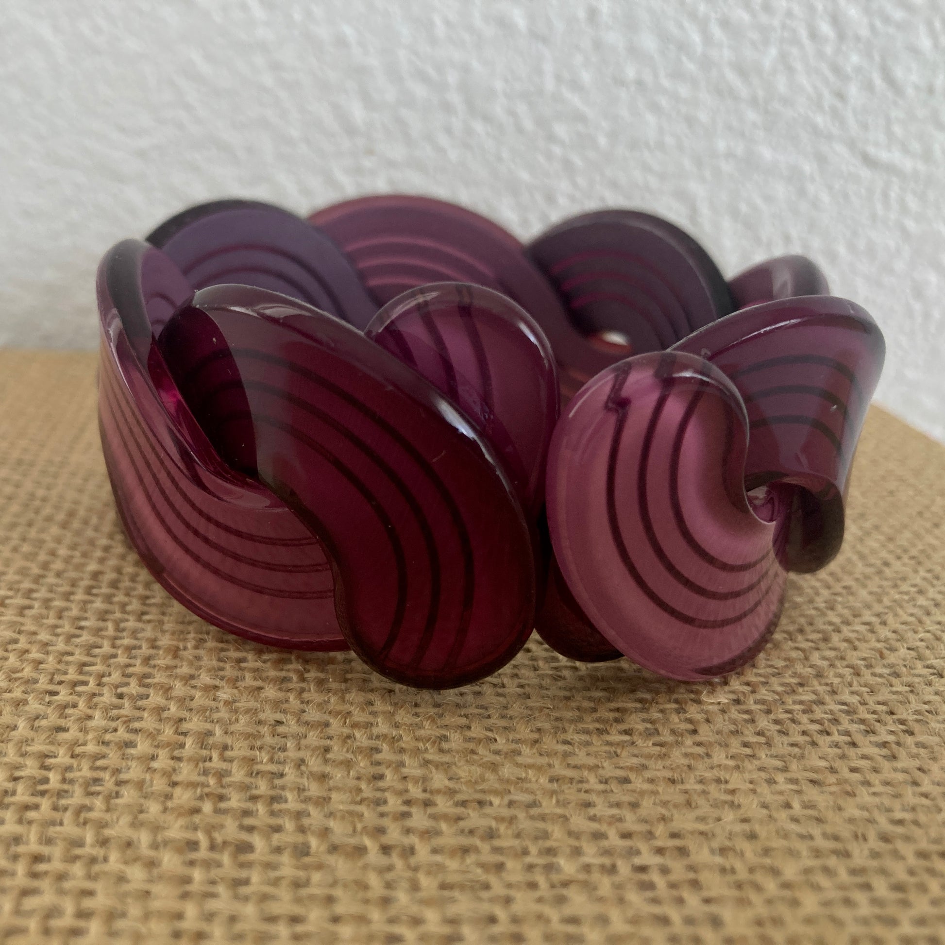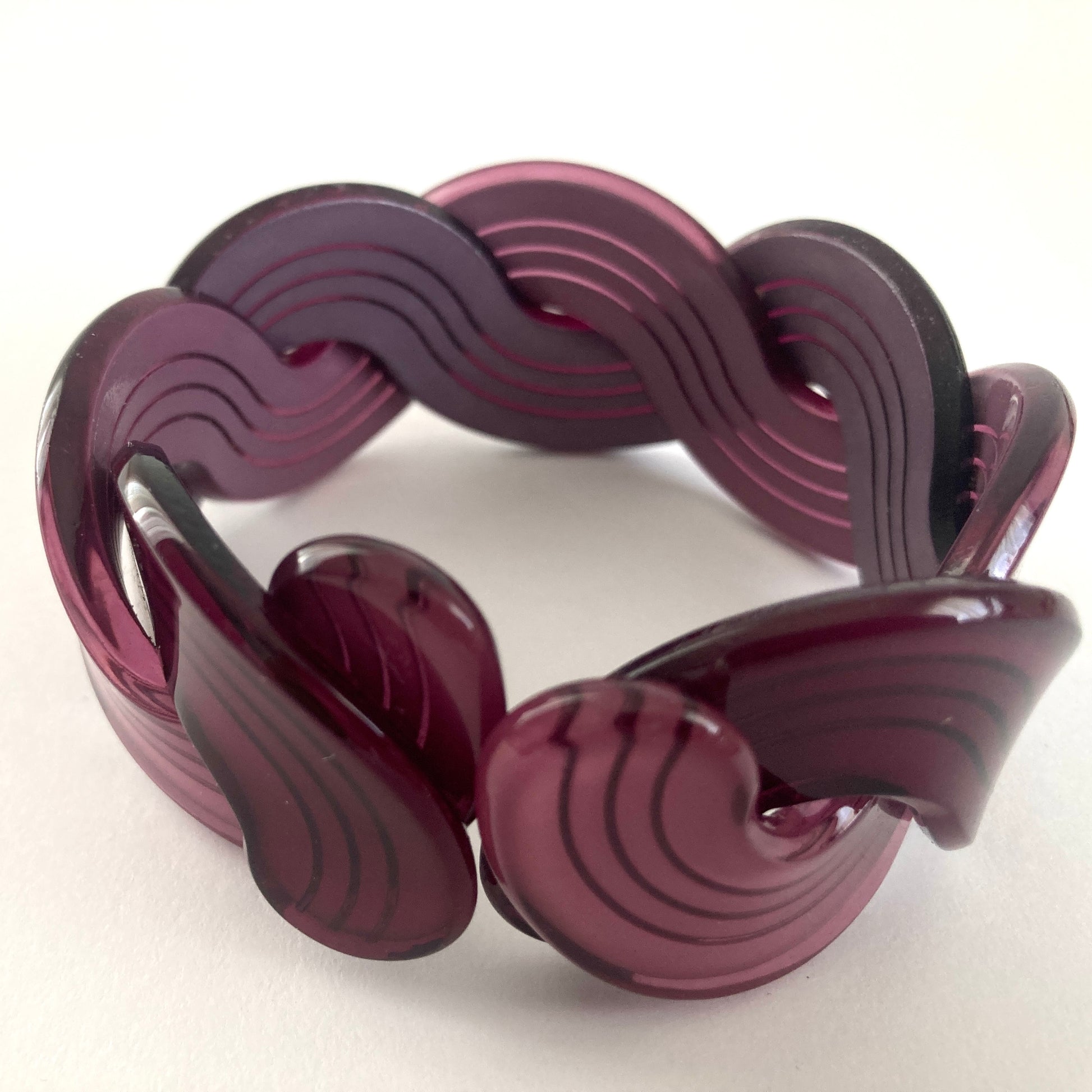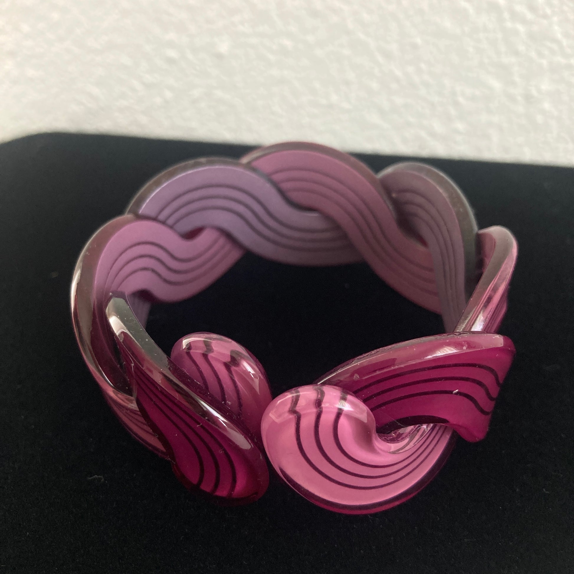Two wavelike layers of lucite woven together to form an open bangle bracelet. Featuring two slightly different shades of purple. Opens on one side to allow for easy on and off. Lightweight and great for stacking or making a statement on its own. Has a tiny defect that may be from manufacturing. It's only noticeable upon very close inspection.