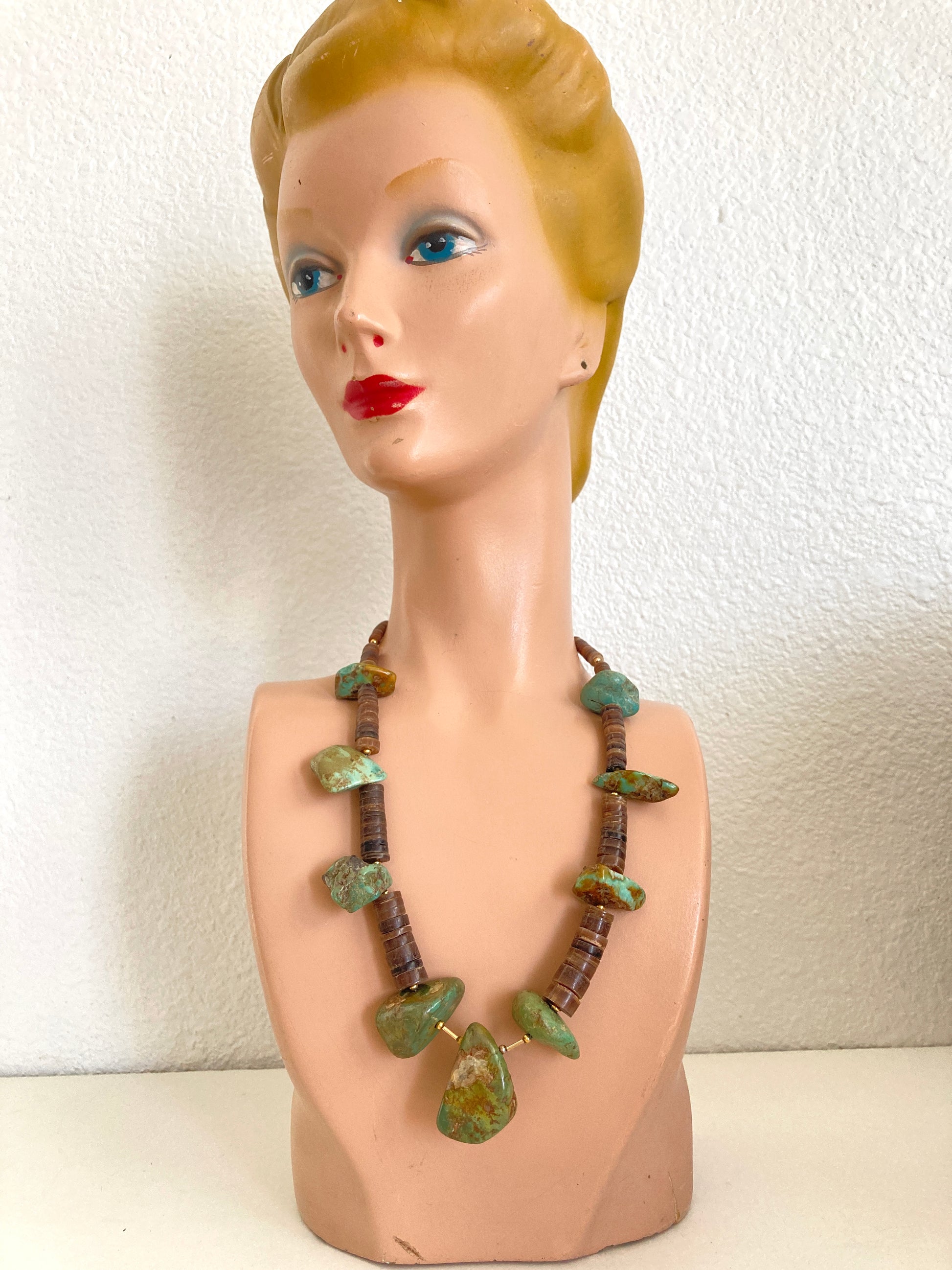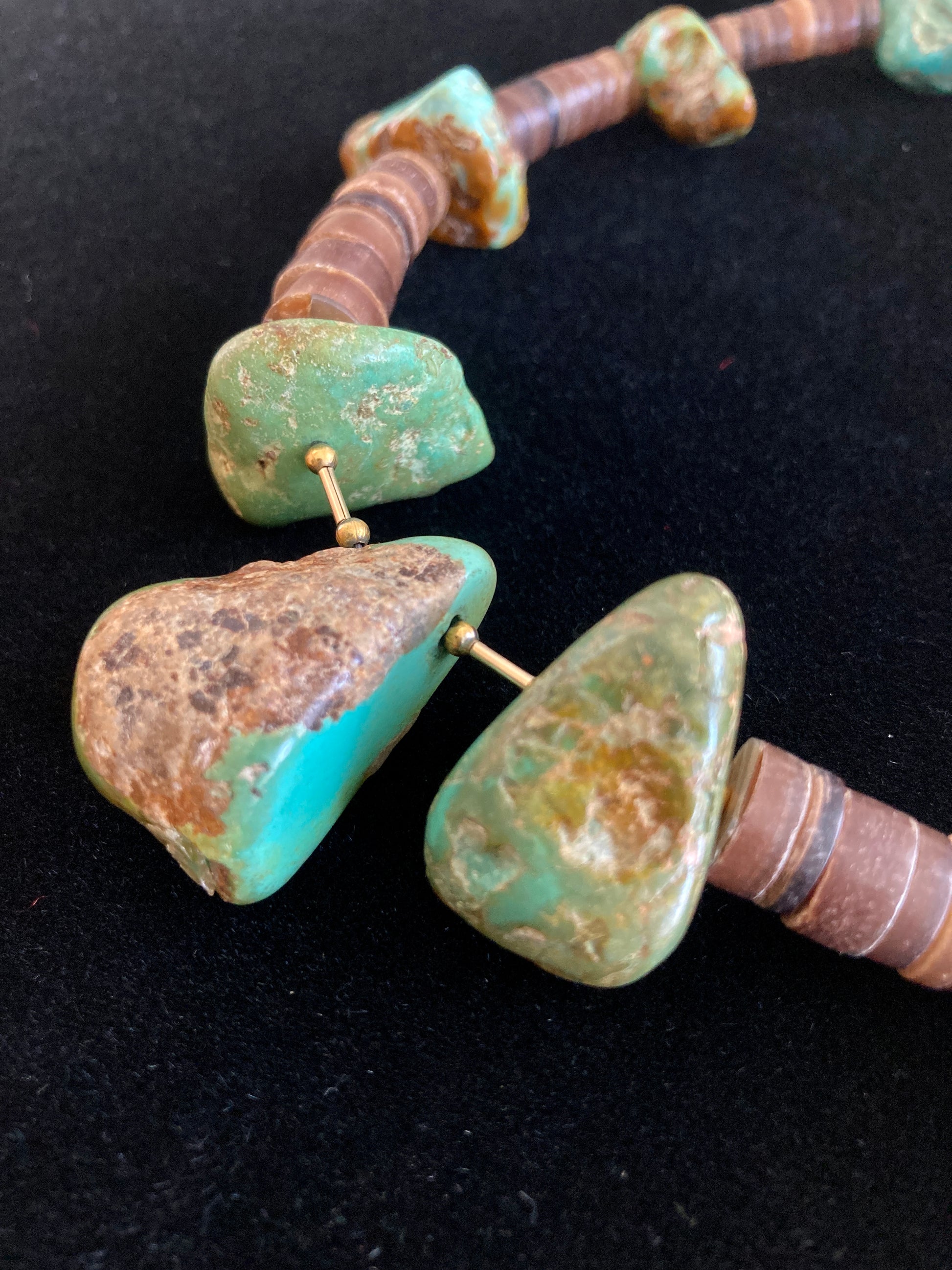 Here is a stunning raw chunky turquoise and heishi bead necklace strung with tiny brass tube and ball beads. The shell heishi beads are graduated and interspersed with large chunks of raw turquoise stones. The center stone is the largest. The chunks of turquoise feature both blue and green turquoise as well as bits of natural rock. The necklace is choker length and sits comfortably at the nape of the neck. It has a nice substantial weight to it. A fabulous necklace from the 1970s fully restored and ready to wear.