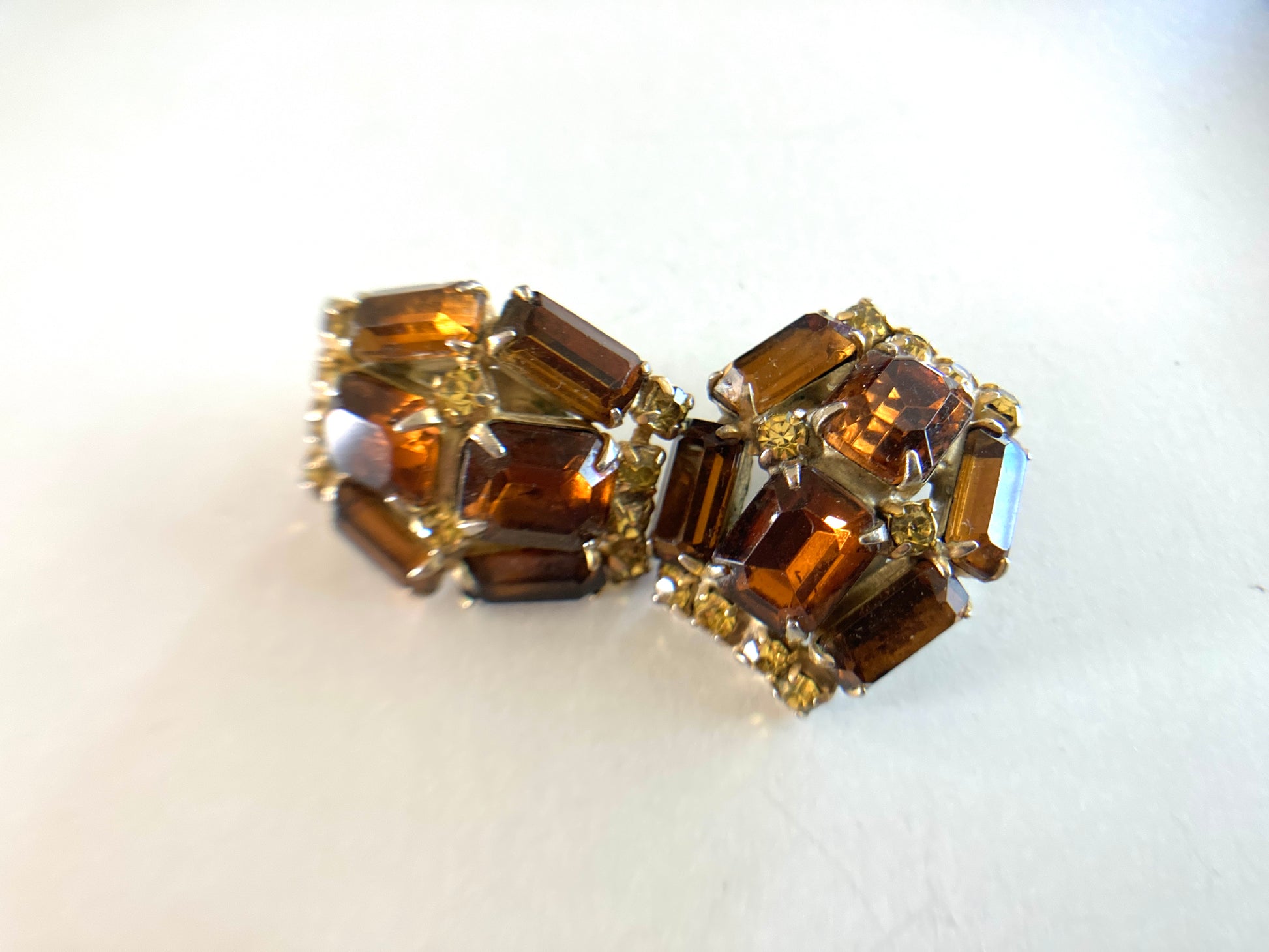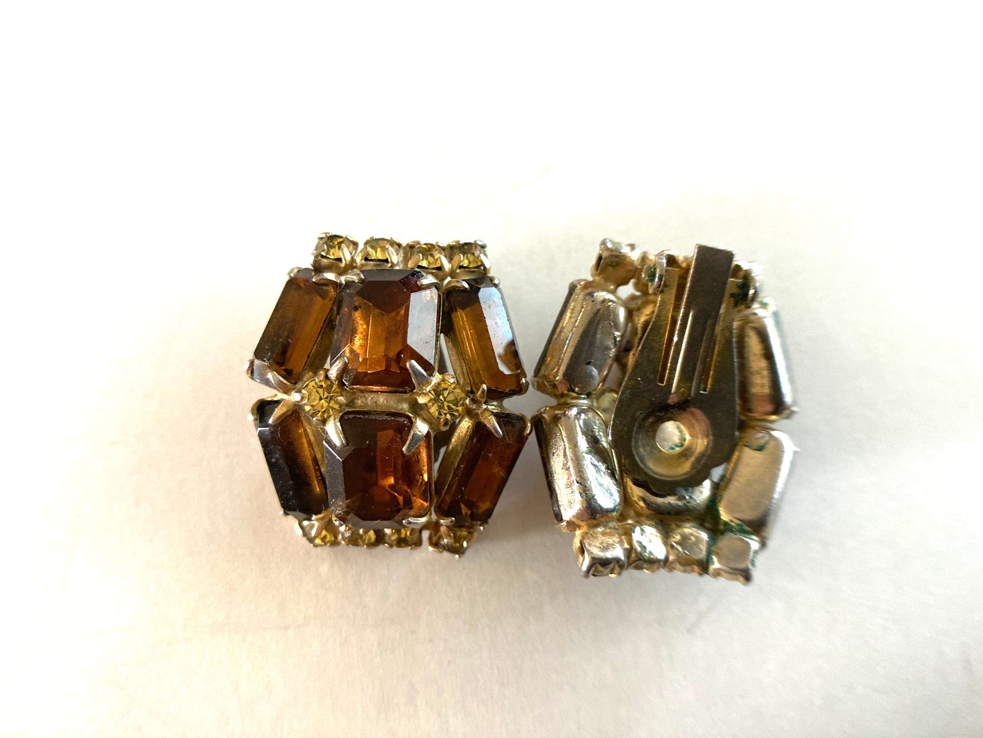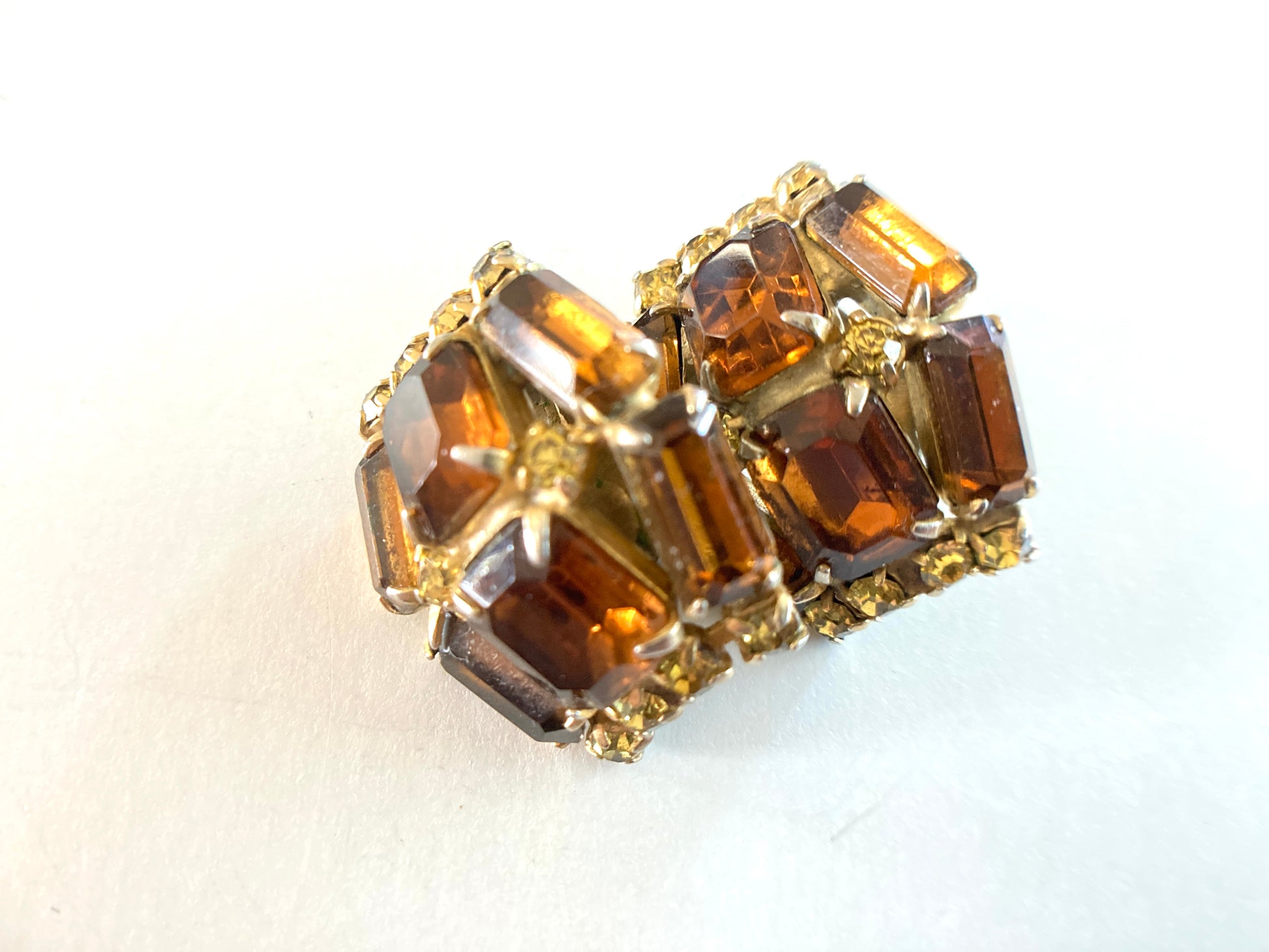 Here's an unusual pair of vintage brown and golden amber rhinestone earrings. They feature two rows of rectangular-shaped rhinestones set at an angle to each other with small golden amber stones set along the edges and between the larger stones. They are clip-on style earrings with no markings and are set on closed backs. A very pretty and unusual pair of earrings from the 1950s or early 60s.