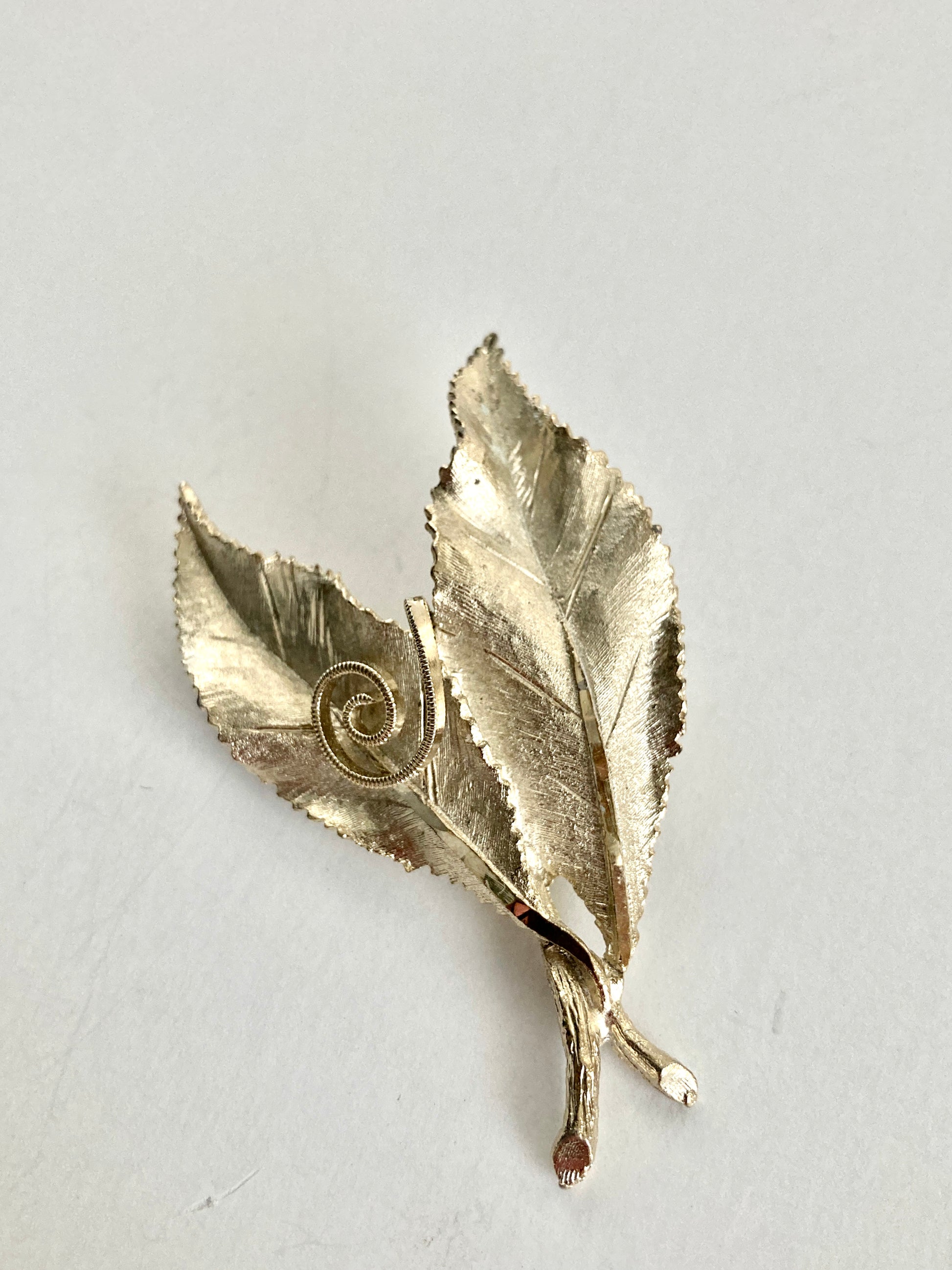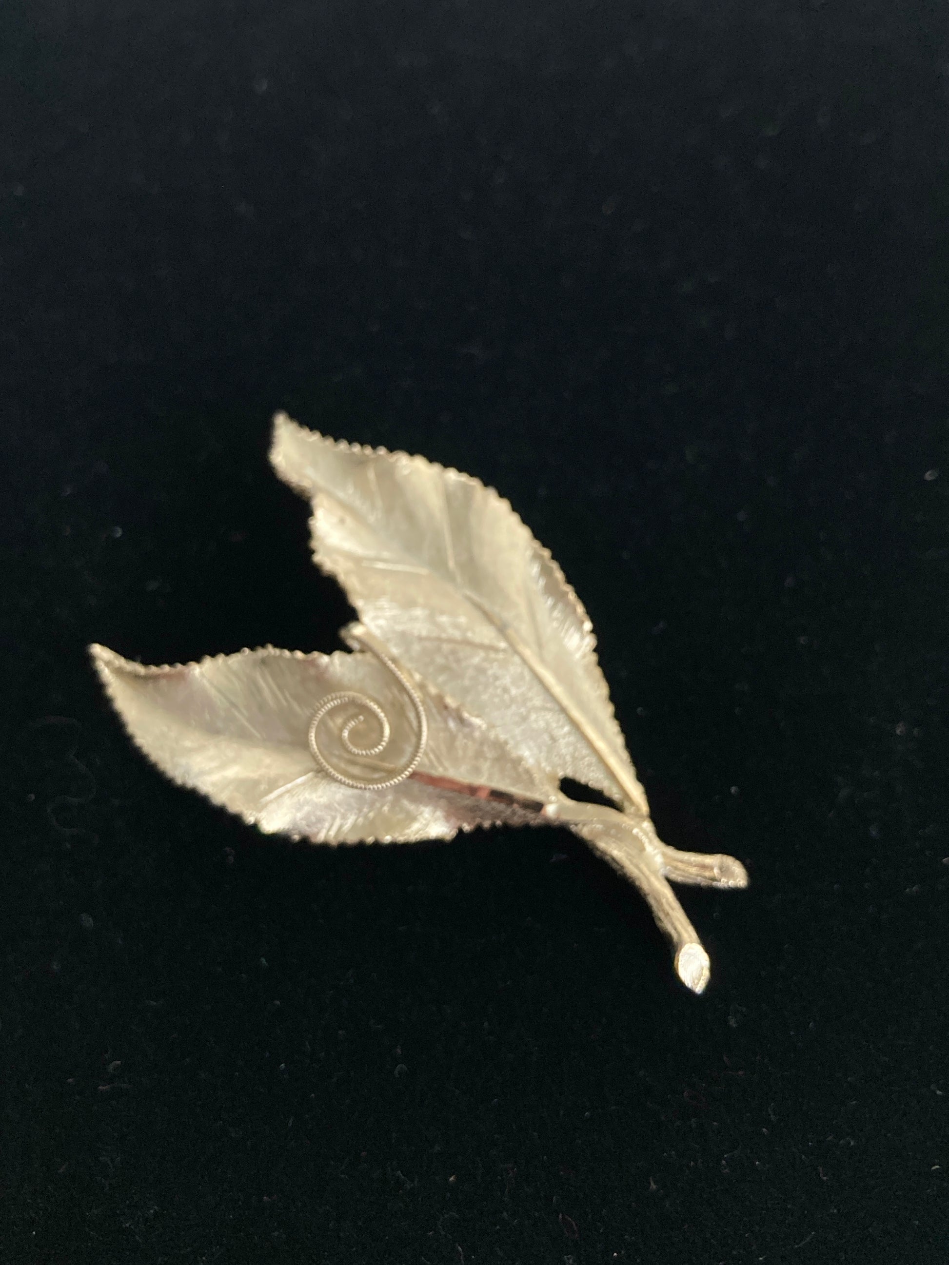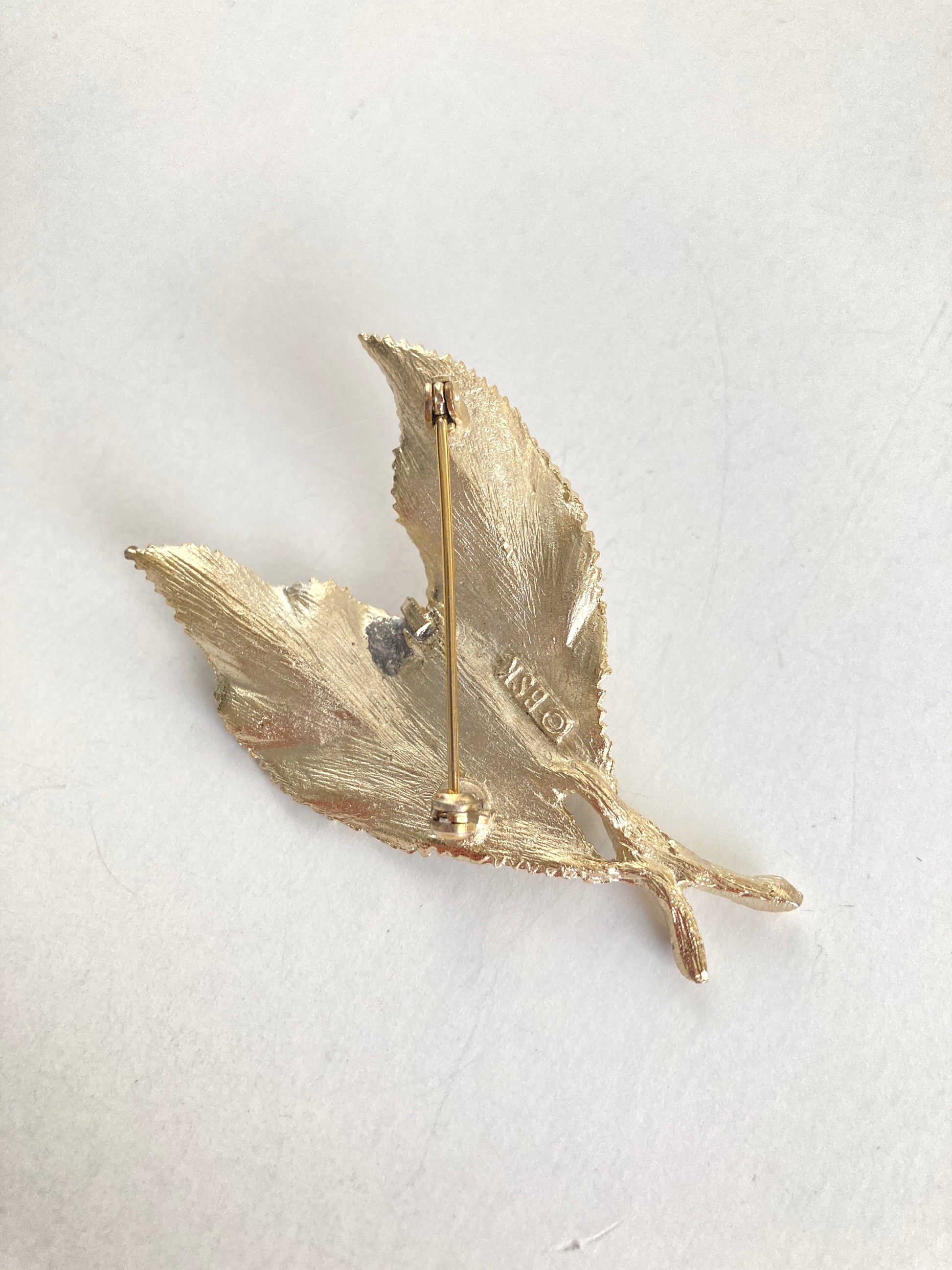This textured double leaf brooch in gold-tone metal feature a single tendril. The base of the leaves are crossed and the clasp is set on an angle tilting the leaves to one side. Stamped on the back and in excellent condition. There is one dark spot on the back which looks as if someone may have tested the metal.
