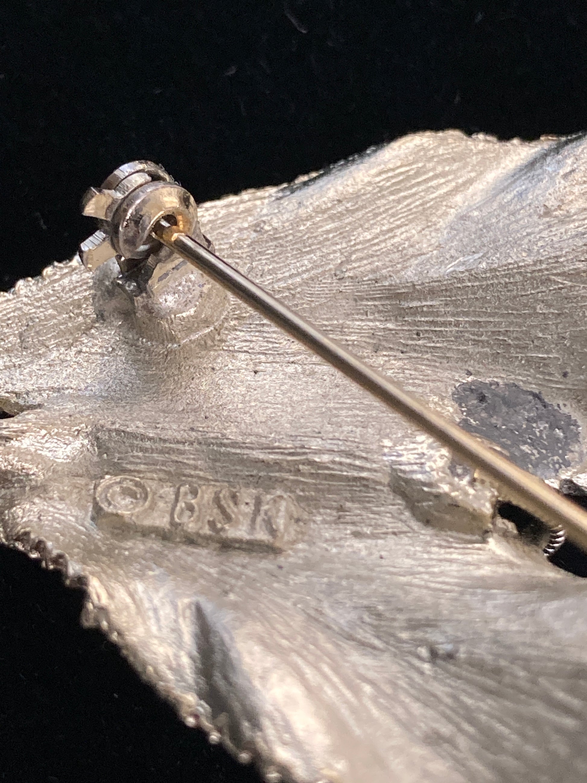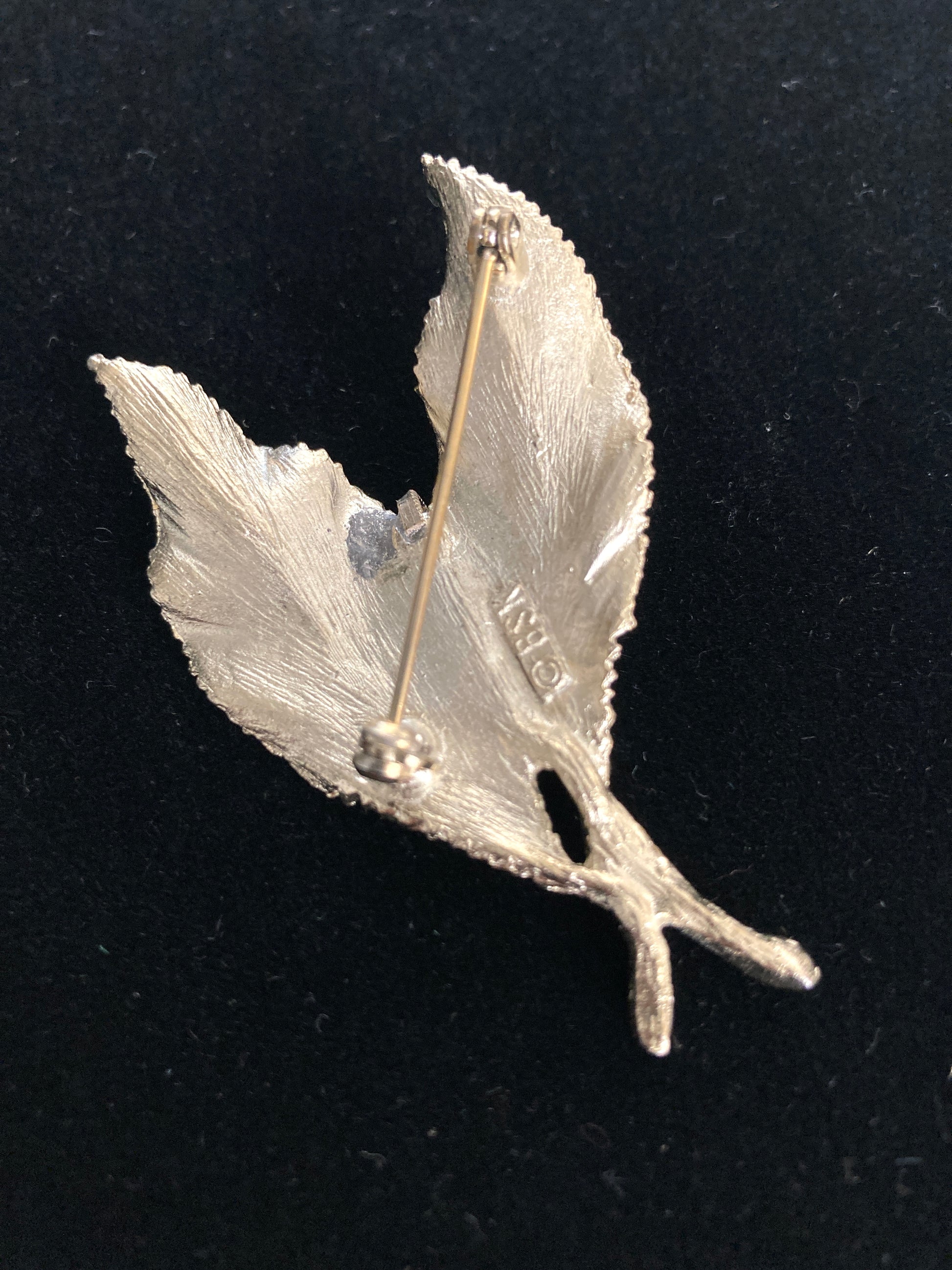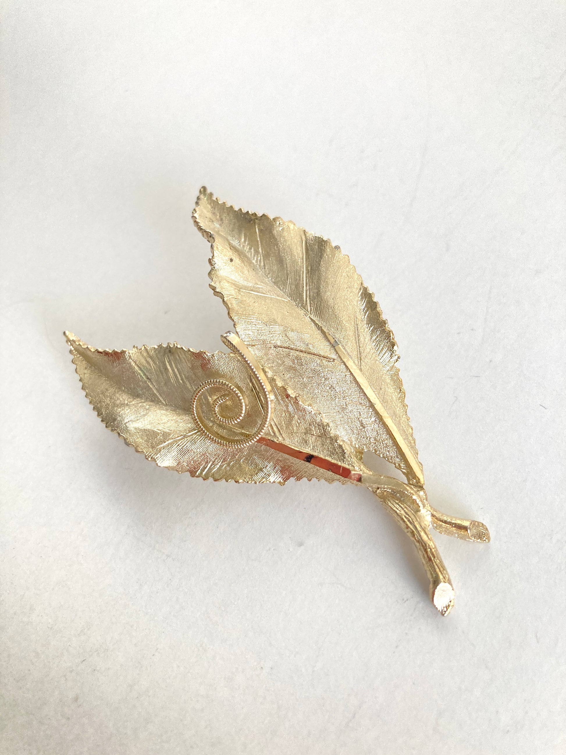 This textured double leaf brooch in gold-tone metal feature a single tendril. The base of the leaves are crossed and the clasp is set on an angle tilting the leaves to one side. Stamped on the back and in excellent condition. There is one dark spot on the back which looks as if someone may have tested the metal.