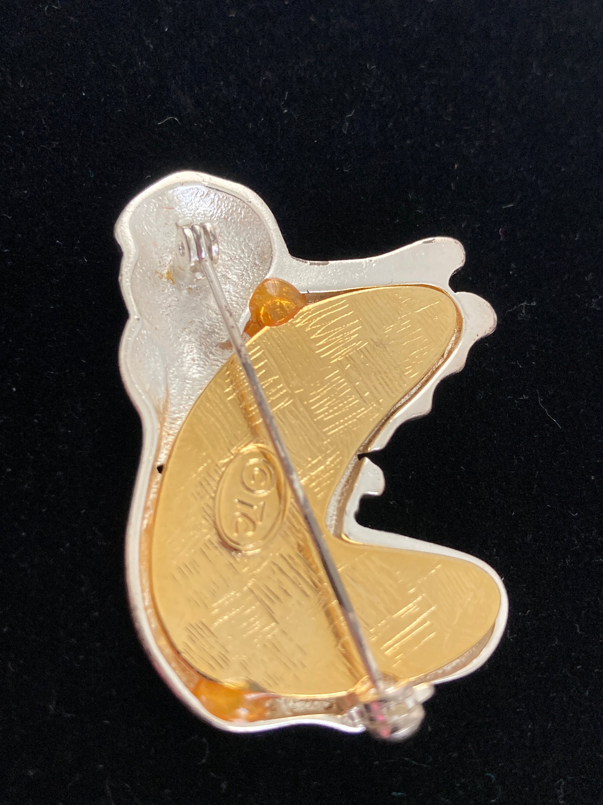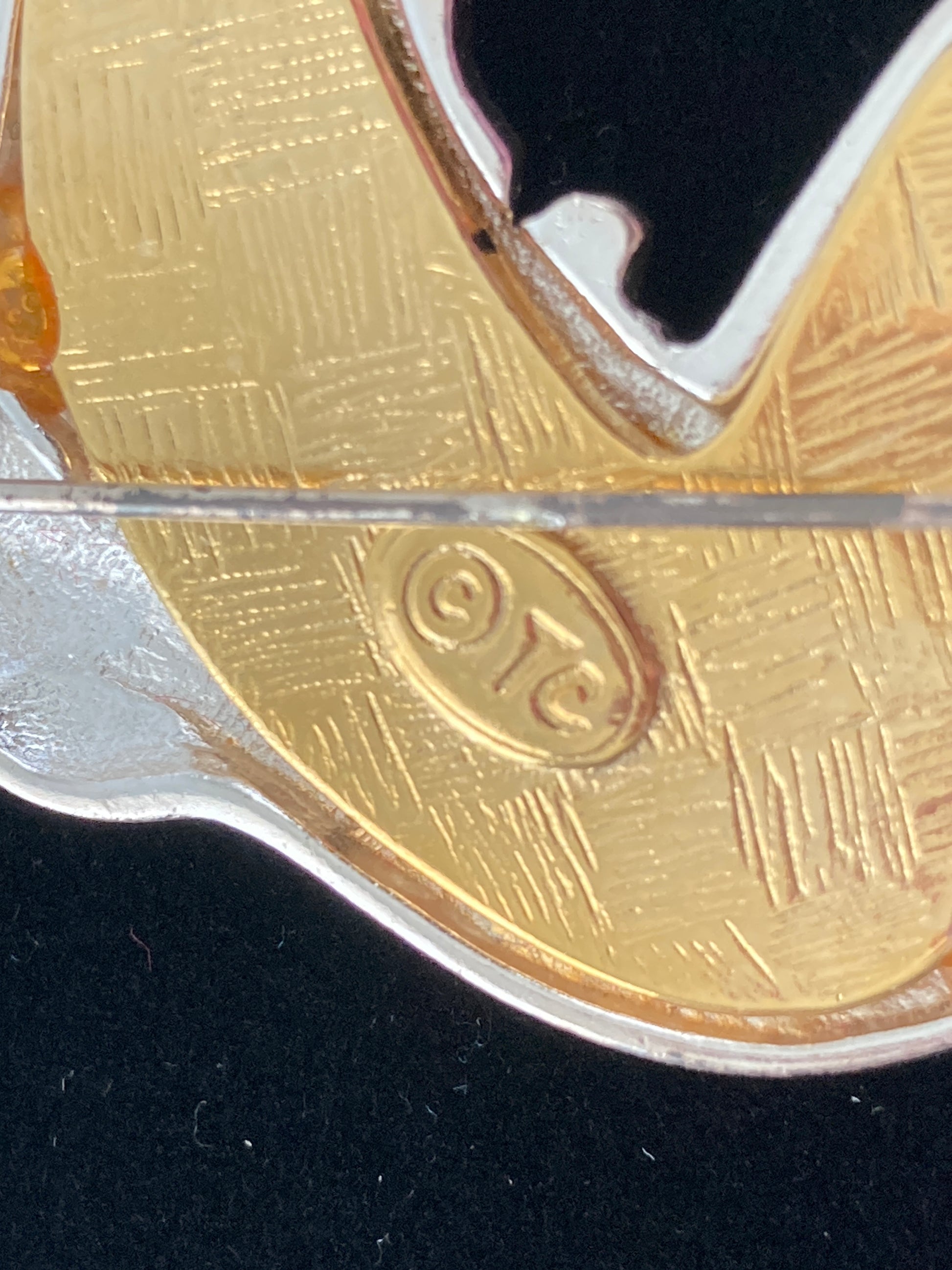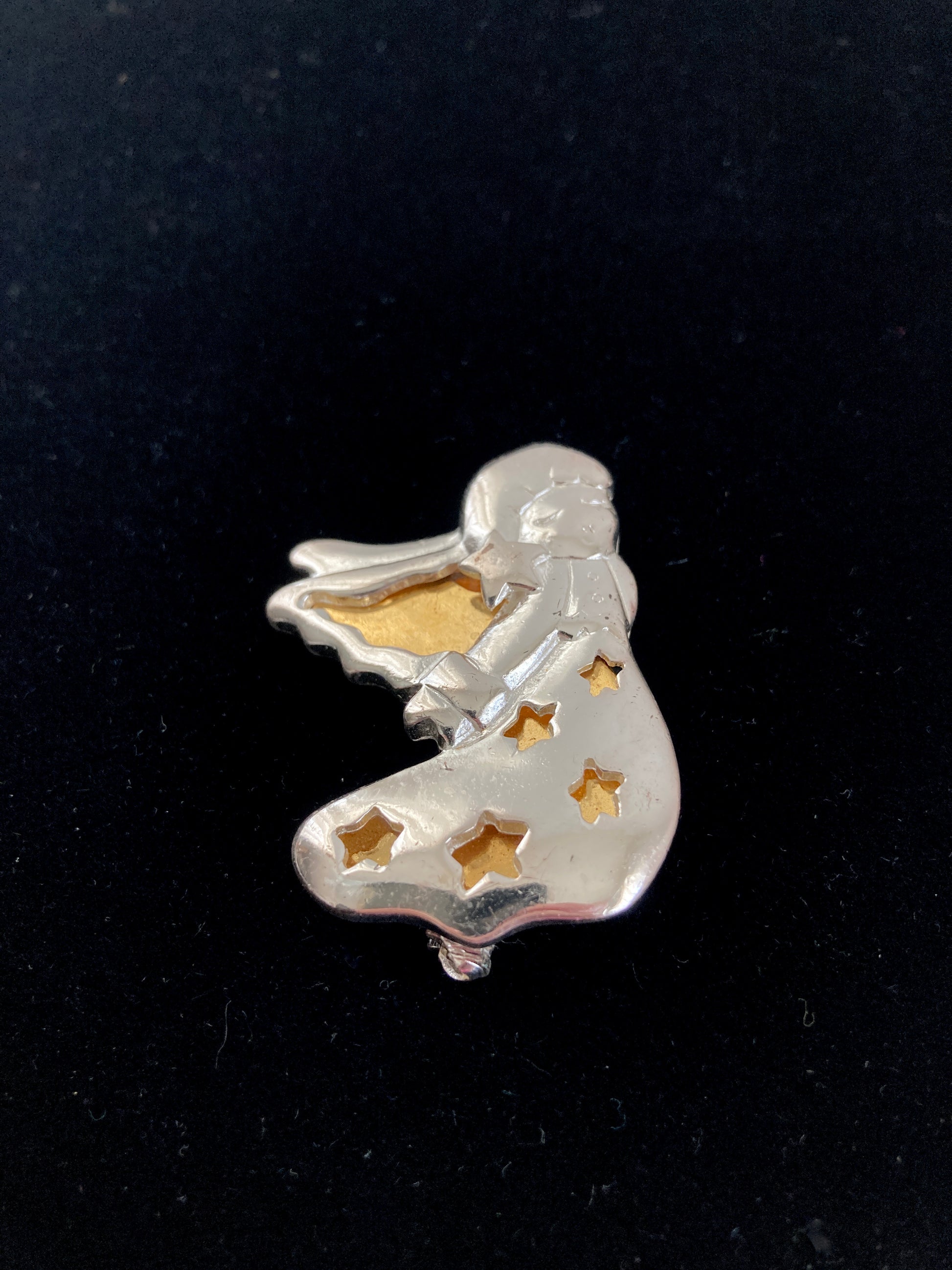 This darling little angel's gown is filled with stars. She has a sleepy look on her face as if her eyes are closed. Her wings and gown have cutouts showing the goldtone metal beneath the bright silver. She is marked ©TC on the back. The long portion of the pin on the back has lost some of its plating, otherwise, there are only minor signs of wear.