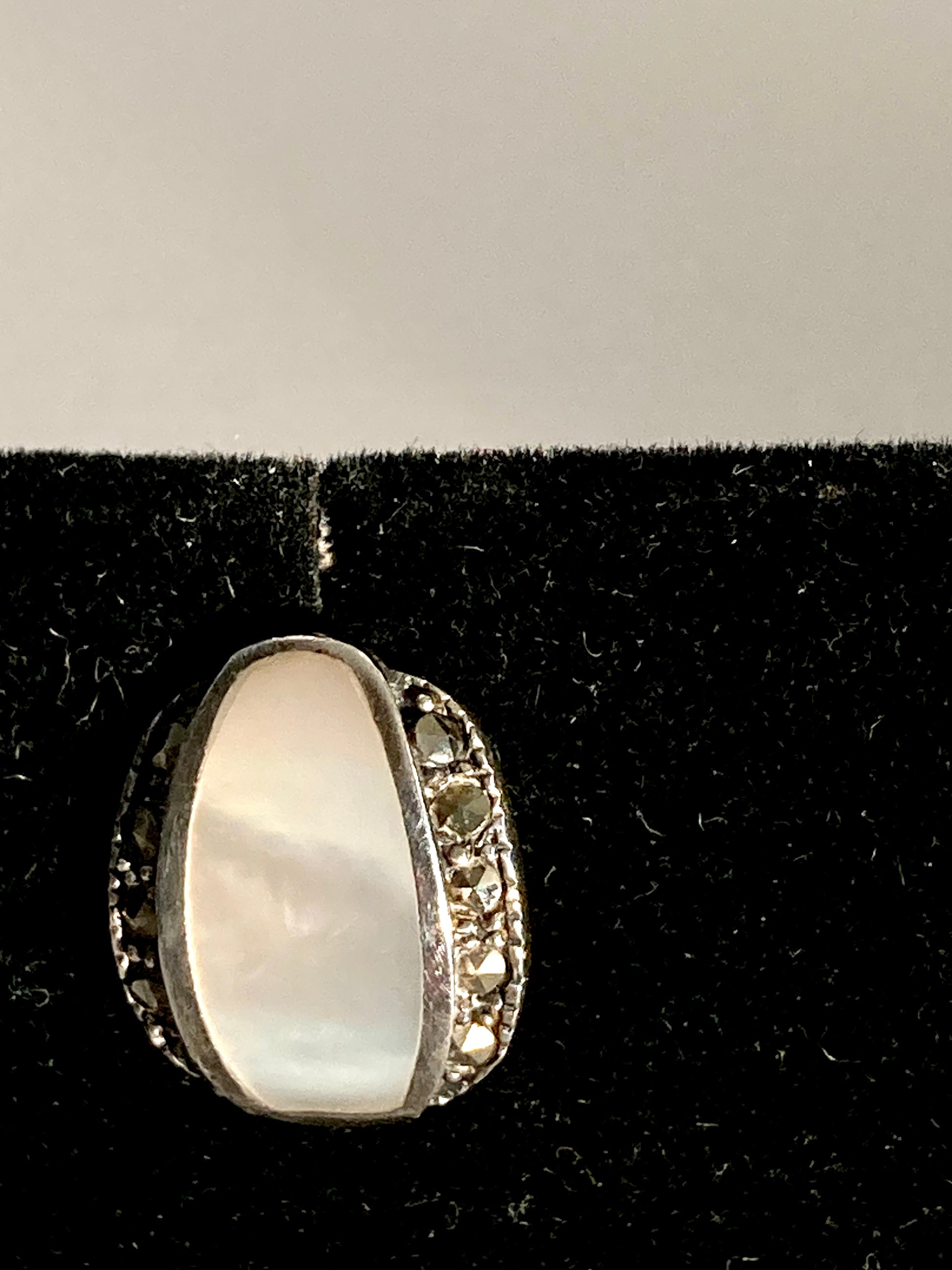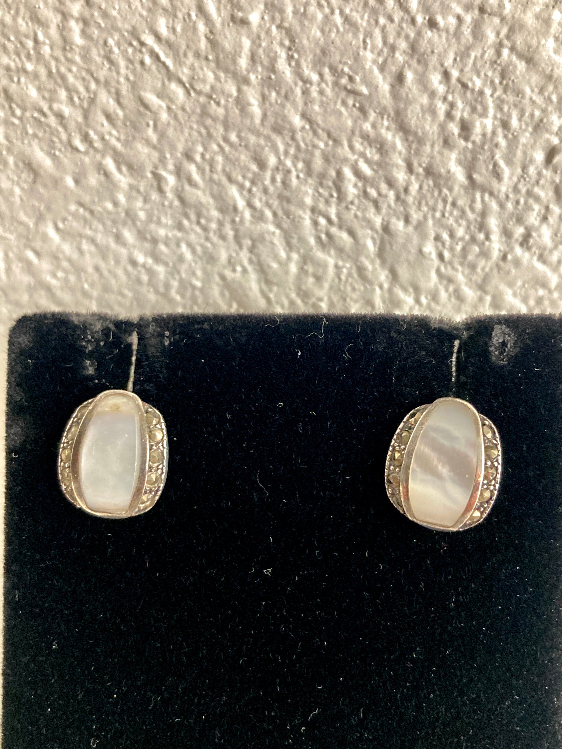These delicate and small earrings are not too flashy. They are dainty with just a touch of sparkle. Made of 925 silver, with a row of tiny marcasites on either side of an oval cut polished piece of mother of pearl and set on silver post backs. Very pretty, and just enough to add a touch of elegance to your look.
