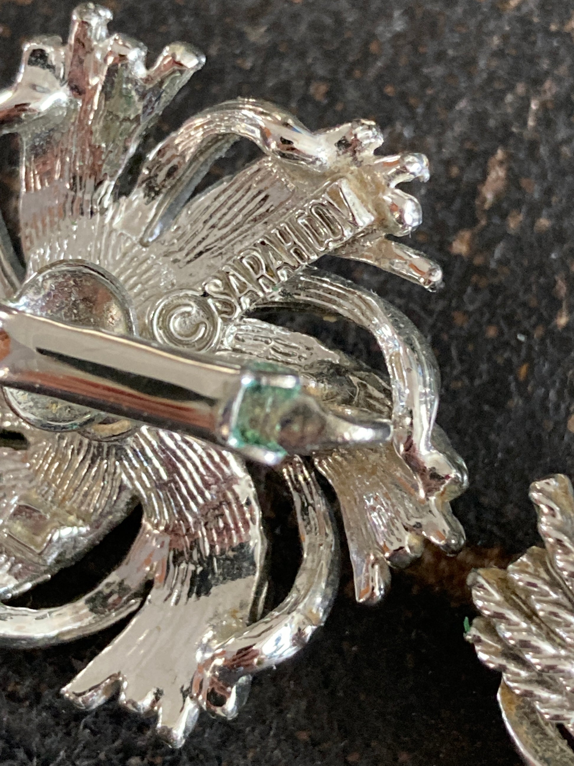 This sweet pair of Sarah Coventry earrings once had a matching brooch that has been long lost. The earrings are still fabulous, however. They feature a center faux pearl and textured radiating starbursts in bright silver-tone metal. Both earrings are marked on the back. One pearl has a tiny mark that can only be seen very close up. The backs are even marked with an L and R for left and right as the swirls go in opposite directions. These are clip-on earrings with nice strong clips.