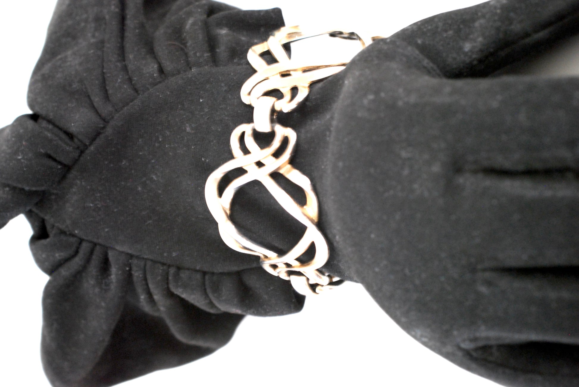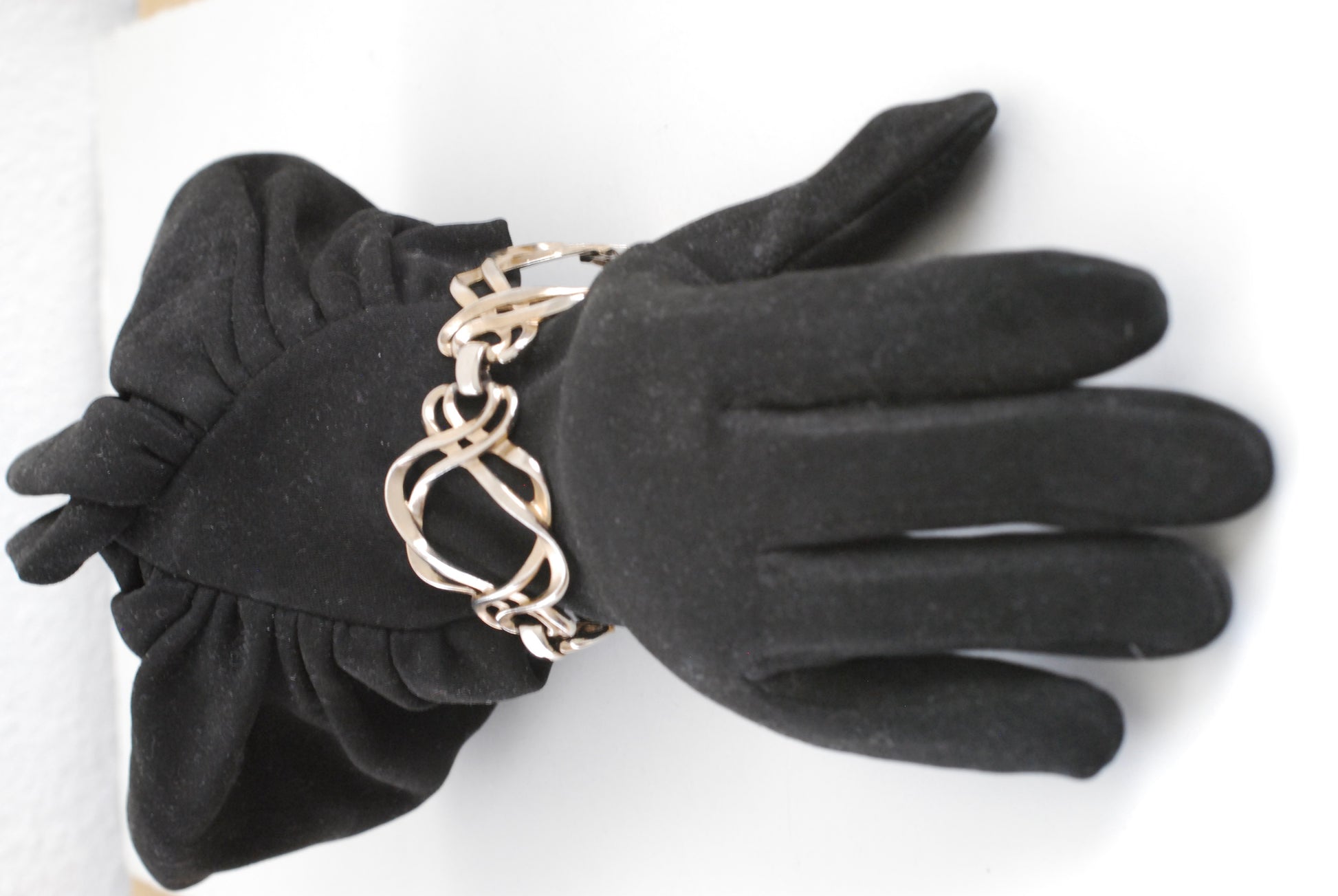This bracelet caught my eye right away. Both modern and classic it features three oversize open love knots hinged together with solid links and finished off with a double oval linked clasp. Done in silver tone plating over unknown metal it is both lightweight and statment making. There is a tiny area on the clasp where the plating has worn off. There are no markings as to maker or material. From an estate.