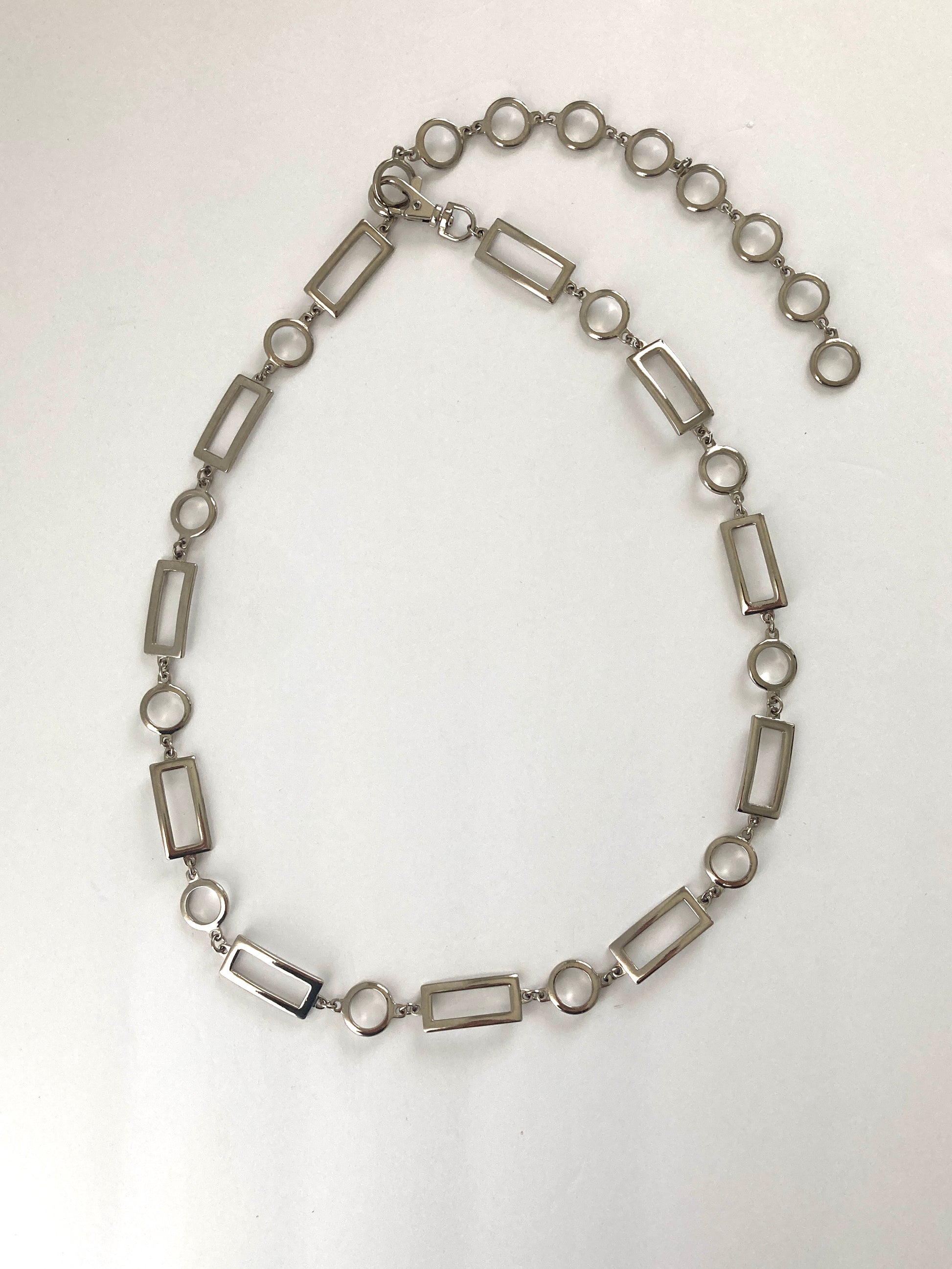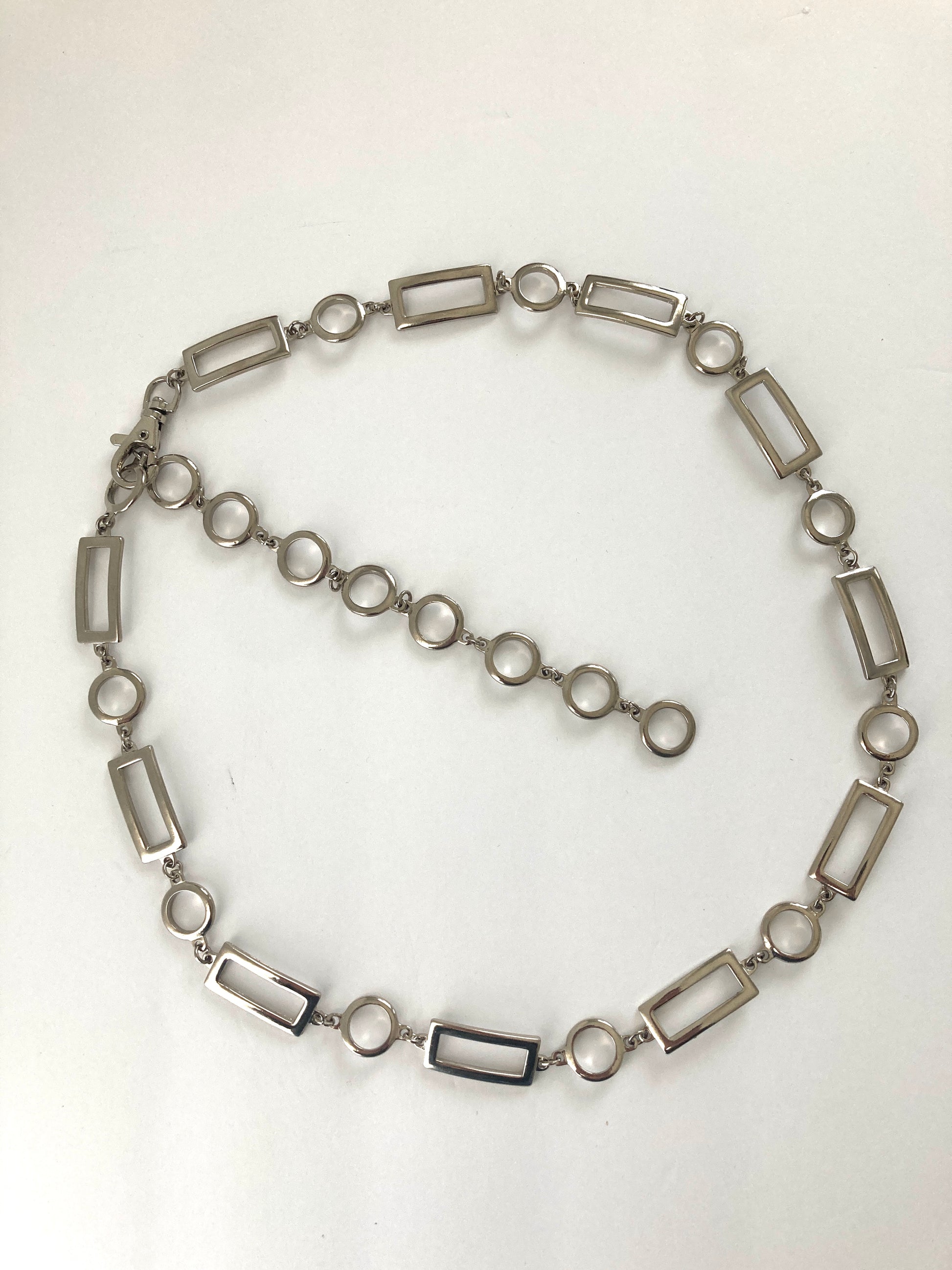 Hip-hugging style adjustable chain belt featuring rectangular and circle links. This slinky metal belt is stylish and on-trend. It would look great with jeans or cinching a simple dress or tunic. Made of shiny polished silver-colored metal.