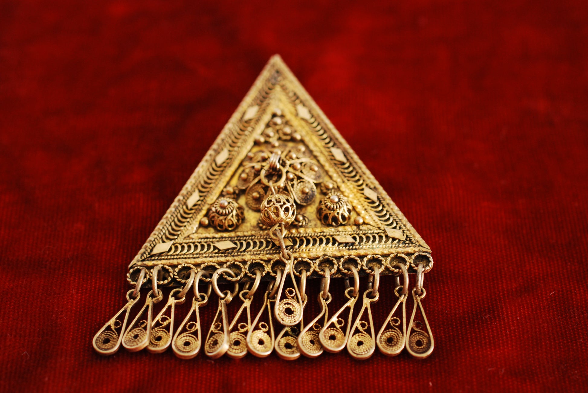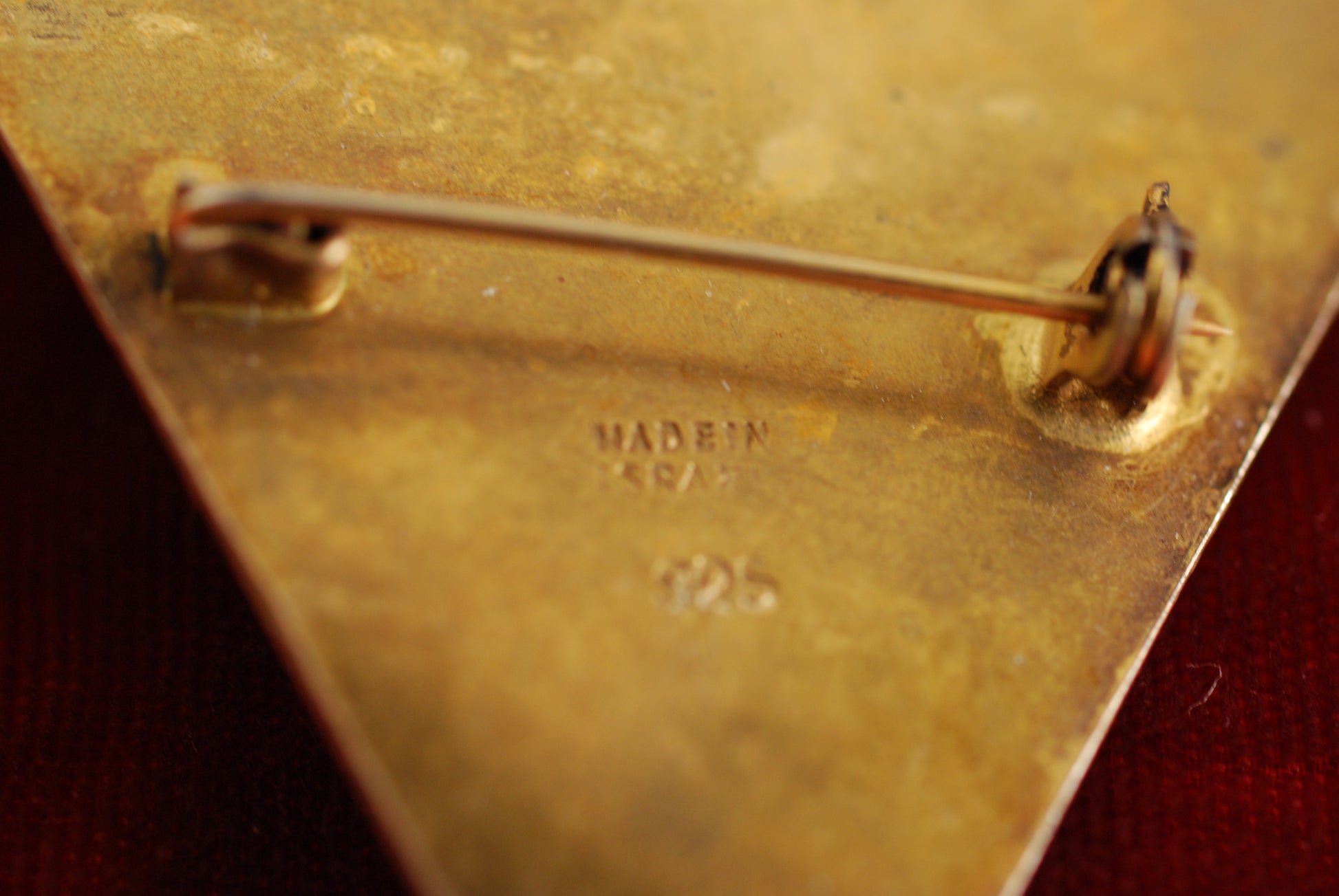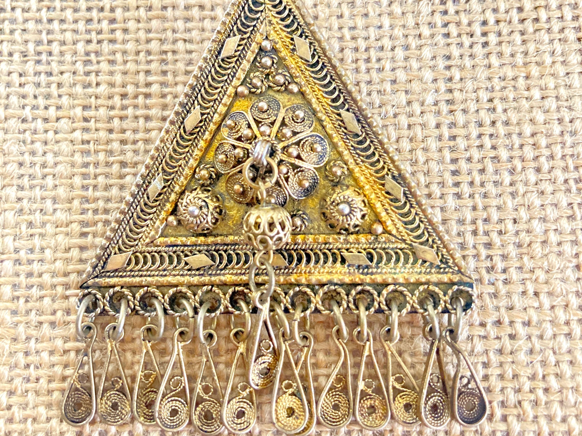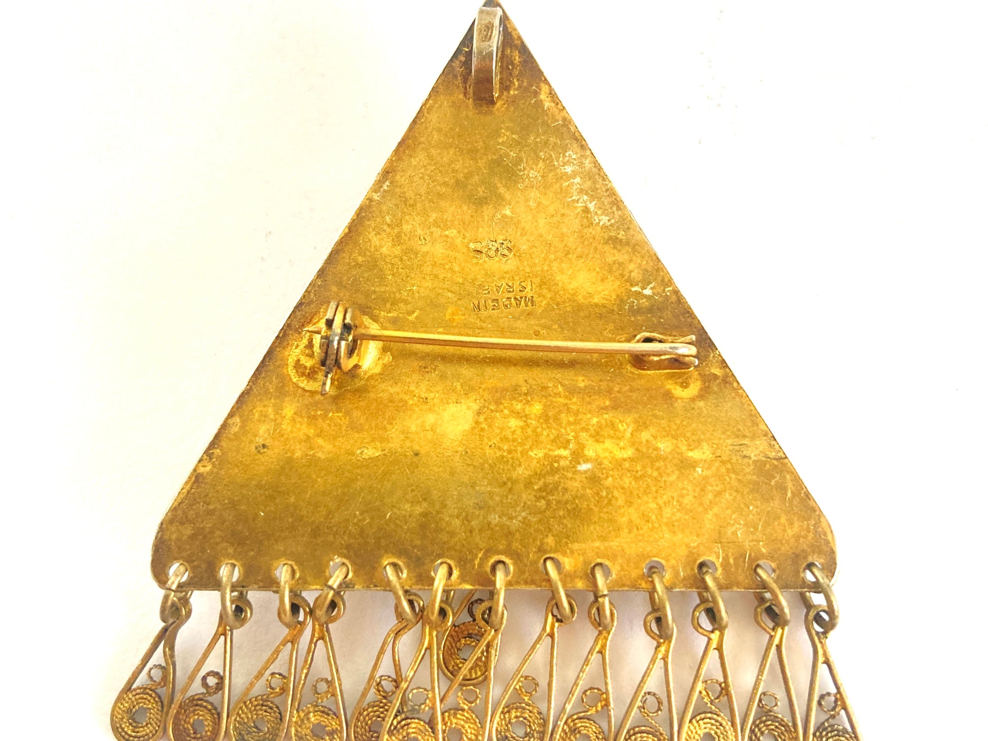 Lovely triangle shaped brooch/pendant combo with delicate filigree detail. This beautiful piece dates to the 1980's and was originally purchased in Israel. It features a center floral shape with a single filigree dangle. The bottom features 13 filigree dangles lined up along the edge. The three sides of the brooch feature rows of layered circles punctuated by small diamond shape overlays. Made of silver and overlaid with a gold vermeil wash, the piece is stamped "Made in Israel 925" on the back.