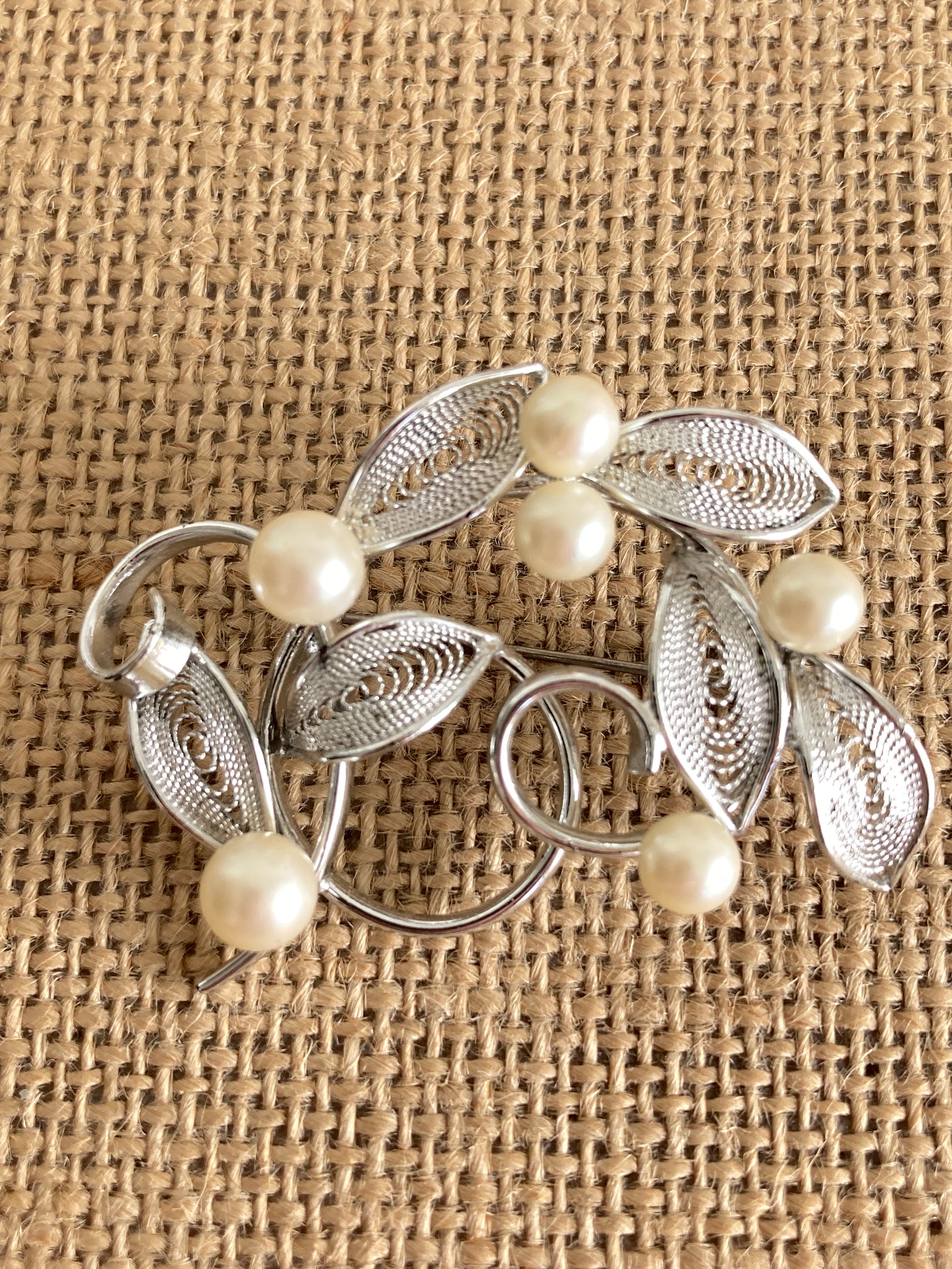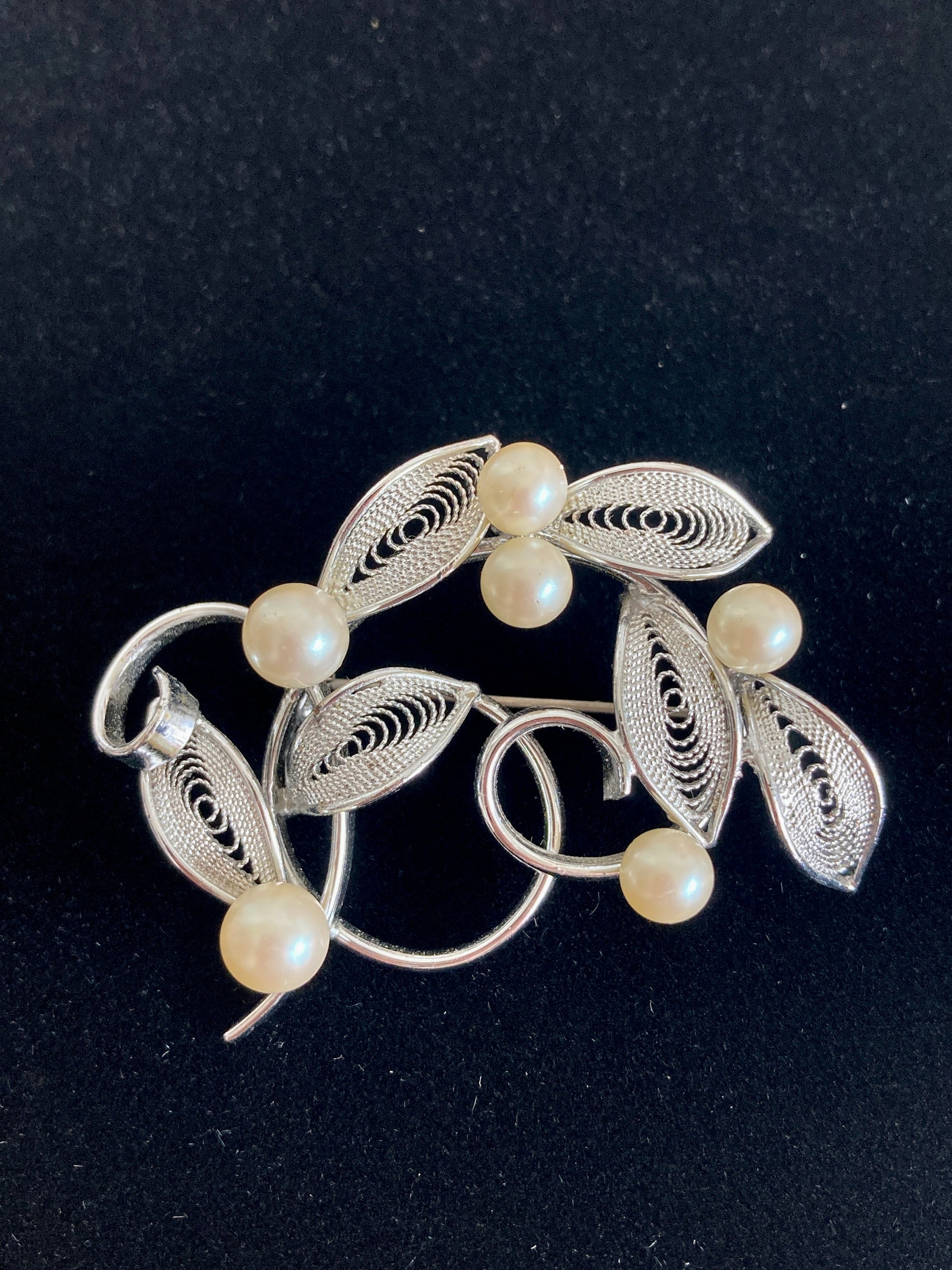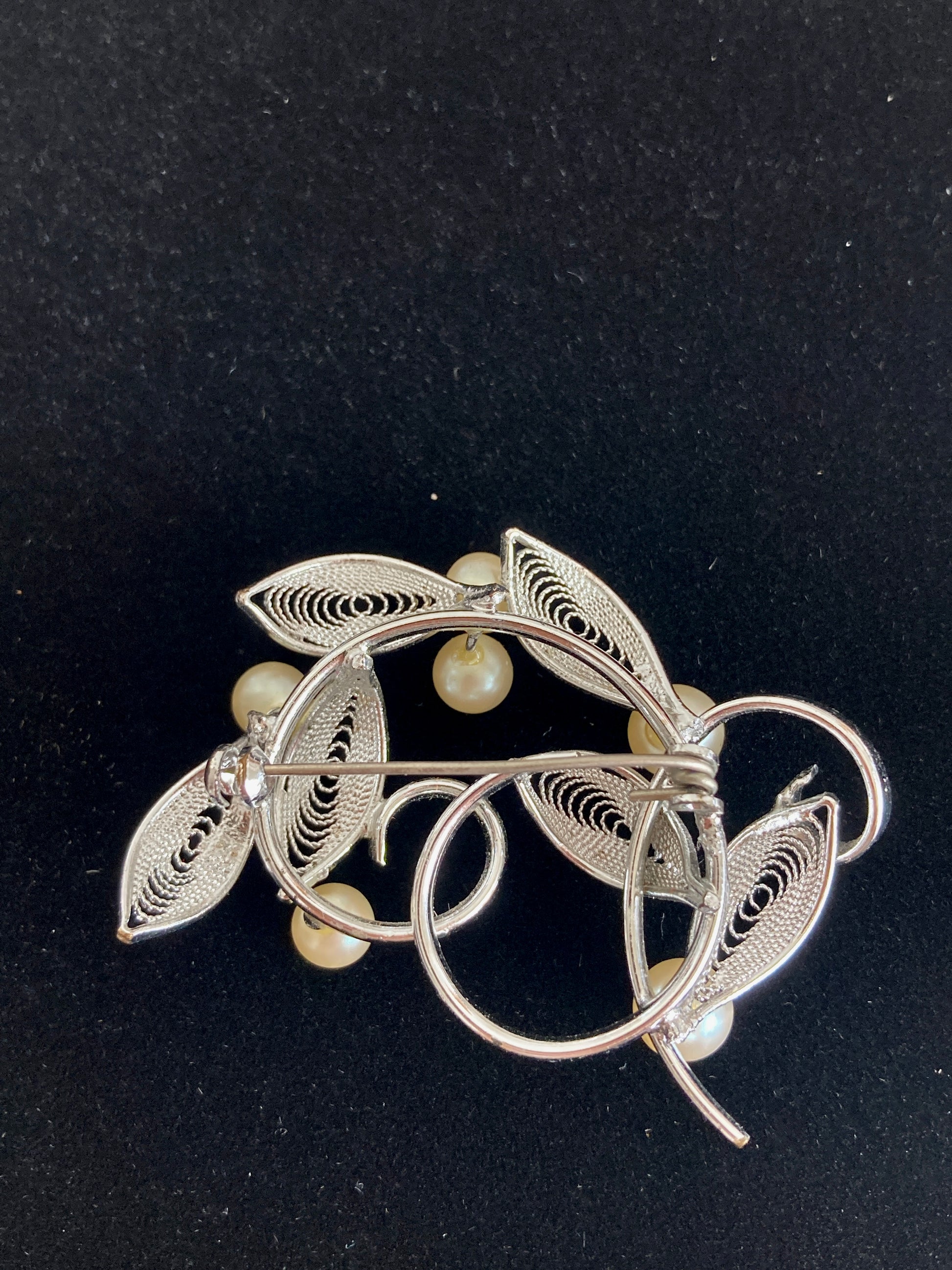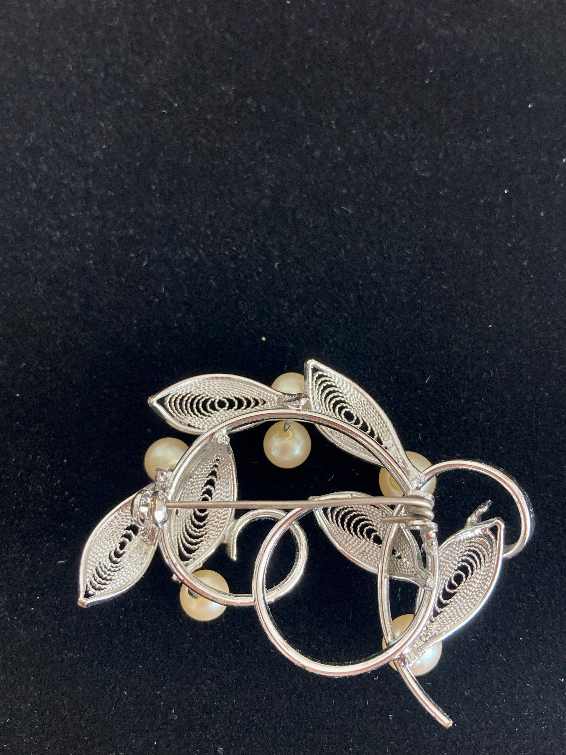 Vintage 1960s silver-tone wirework brooch with filigree style leaves punctuated by 6 faux pearls. The base is a swirl of stems set on a tension-based C clasp pinback. Unmarked and very lightweight with a bright silver plating.