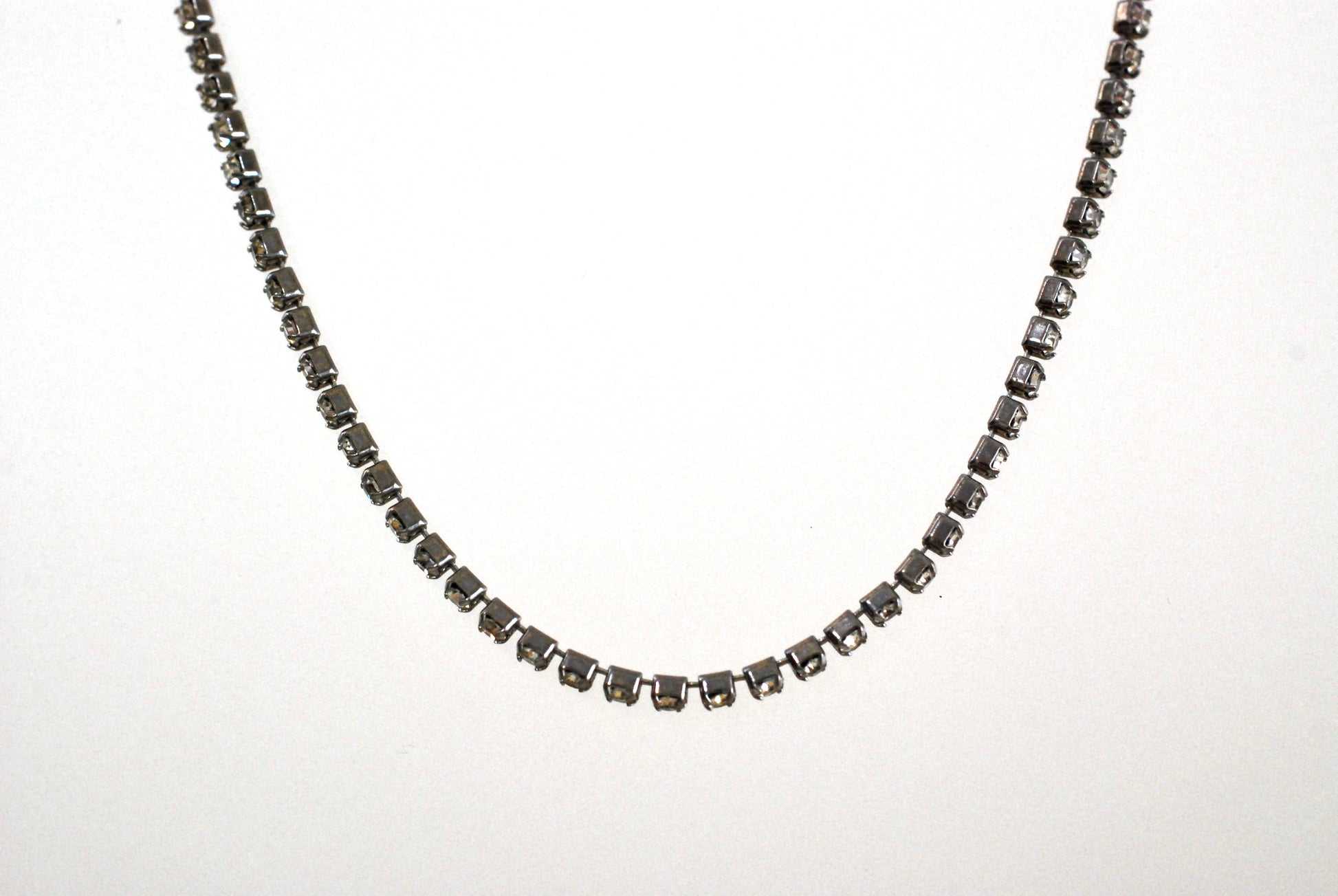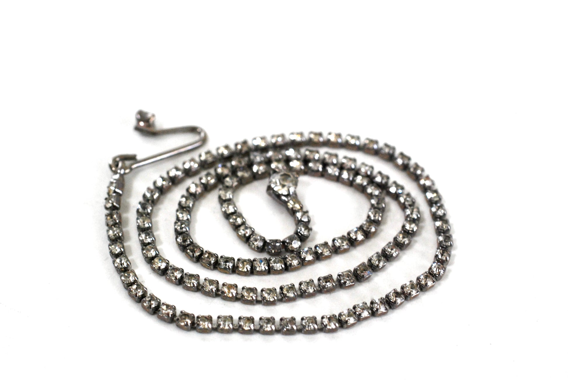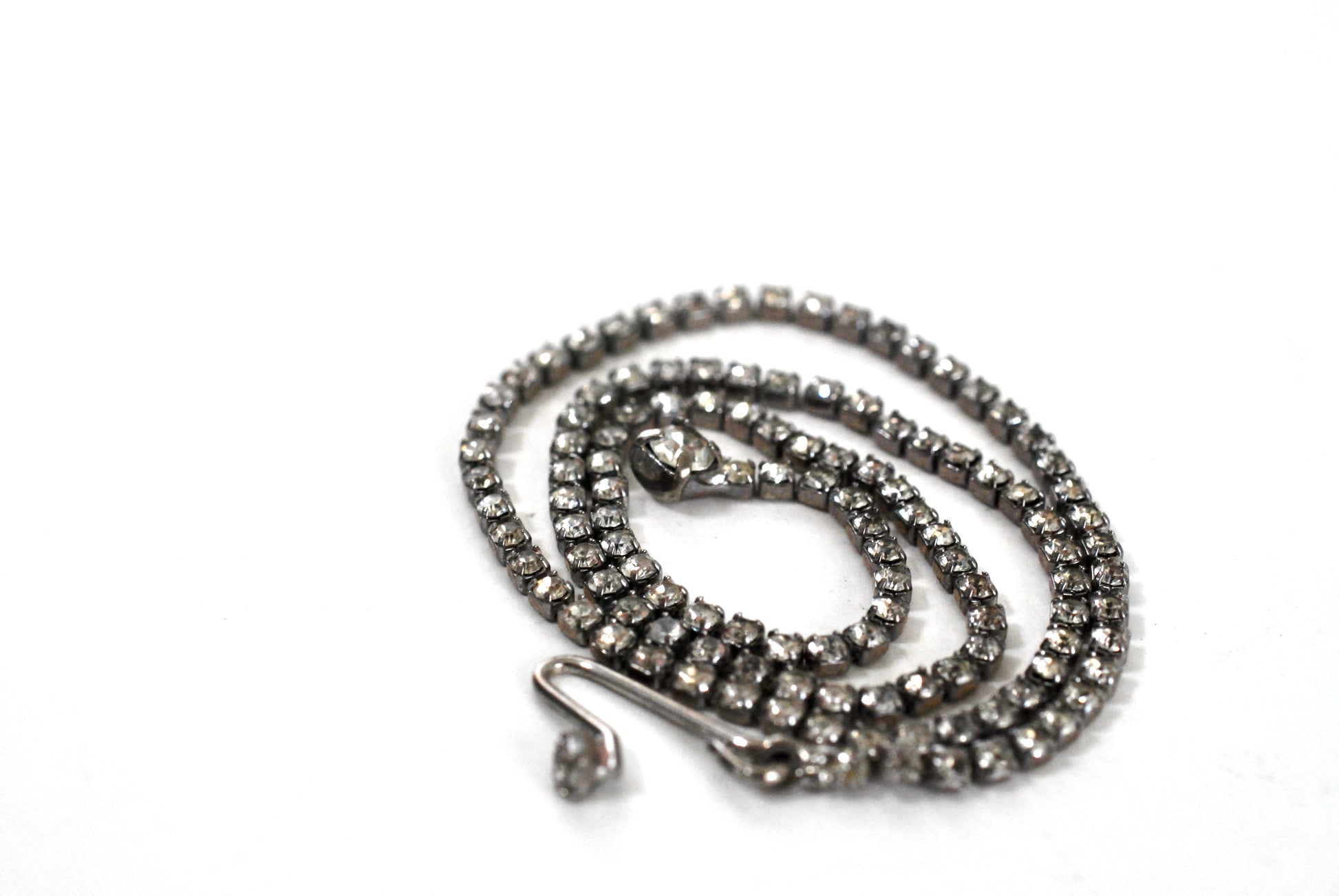 A sweet little bit of vintage. This tiny strand of vintage clear rhinestones is the perfect accessory to complete a romantic look. A single row of hinged stones encased in silver tone four prong settings. At each end there is a large single stone, one at the end of a silver tone hook, the other at the end of the chain.