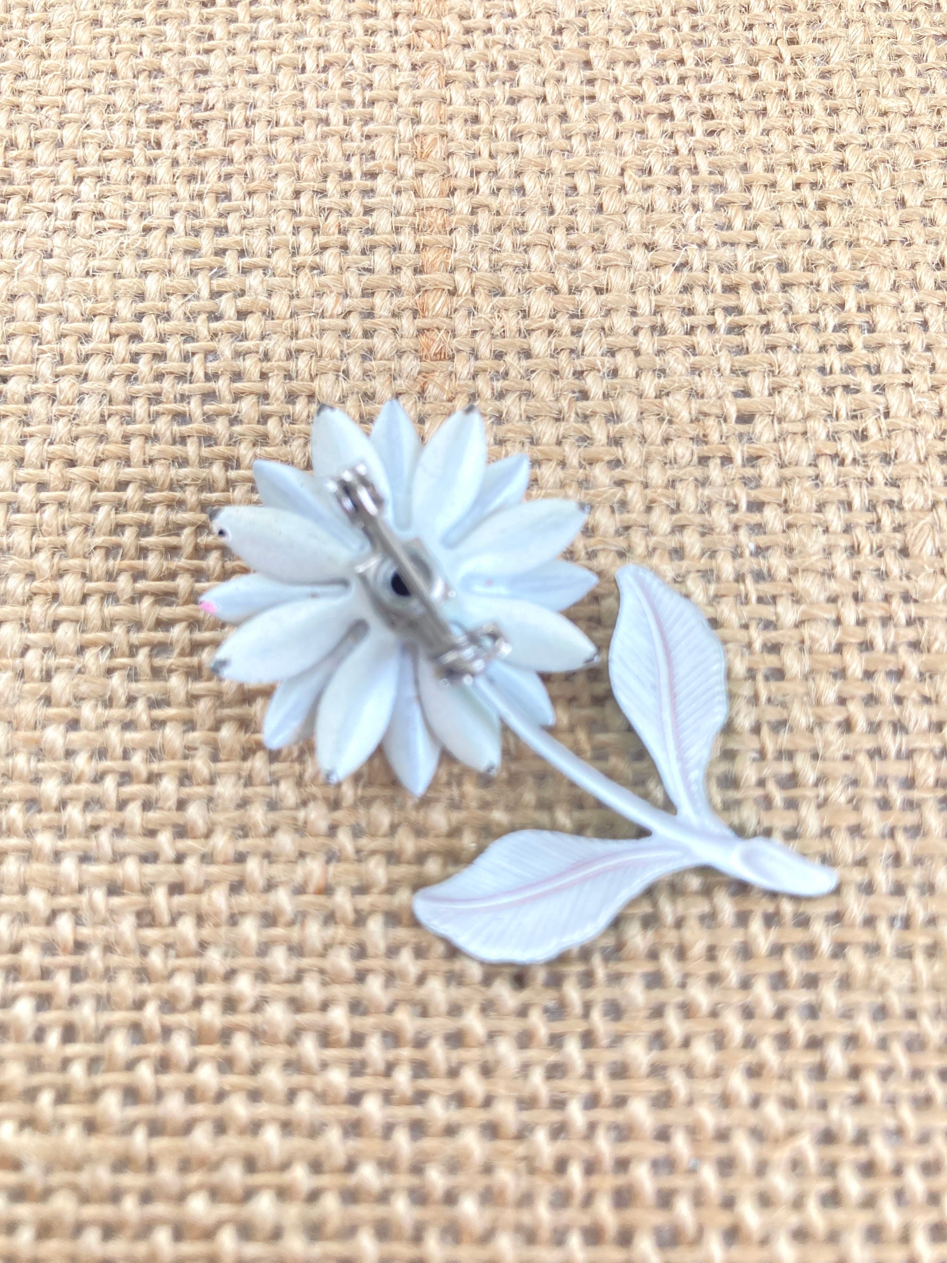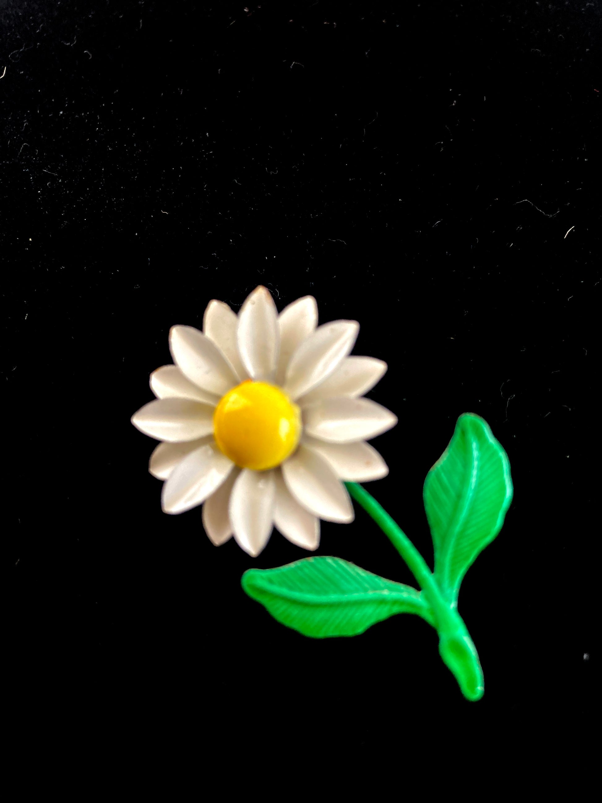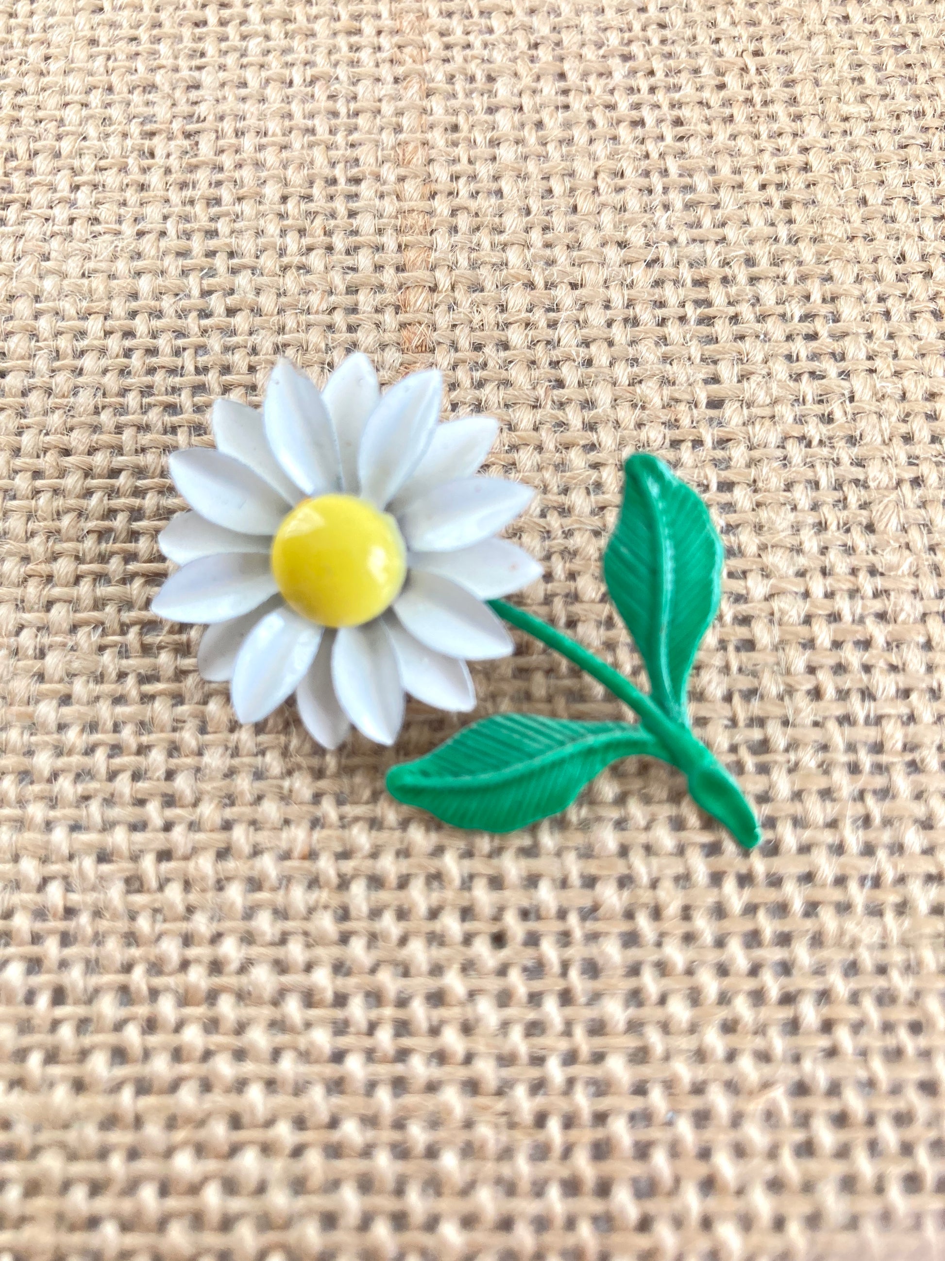 This cute 1960s vintage enamel pin has two green leaves set on a green stem and a single white daisy with a yellow center. Its diminutive size makes it perfect for adding to a grouping of brooches, worn alone on the pocket of a pair of jeans, or adorning a fun hat. It would even look cute on a backpack or purse. It has a secure roll-over clasp at the center of the daisy. In excellent condition with no markings and very minor signs of wear on the back tips of a few petals.