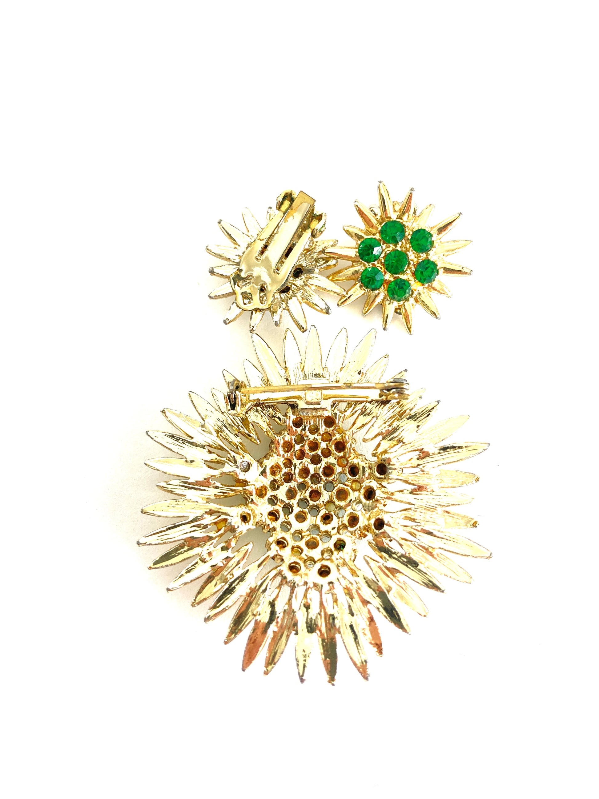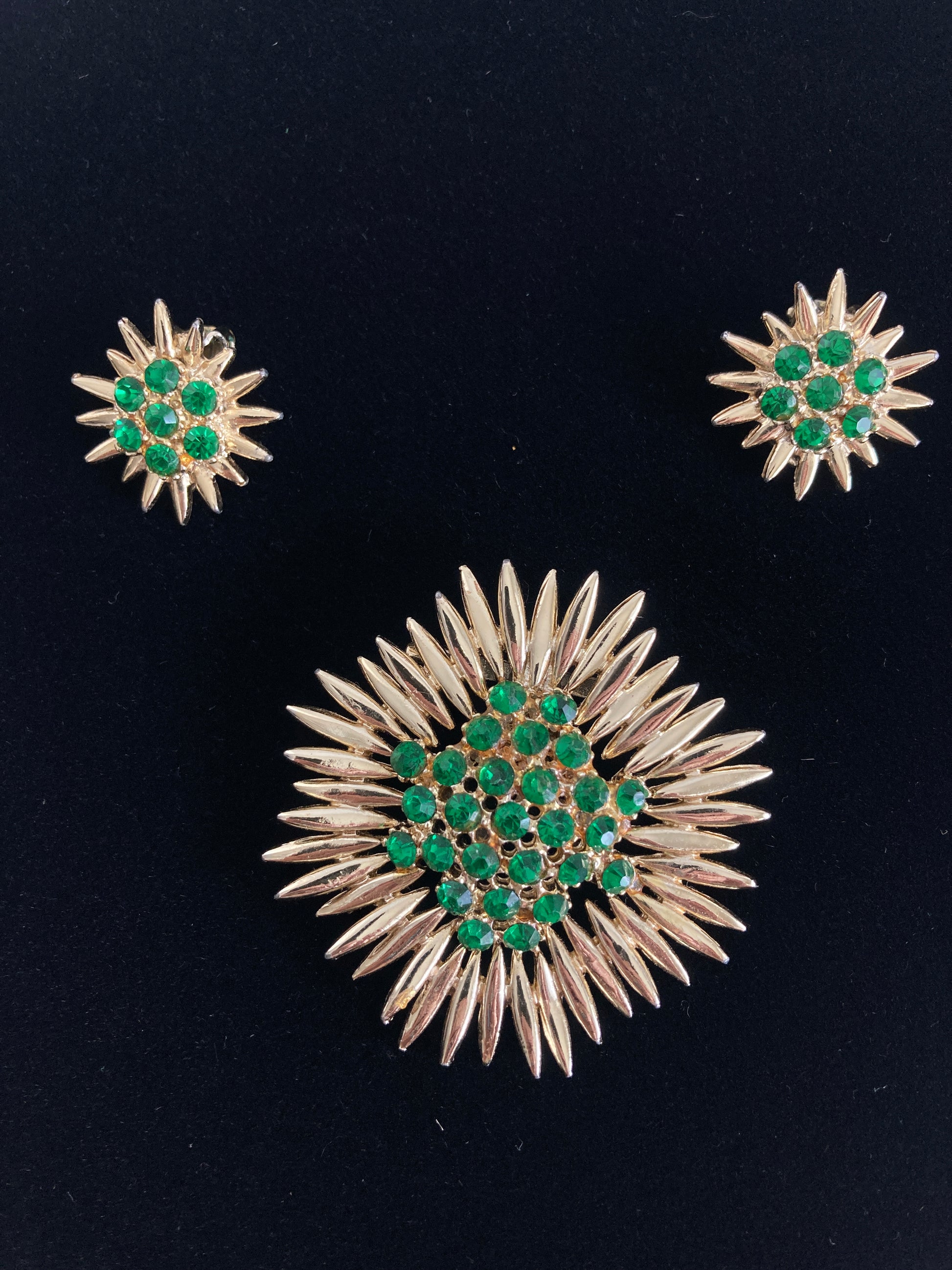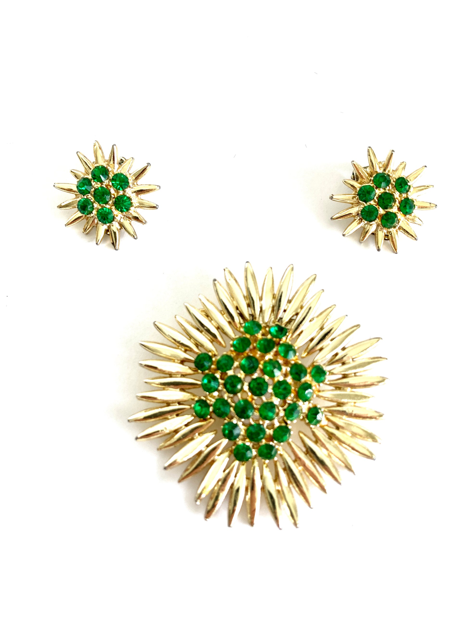 Vintage 1960s set of earrings and matching brooch in gold plated metal with bright green rhinestones. The brooch features a multitude of stones in the center with narrow spiked petals giving it a floral effect while the earrings have a centerpiece of stones and wider spaced spiked petals. The earrings are clip-on style. The stones are set on open backs allowing the light to filter through. None of the pieces are marked and they show no signs of wear. A lovely set that would make a wonderful gift.