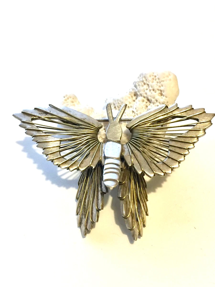 Stunning signed sterling silver modernist butterfly brooch. This beautiful piece is three dimensional and fabulous in its detail. The wings appear to be hand cut and are hand wired to form a delicate yet bold contemporary looking brooch. The back is marked 925, Mexico, and signed TC-189. T refers to items made in Taxco while C would refer to the first letter of the makers last name and 189 refers to the registration of the silversmith in the city assay office. This piece was very likely produced in the 1980s as tourist jewelry. It would make a lovely gift for someone who enjoys silver jewelry, butterflies or both.