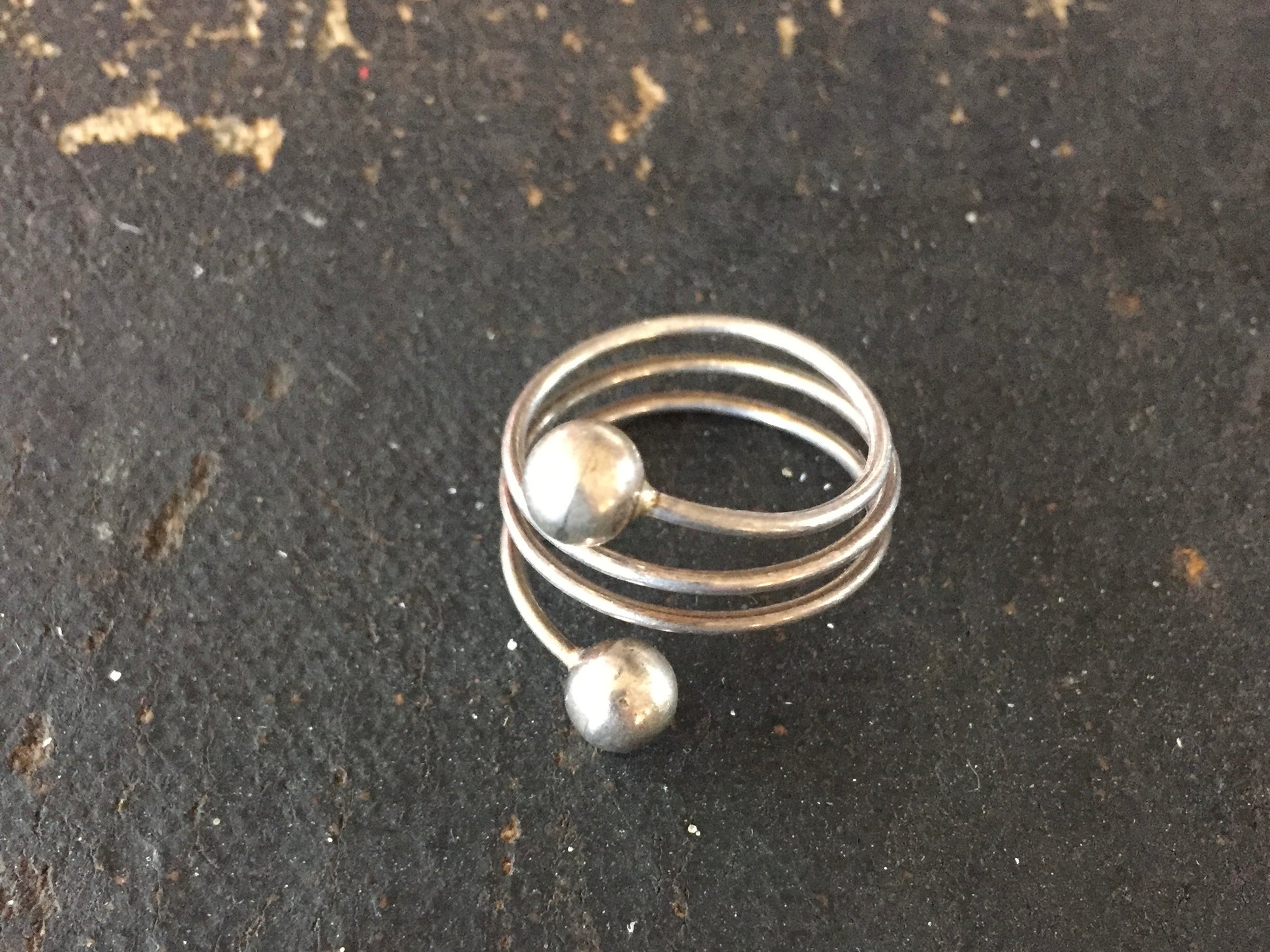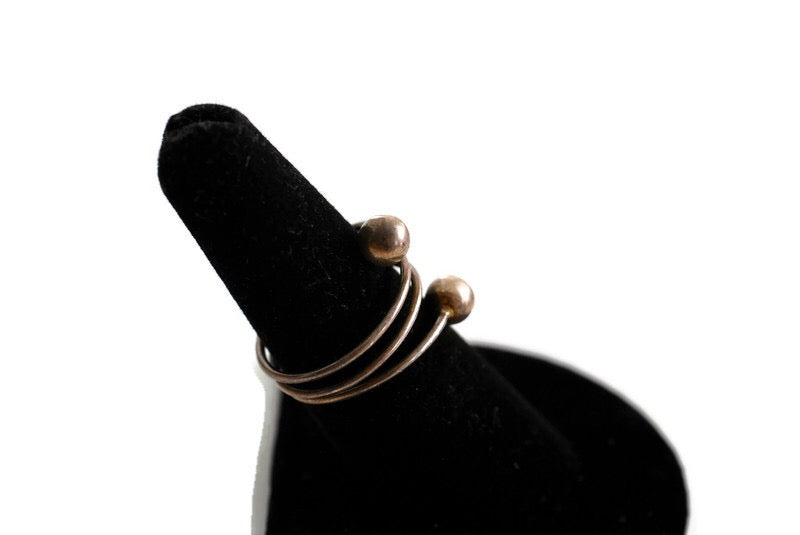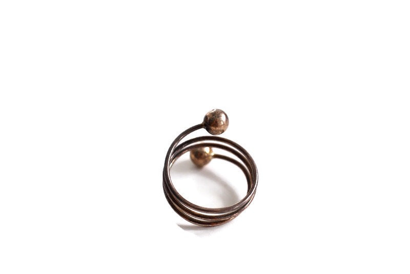 Modern design with a great patina, this sterling silver coiled wire ring is so simple and elegant. It features triple coiled wire with ball ends making it light as a feather. Perfect to stack or wear as a midi ring.
