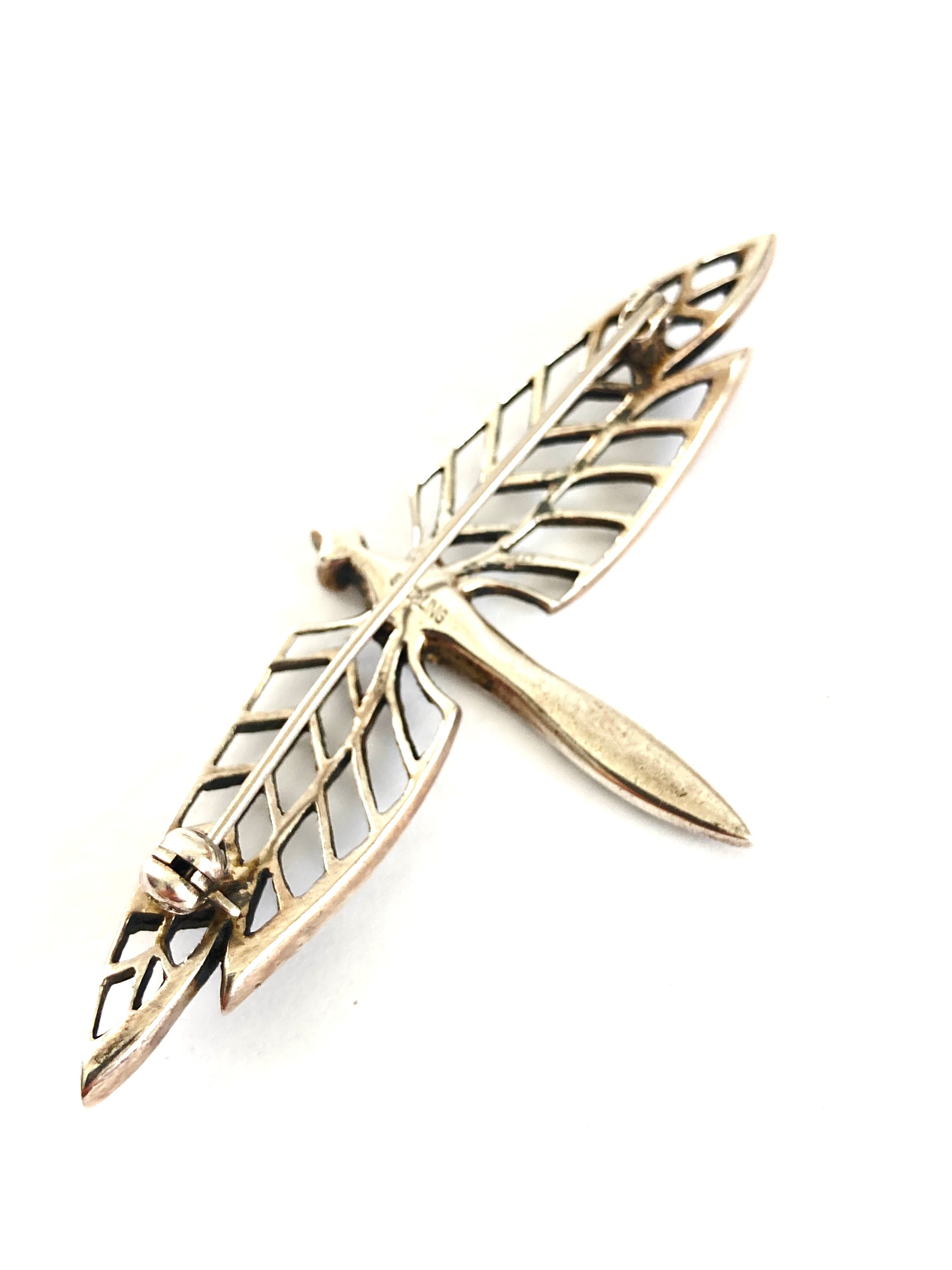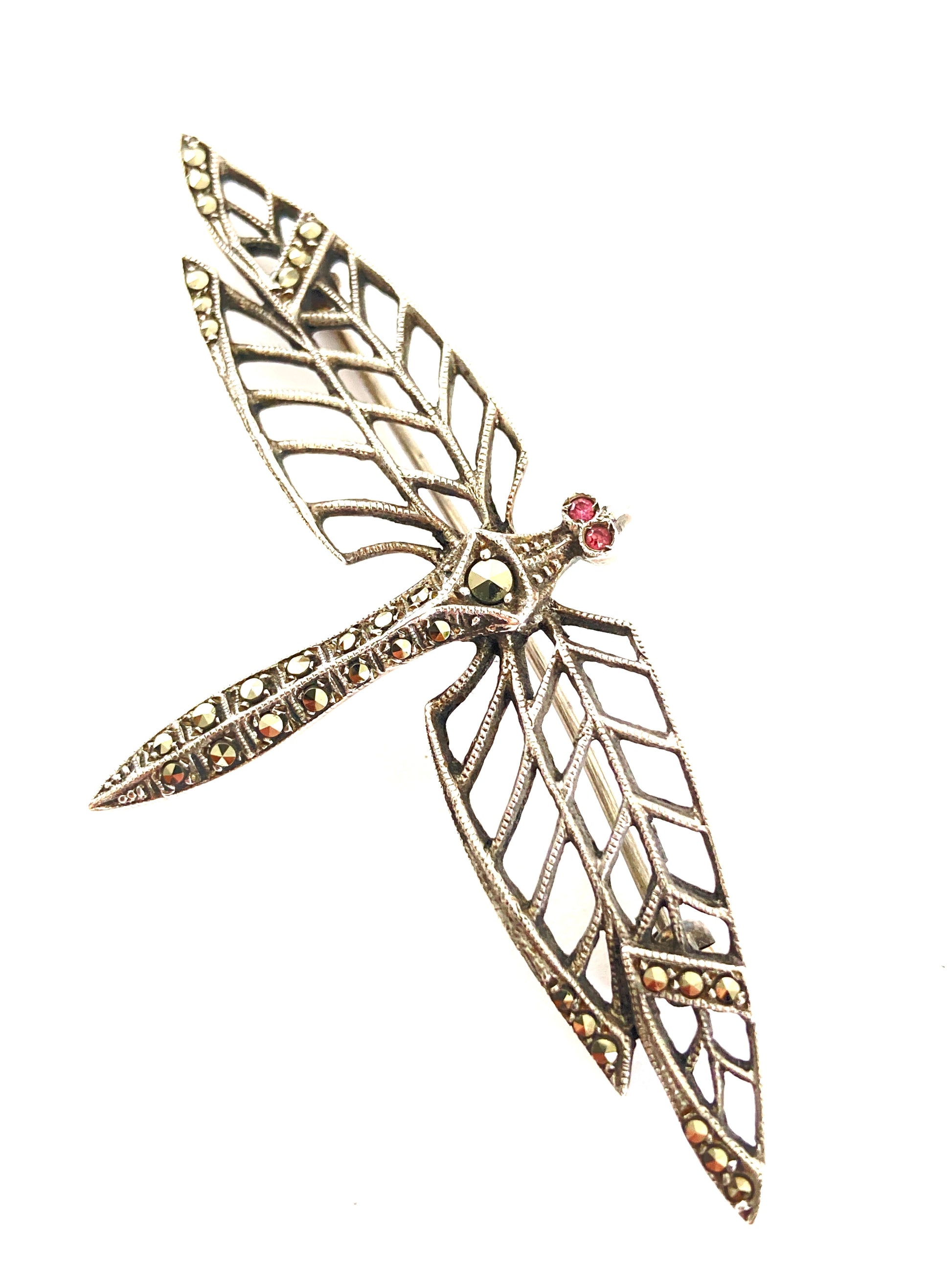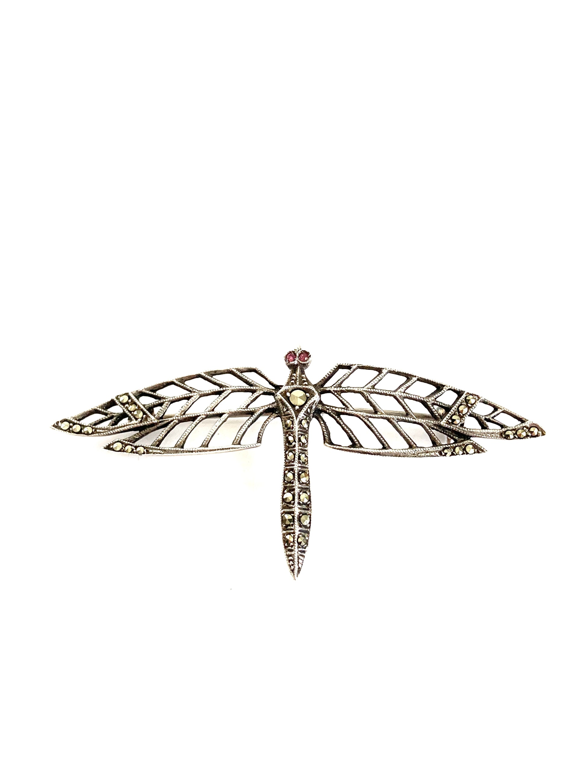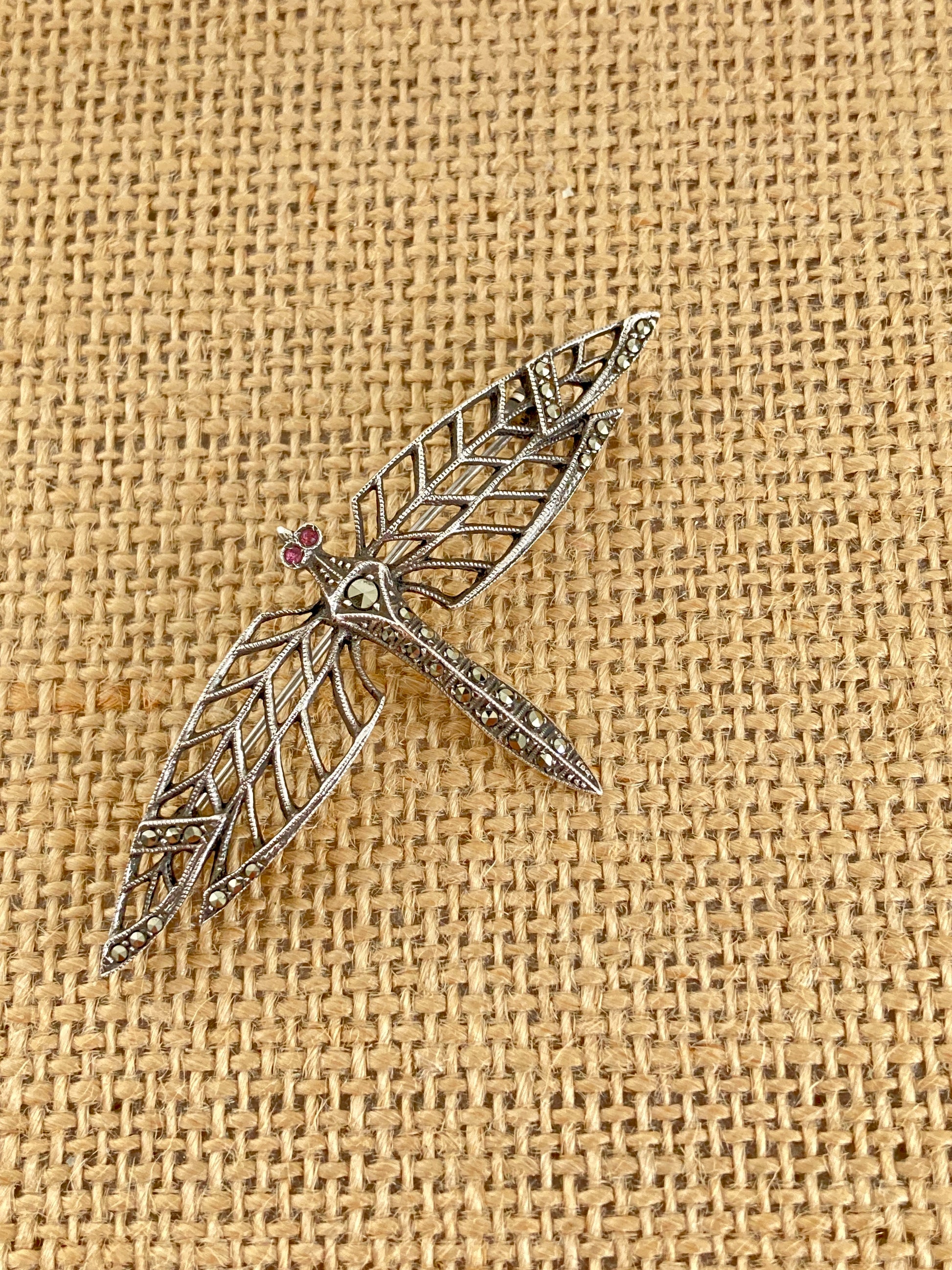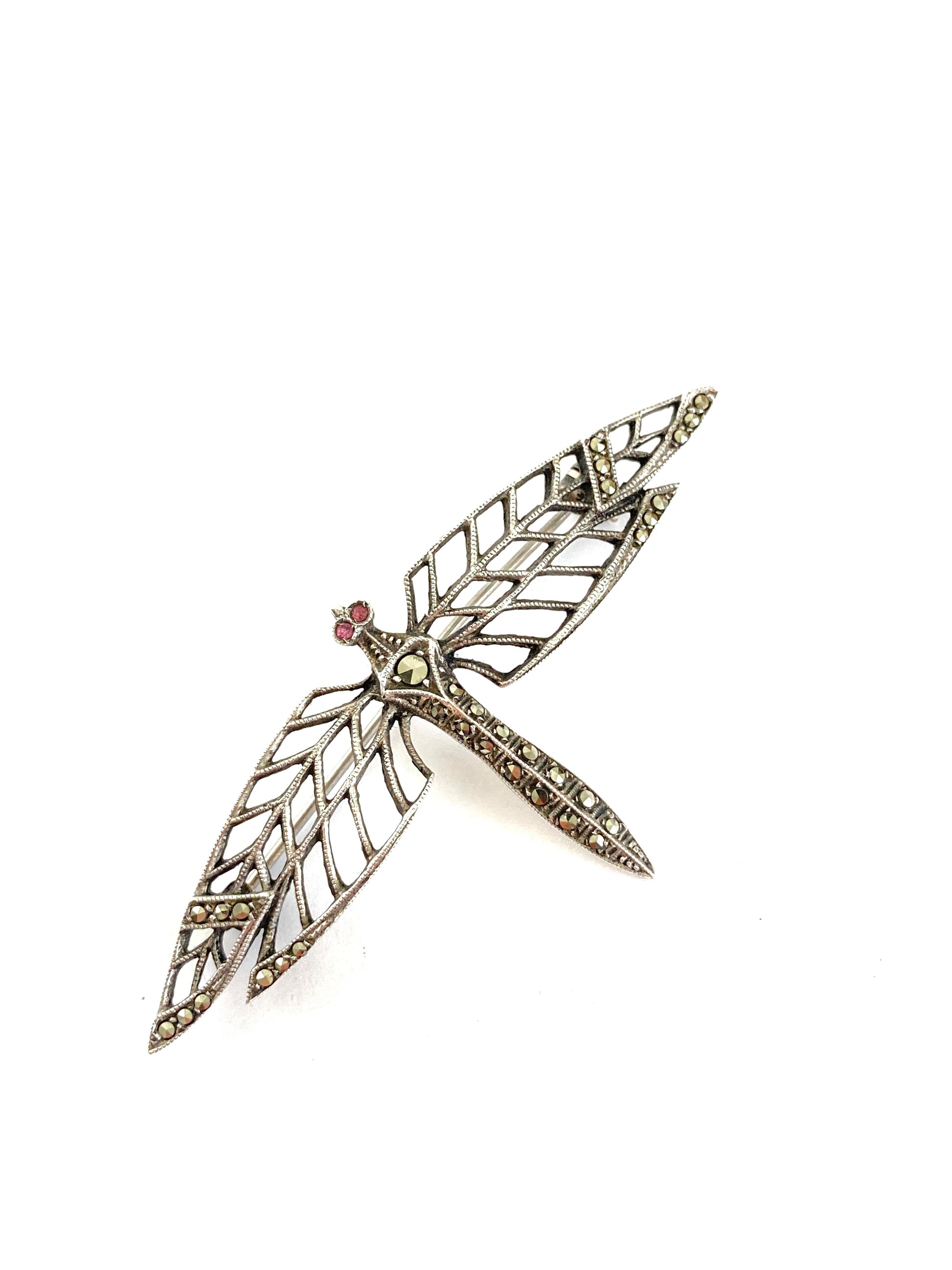 Here's an unusual take on a Dragonfly brooch. The styled look of the wings is very Art Deco looking. Purchased from the estate of a world traveler and collector. The brooch is marked Sterling on the back but is unsigned. It's beautifully made and the marcasite stones shine brilliantly as do the tiny ruby eyes. Very clearly handmade as both wings sit at slightly different angles and each of the veins is just a bit different. An overall gorgeous piece in excellent condition.